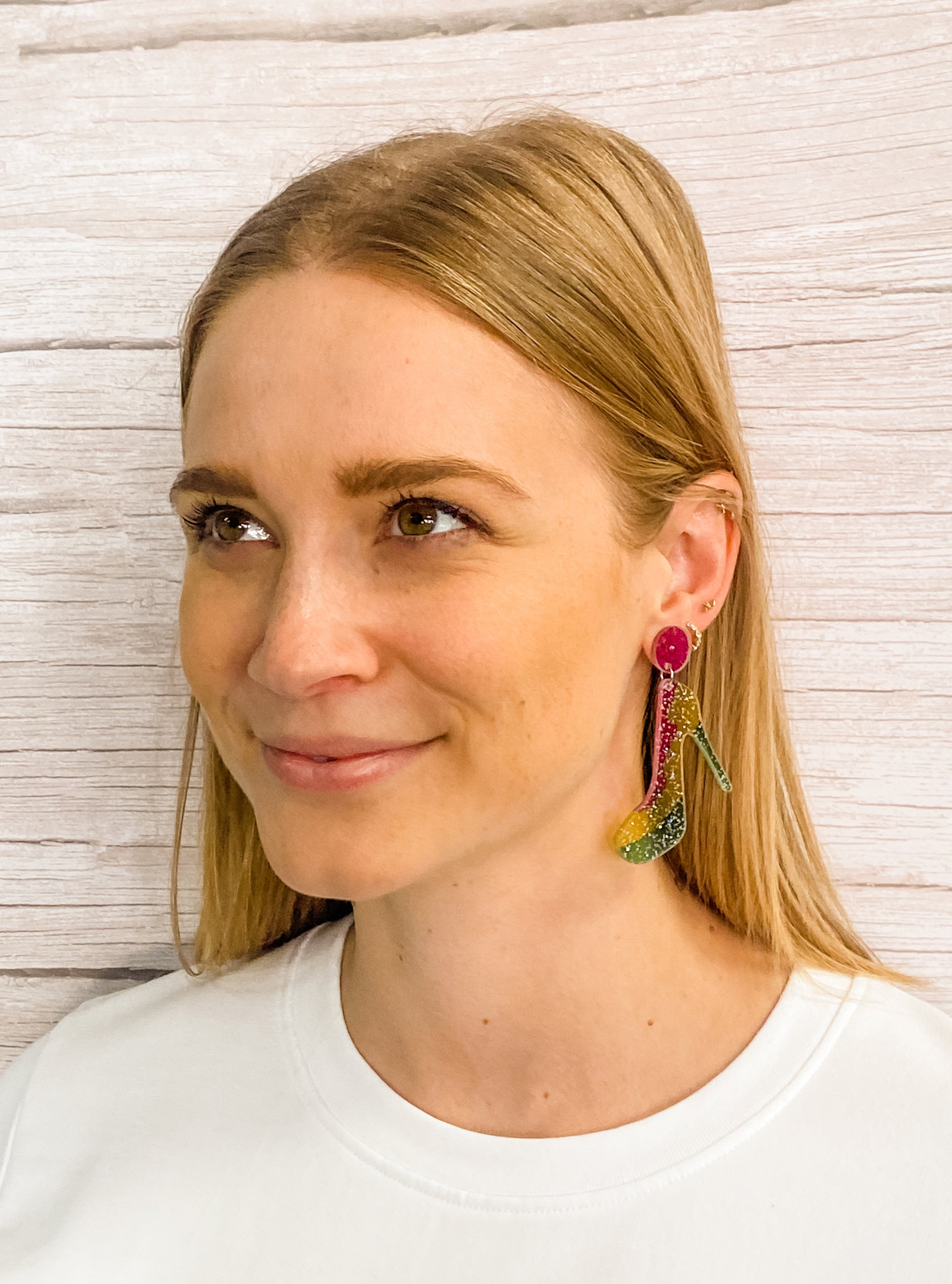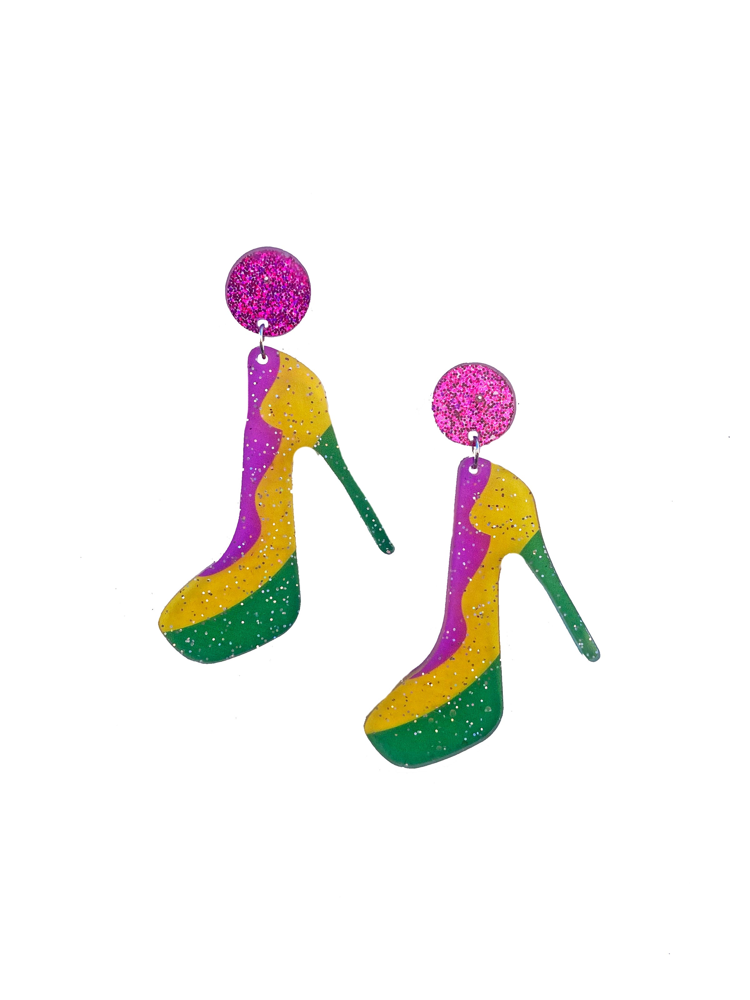 These bold acrylic high heel earrings are the perfect accessory for your Mardi Gras celebration or Muses parade! With eye-catching purple, green, and gold color combinations, they'll make you stand out in any parade!