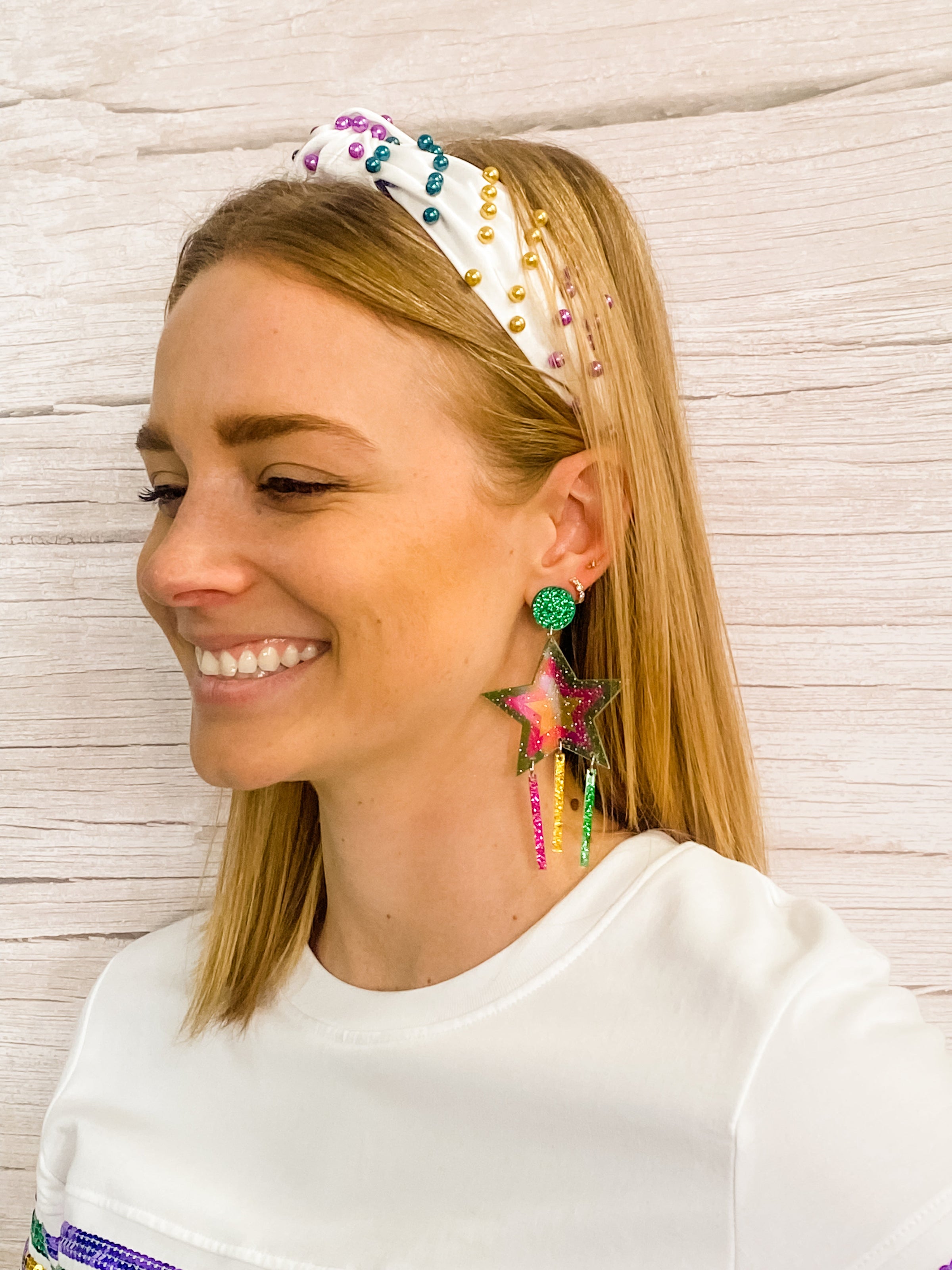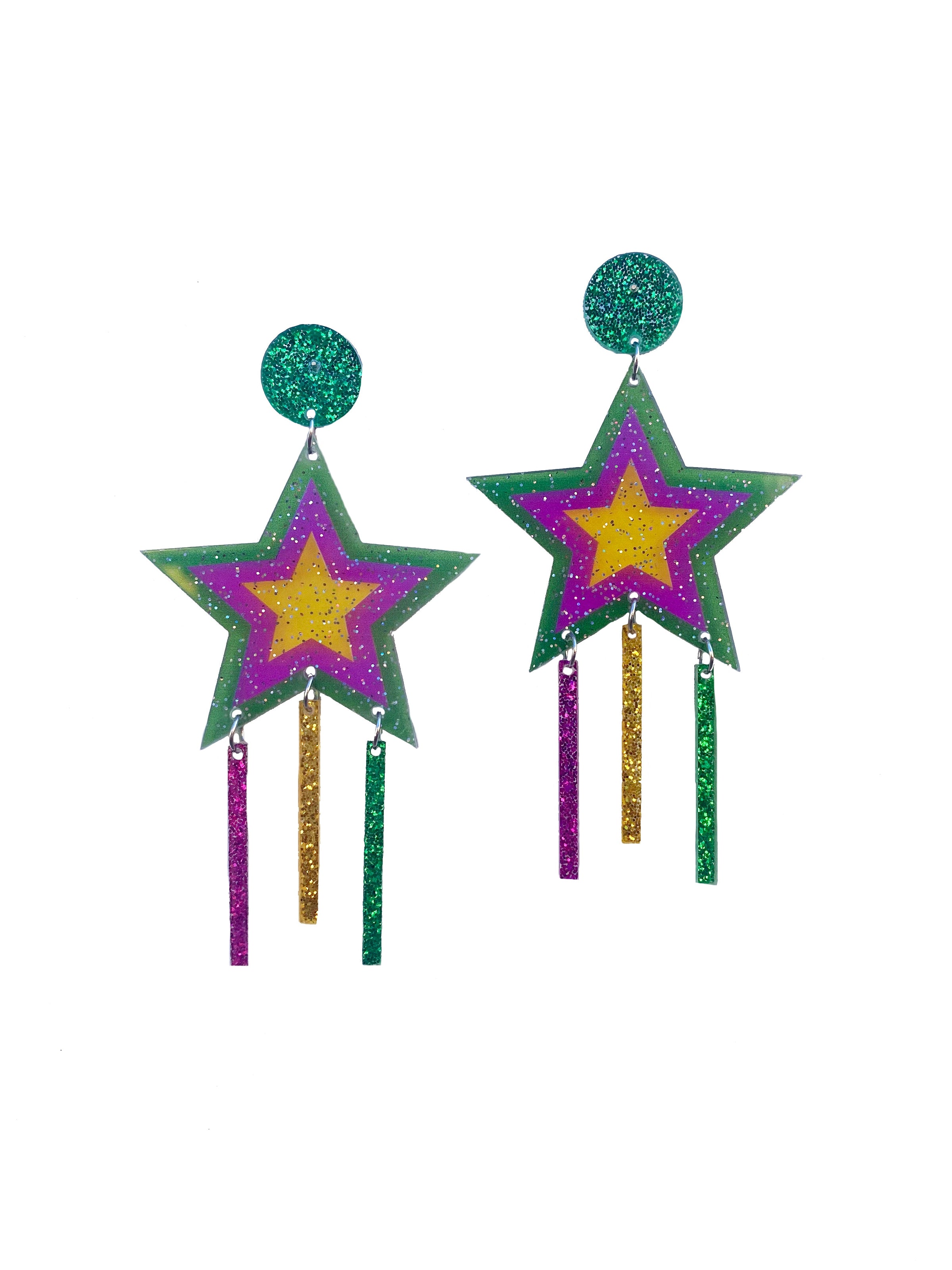 These bold acrylic shooting star earrings are the perfect accessory for your Mardi Gras celebration or parade! With eye-catching purple, green, and gold color combinations, they'll make you stand out in any parade!