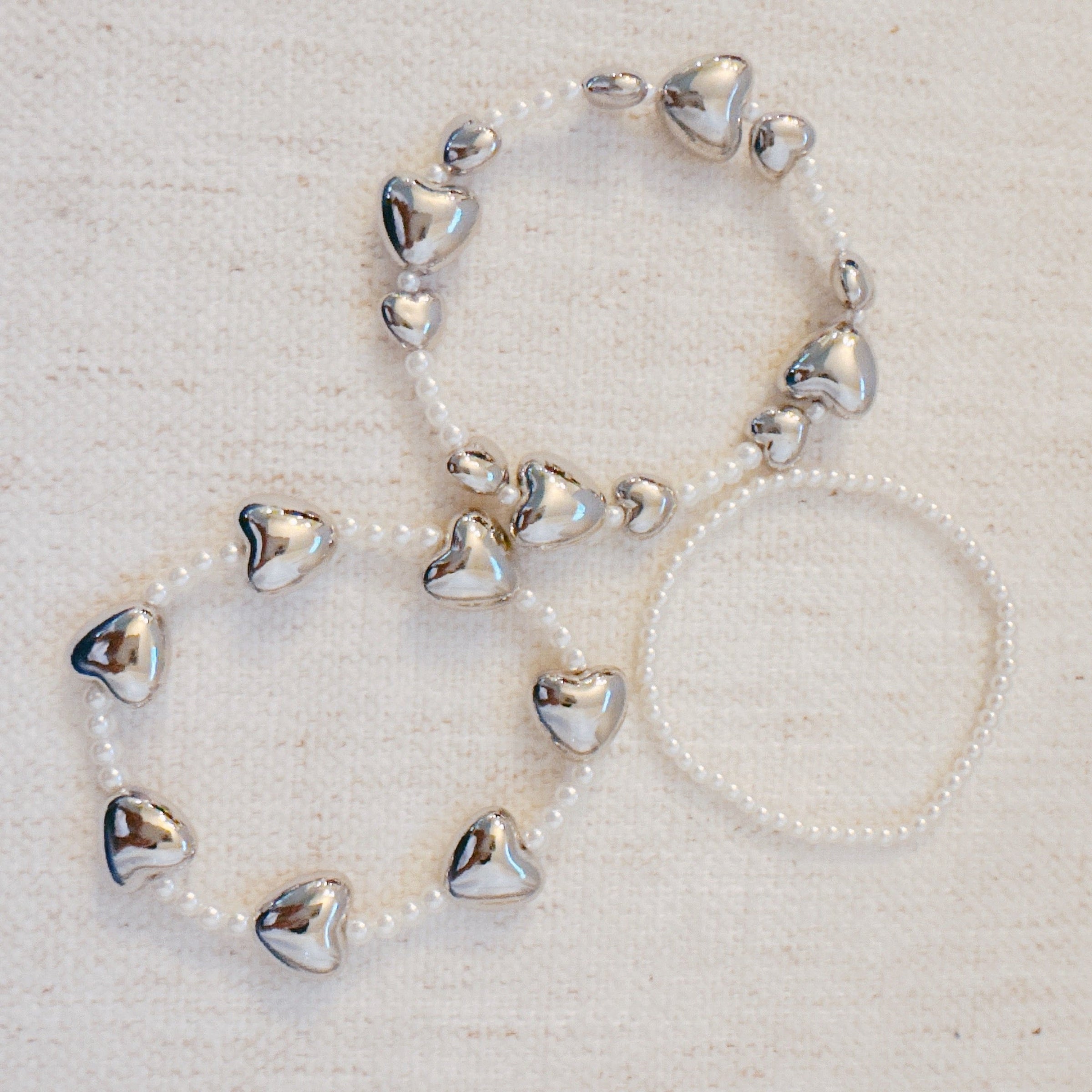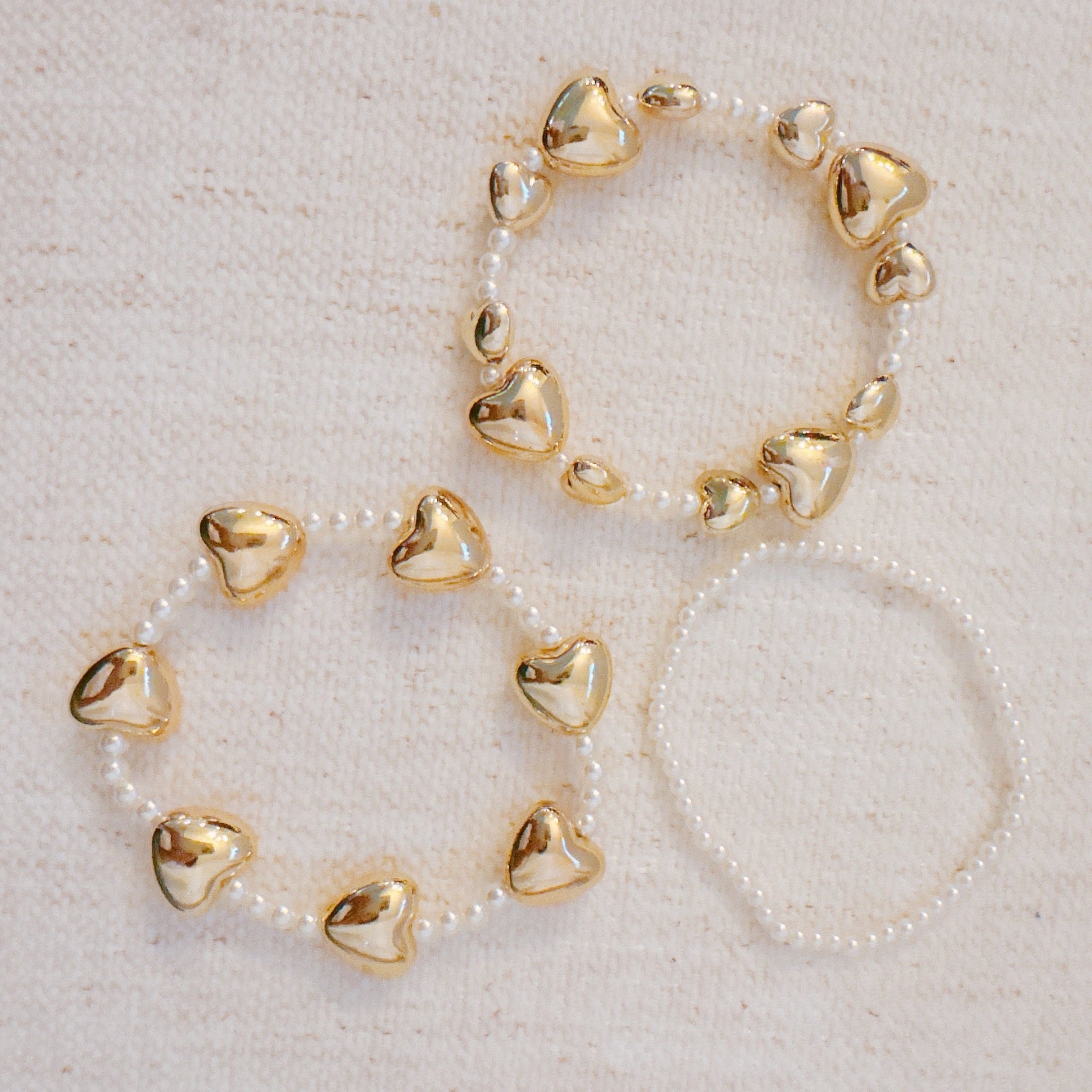 This set features a combination of one delicate pearl beads bracelet and two pretty puffy golden hearts bracelets. Versatile and perfect for layering, elevate any outfit with this exclusive set.