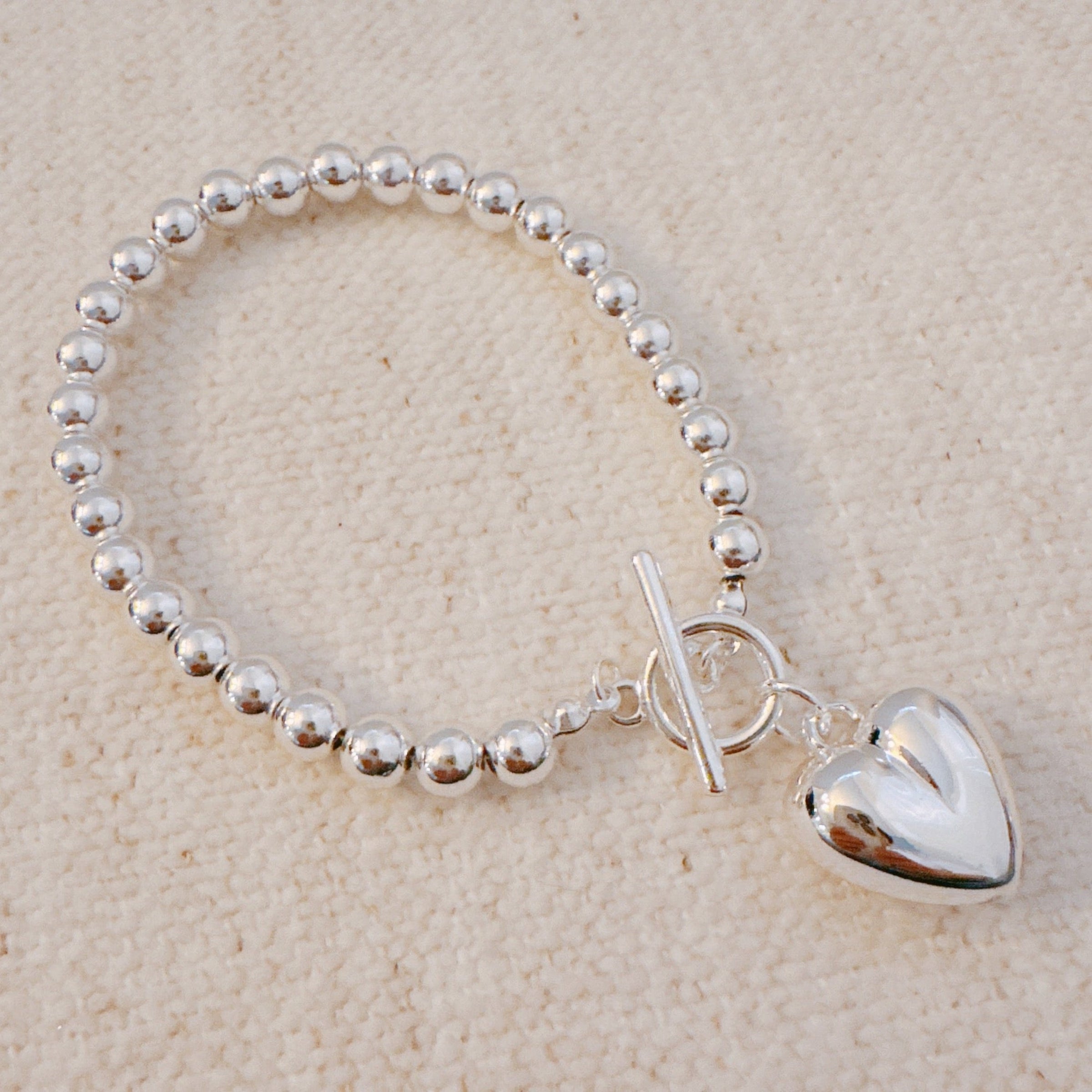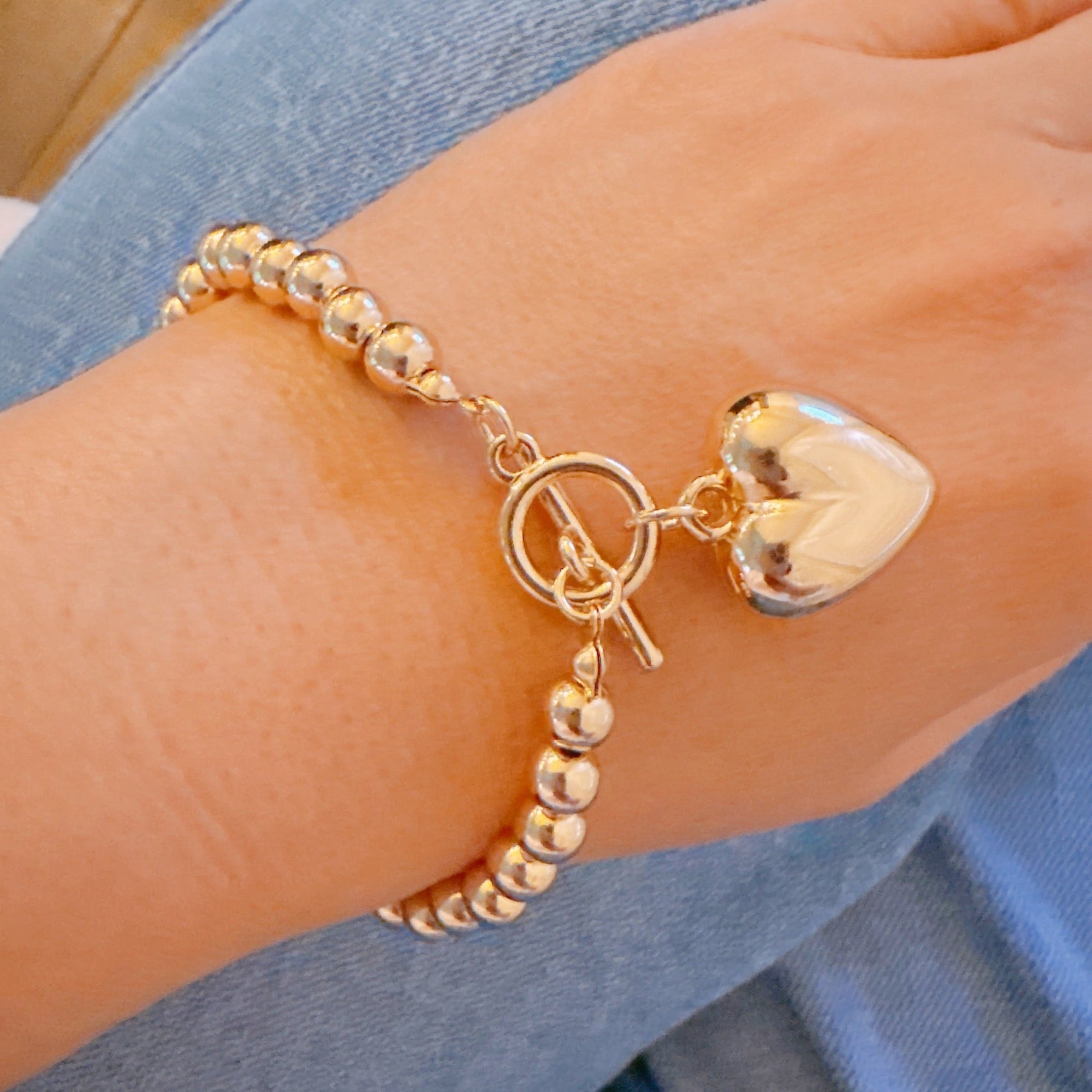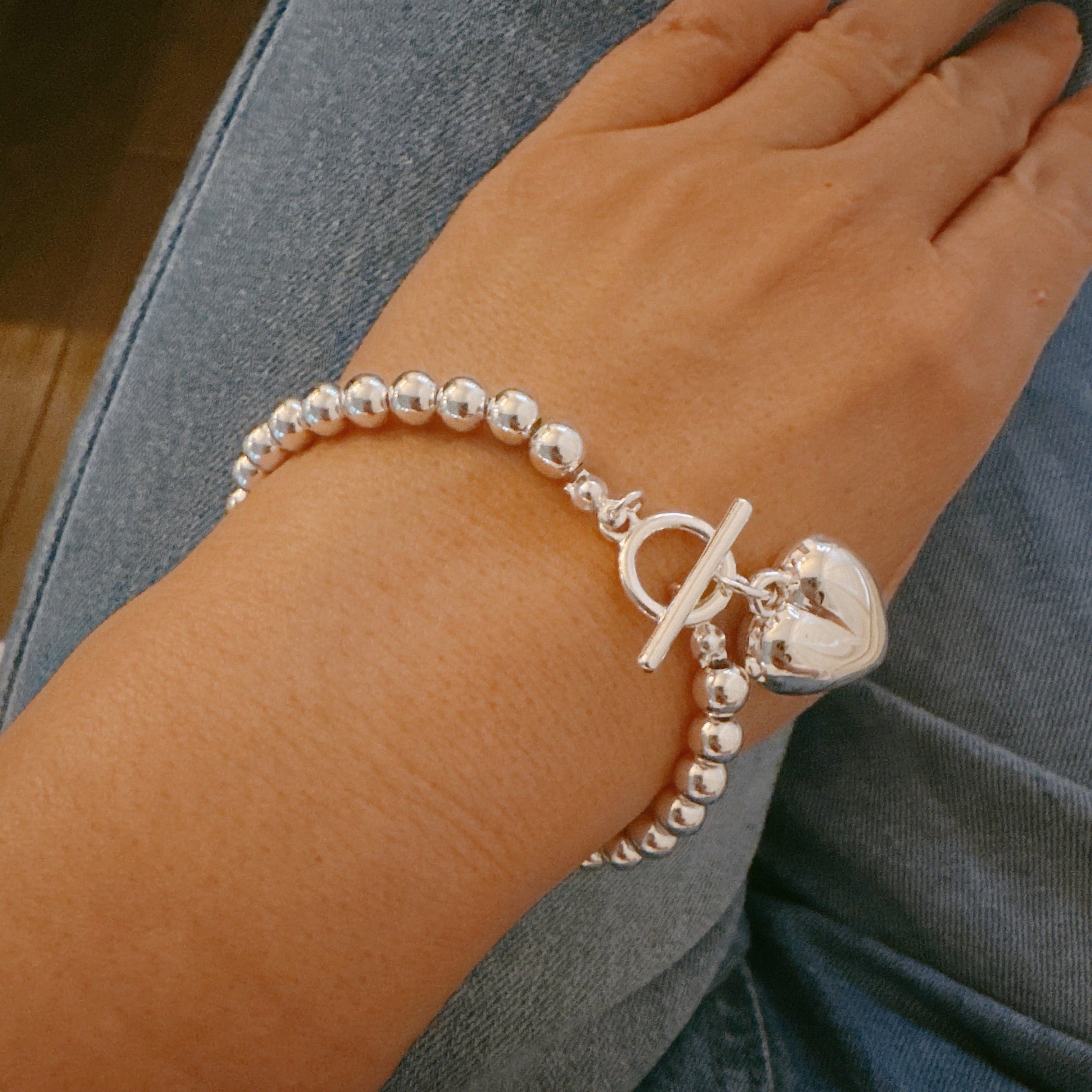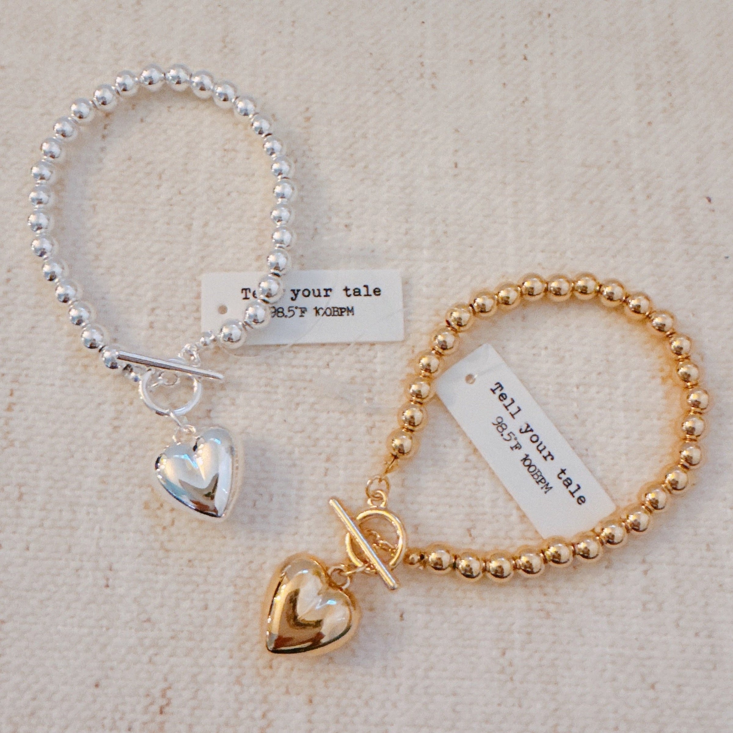 This bracelet has a modern ball bead design that effortlessly adds a trendy touch, while the lovely dangle heart adds a romantic flair. Experience the perfect blend of contemporary and classical styles.