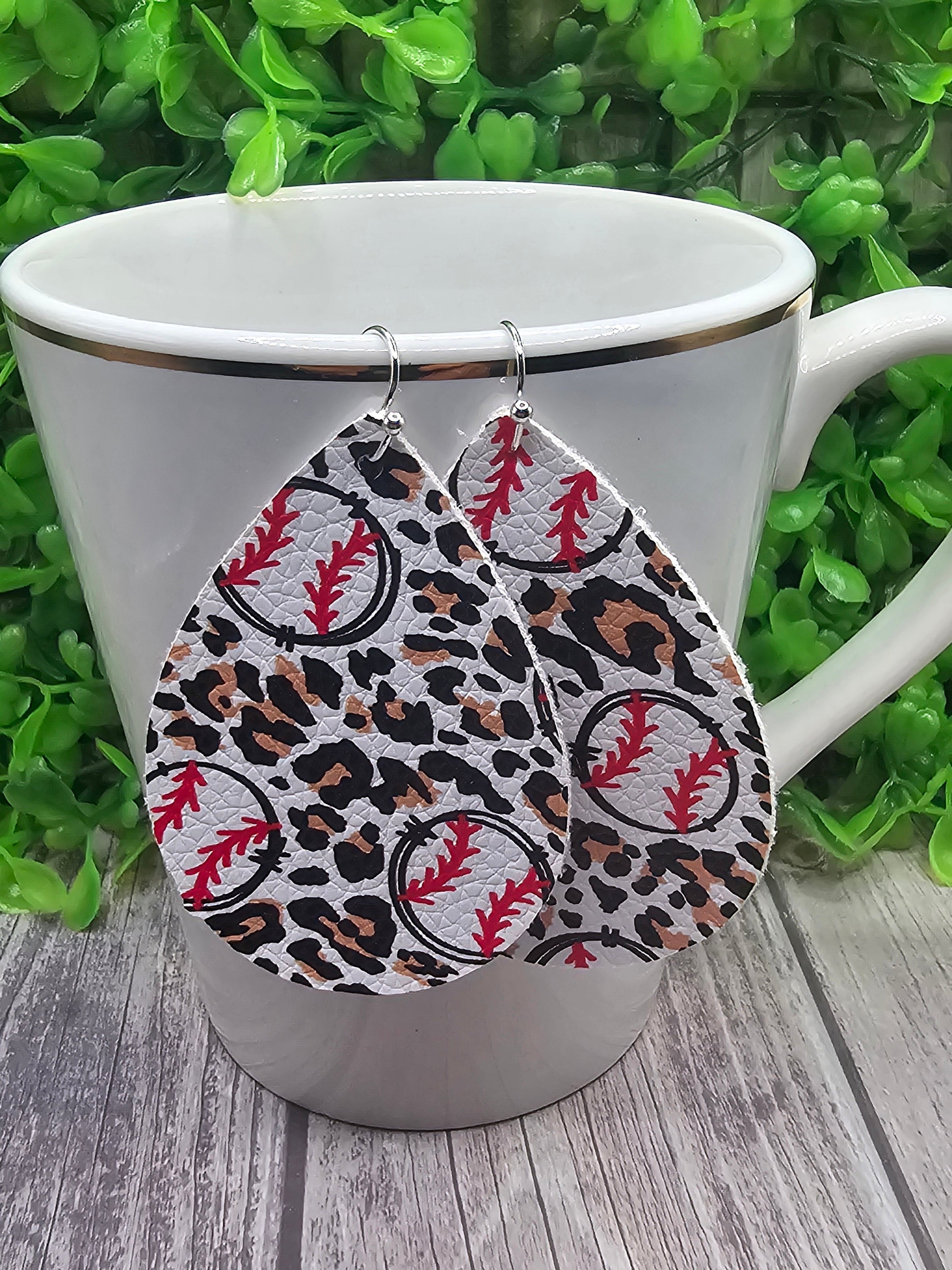 Baseball on Leopard || Faux Leather Teardrop Dangle Earrings || Single-Sided