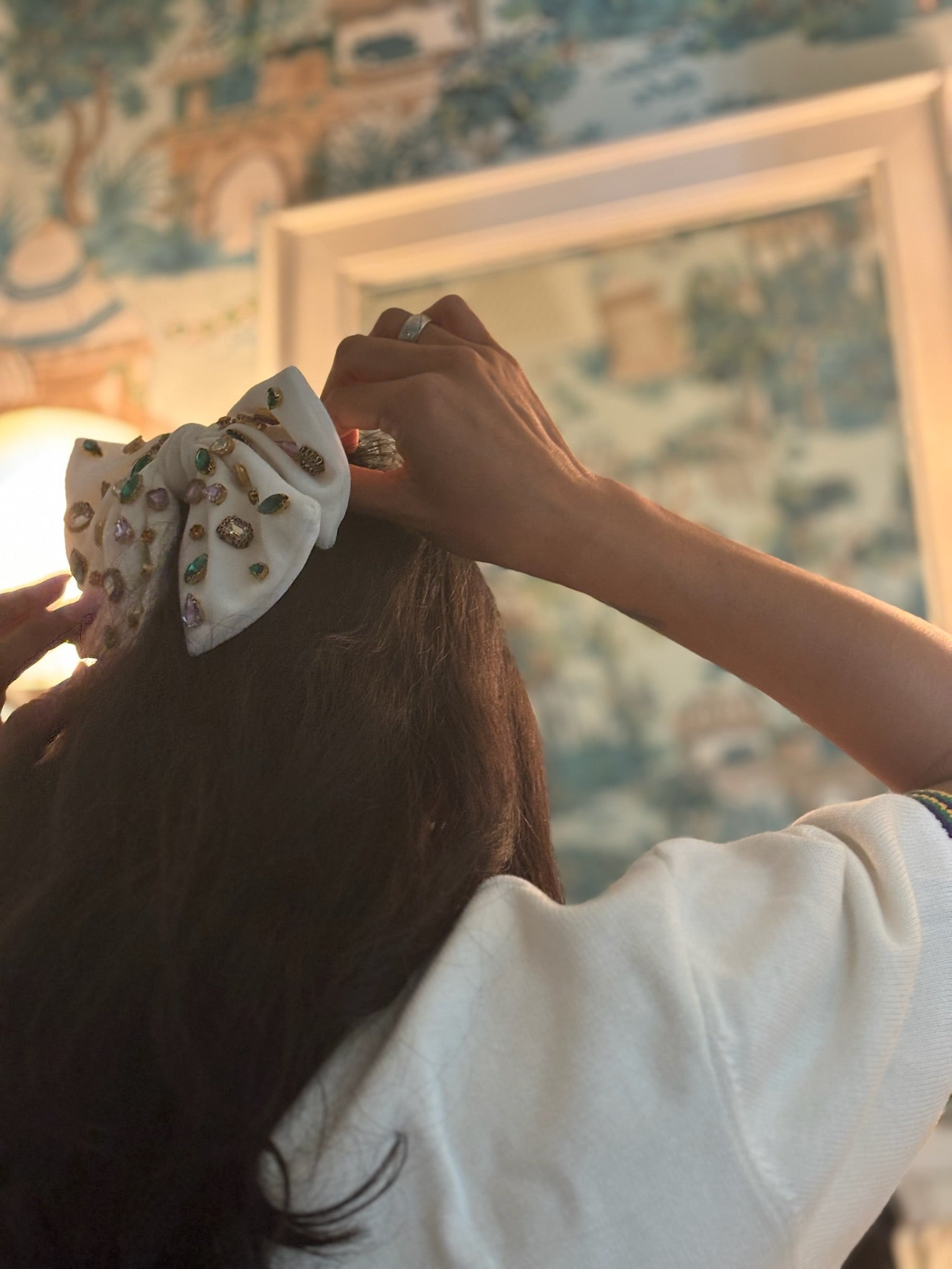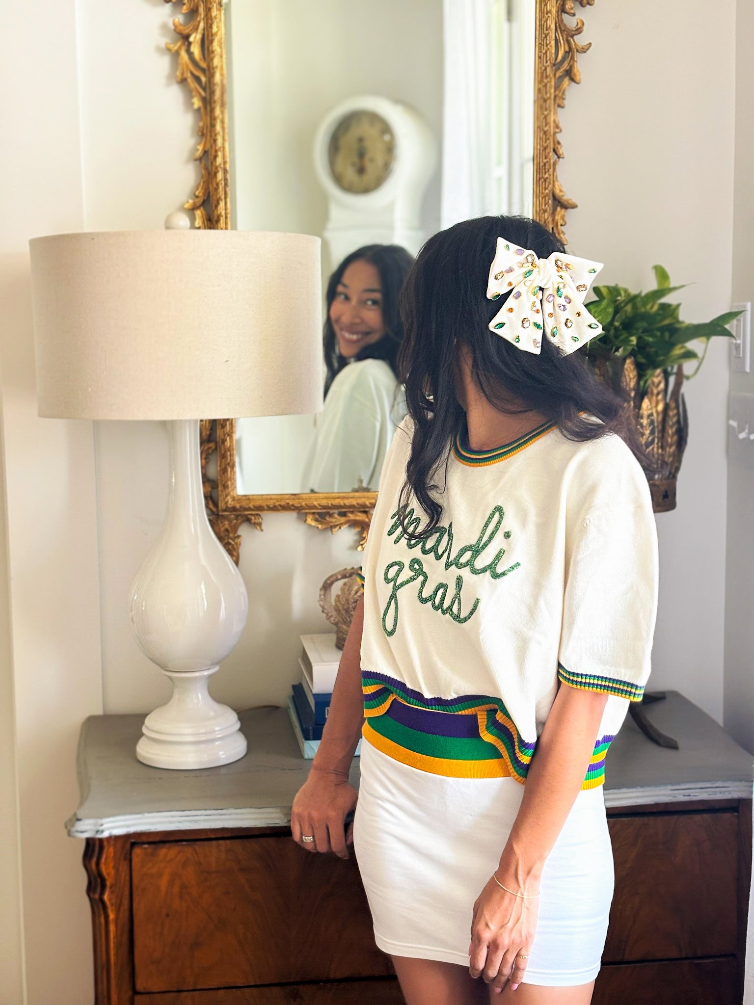 Add some sparkle to your hair with our Bejeweled Velvet Bow! Made with luxurious velvet and adorned with purple, green, and gold jewels, this hair bow is perfect for adding a touch of Mardi Gras to any outfit. The metal clip and silicone grip ensure it stays securely in place. Let your hair shine with this playful accessory.