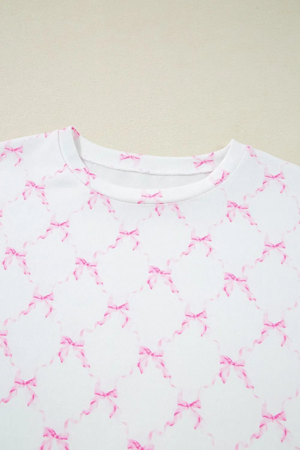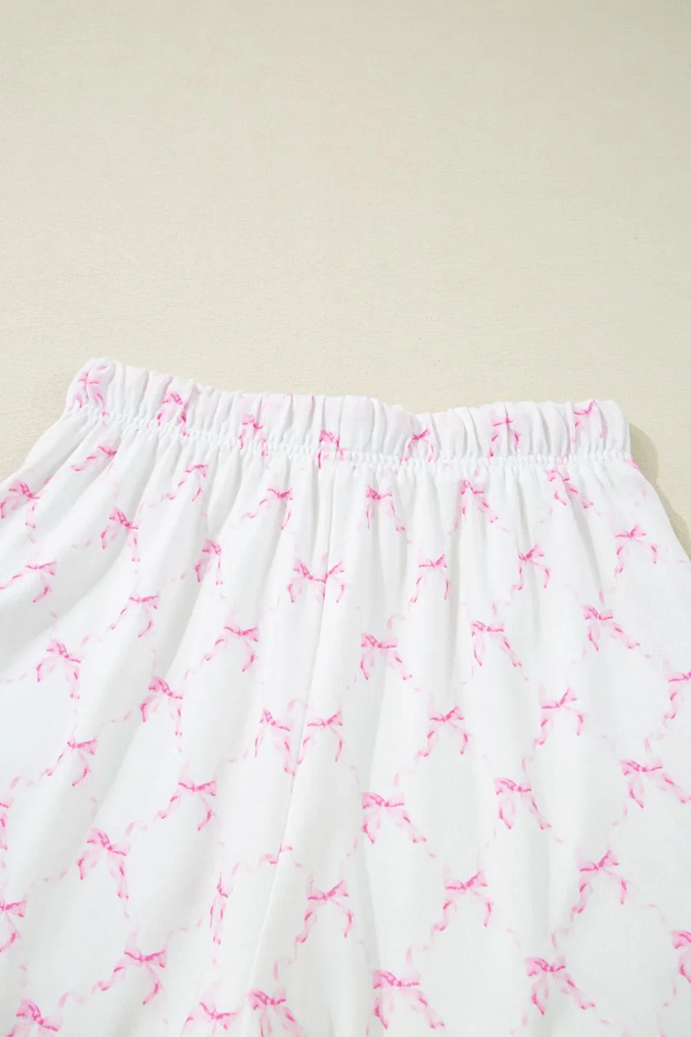Bow Print Lettuce Trim Round Neck Top and Shorts Lounge Set