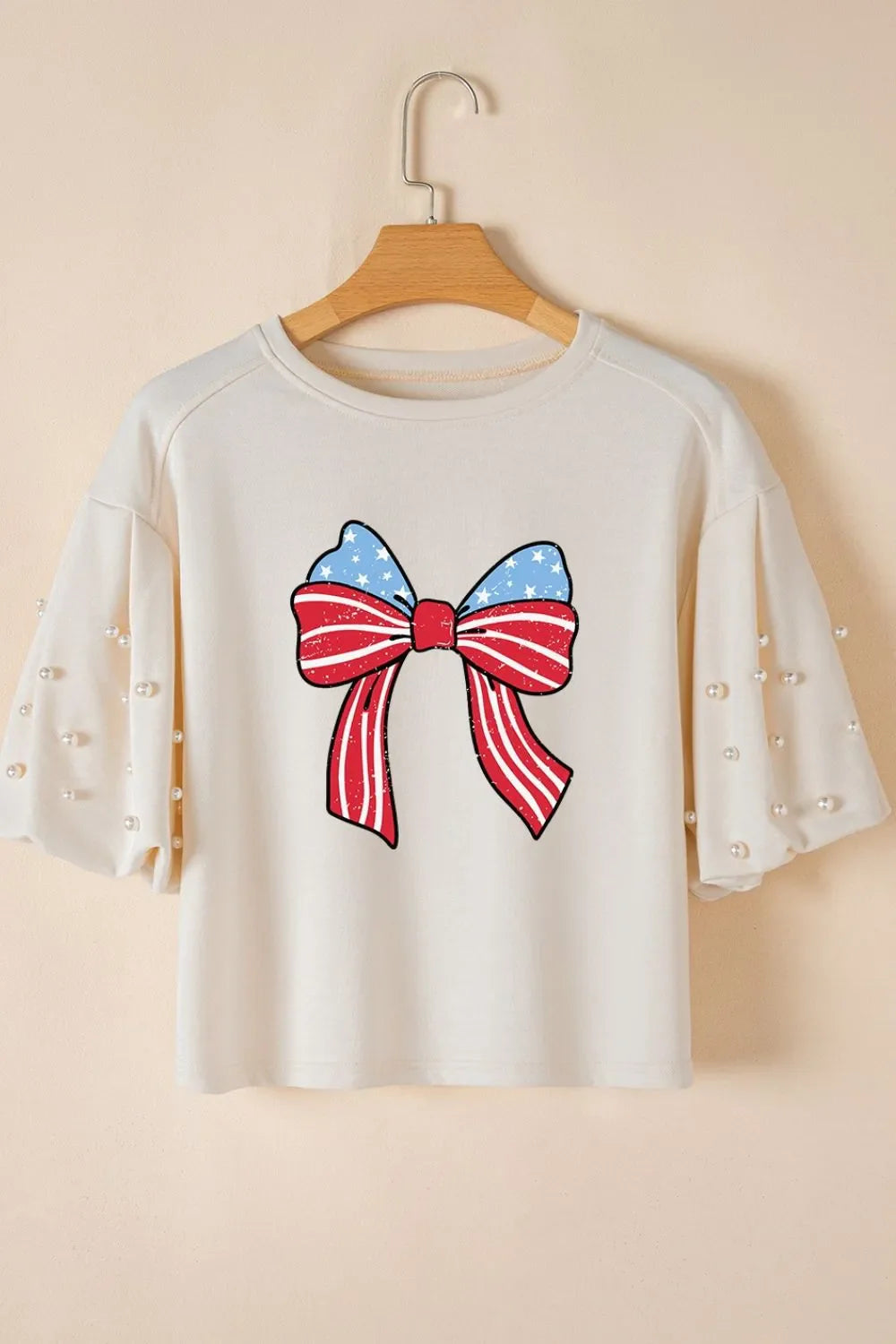 Bowknot Graphic Pearl Puff Half Sleeve T Shirt