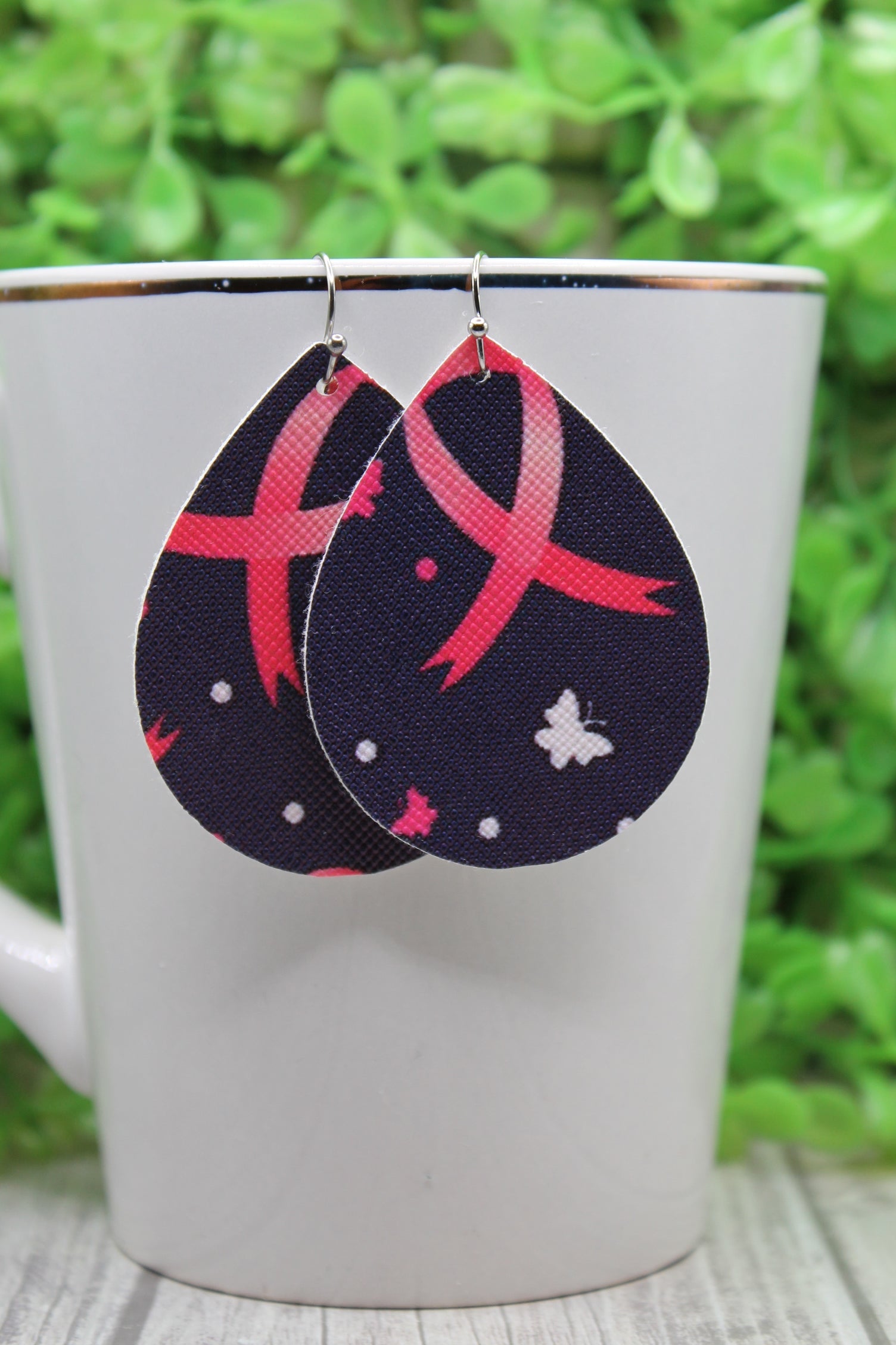 Breast Cancer Awareness Butterfly • Mini Faux Leather Teardrop Dangle Earrings
