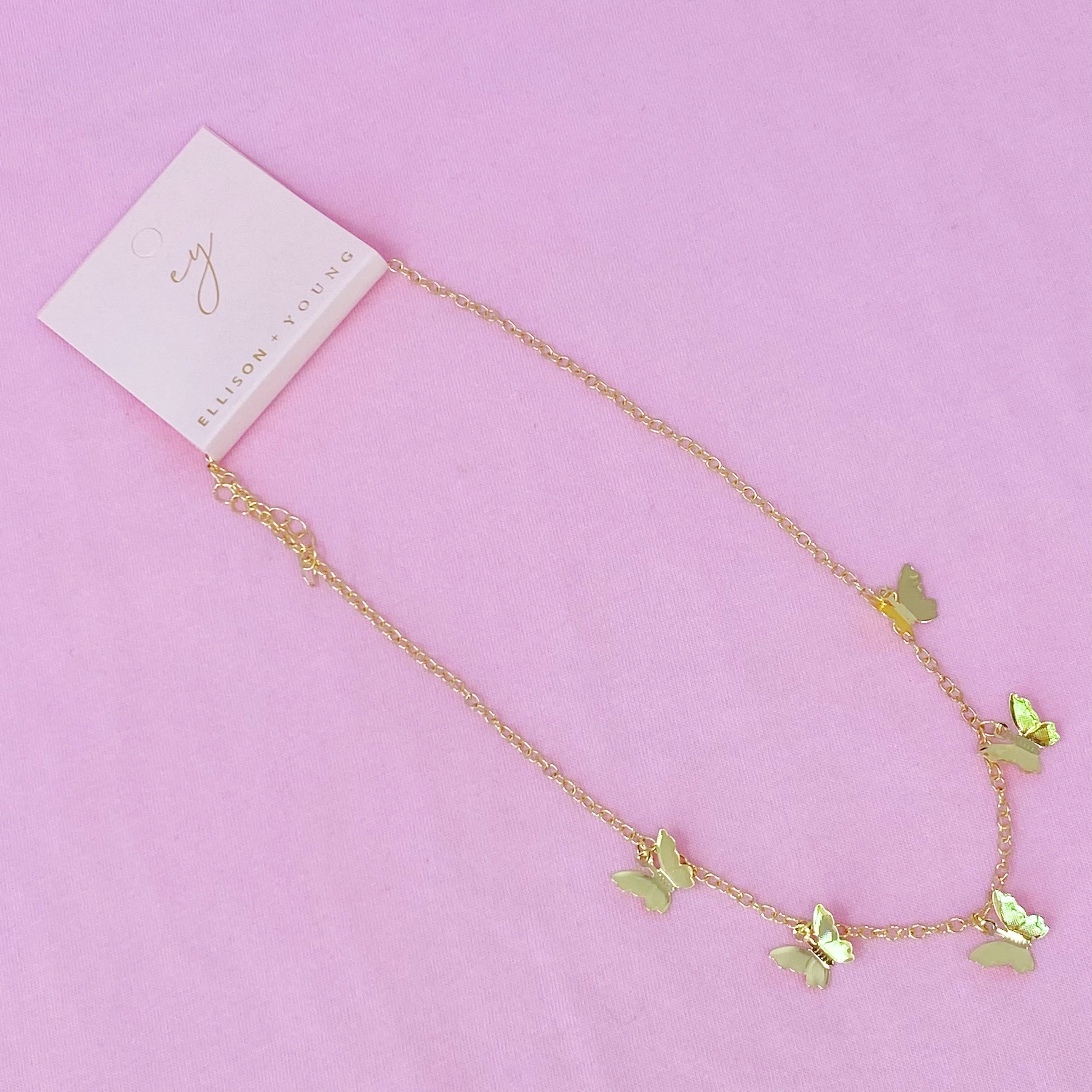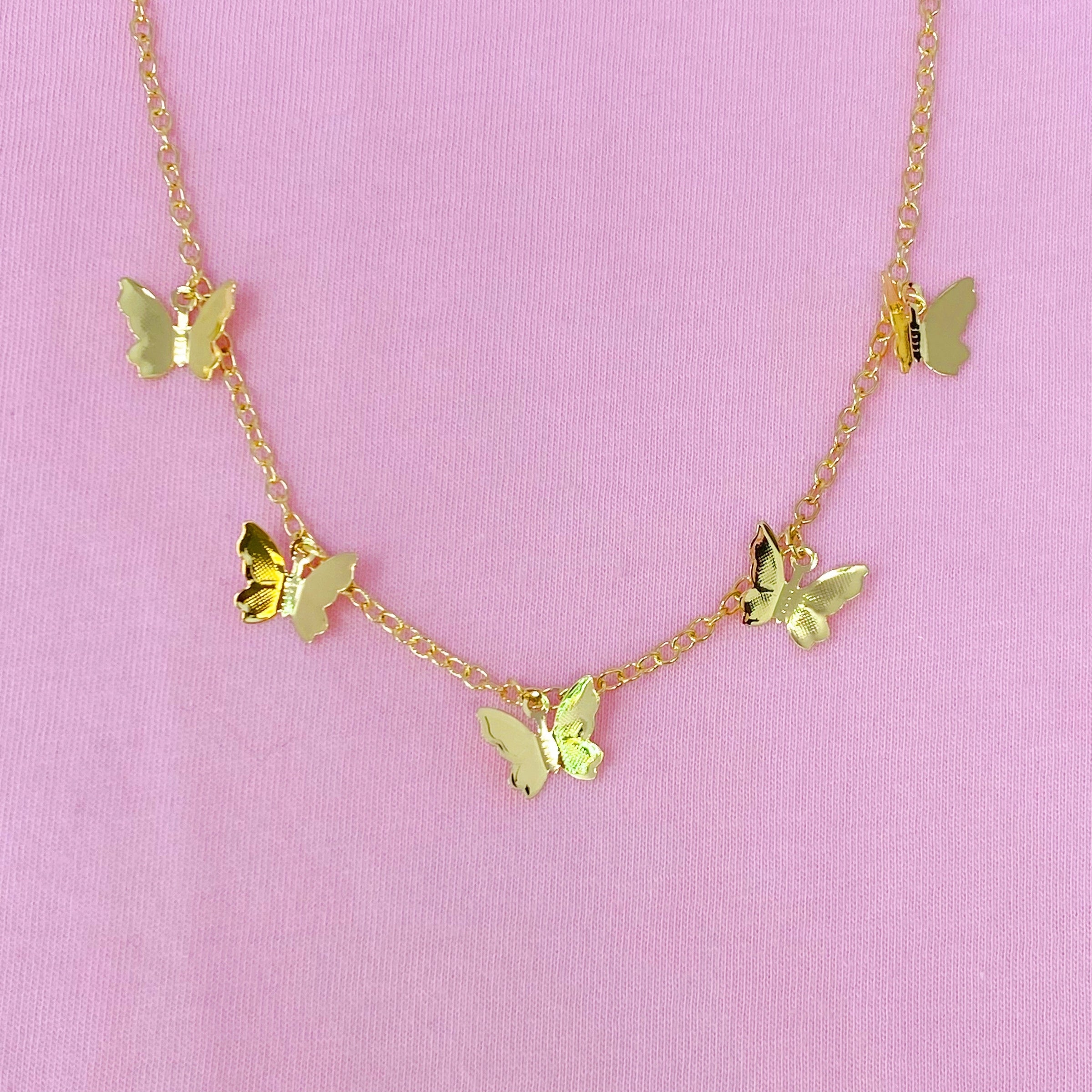 Stunning style of necklace with five dainty butterflies attached throughout.