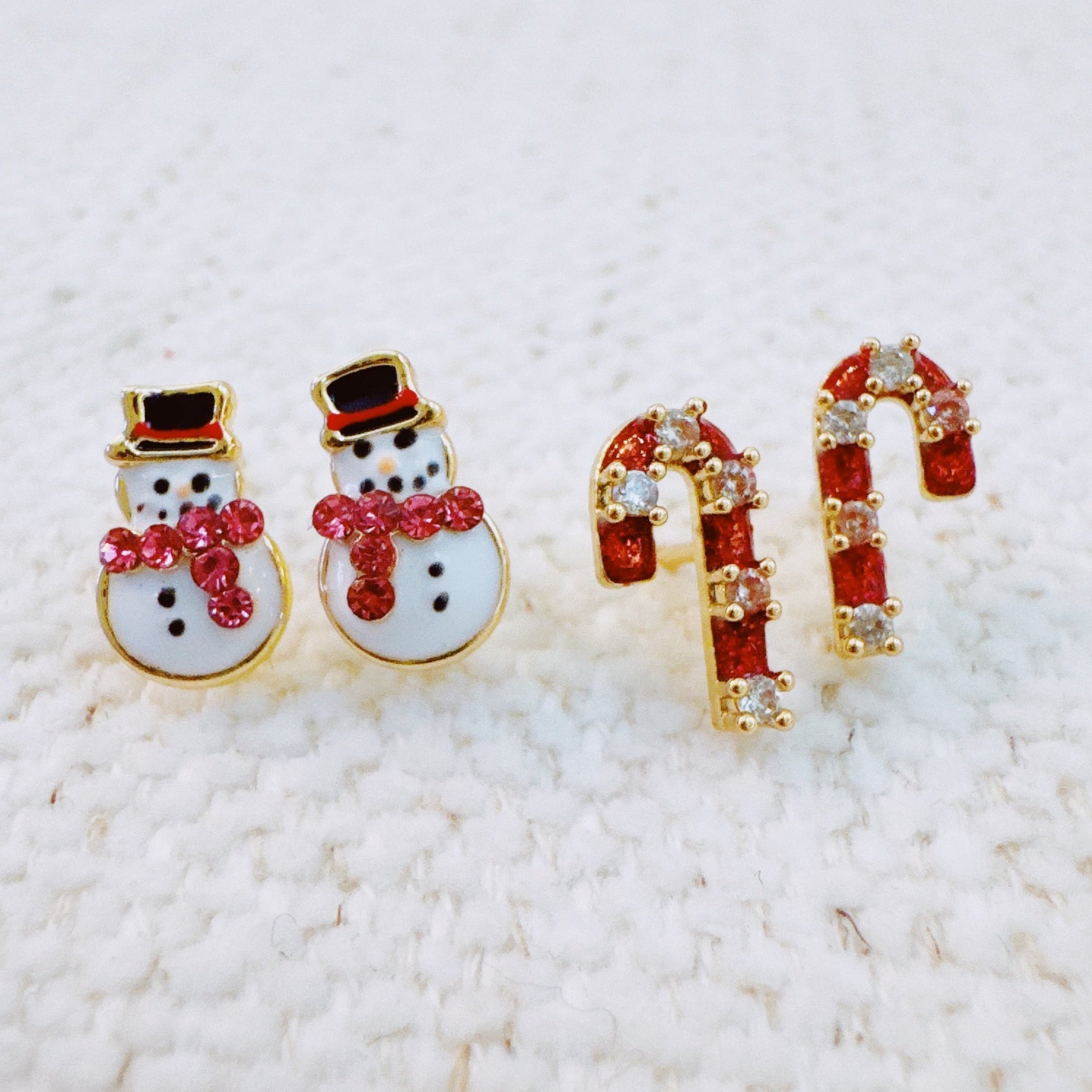 Celebrate the season in style with the Candy Cane & Snowman Stud Earring Set. This playful and festive pair brings a cheerful touch to your holiday looks with charming, seasonal designs.