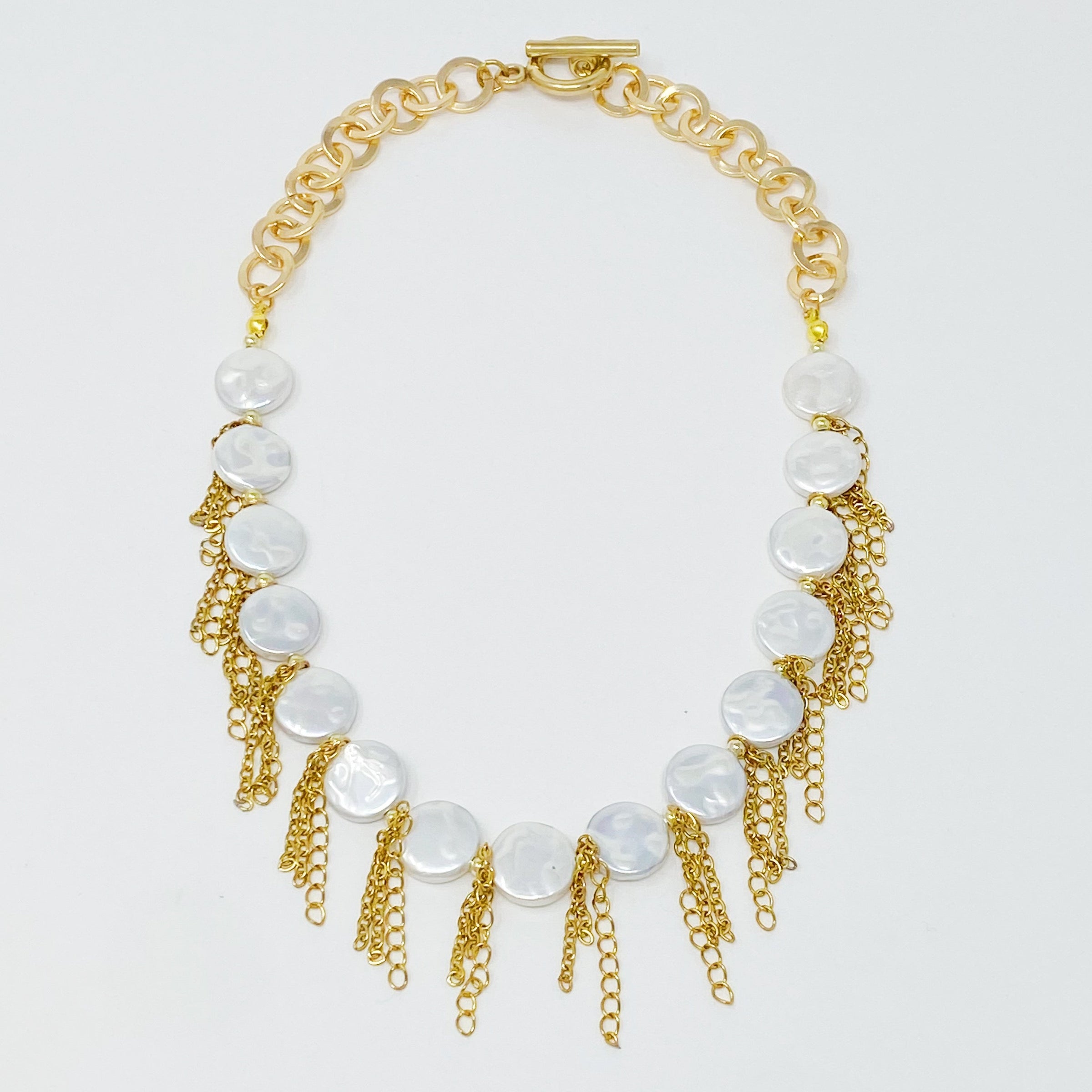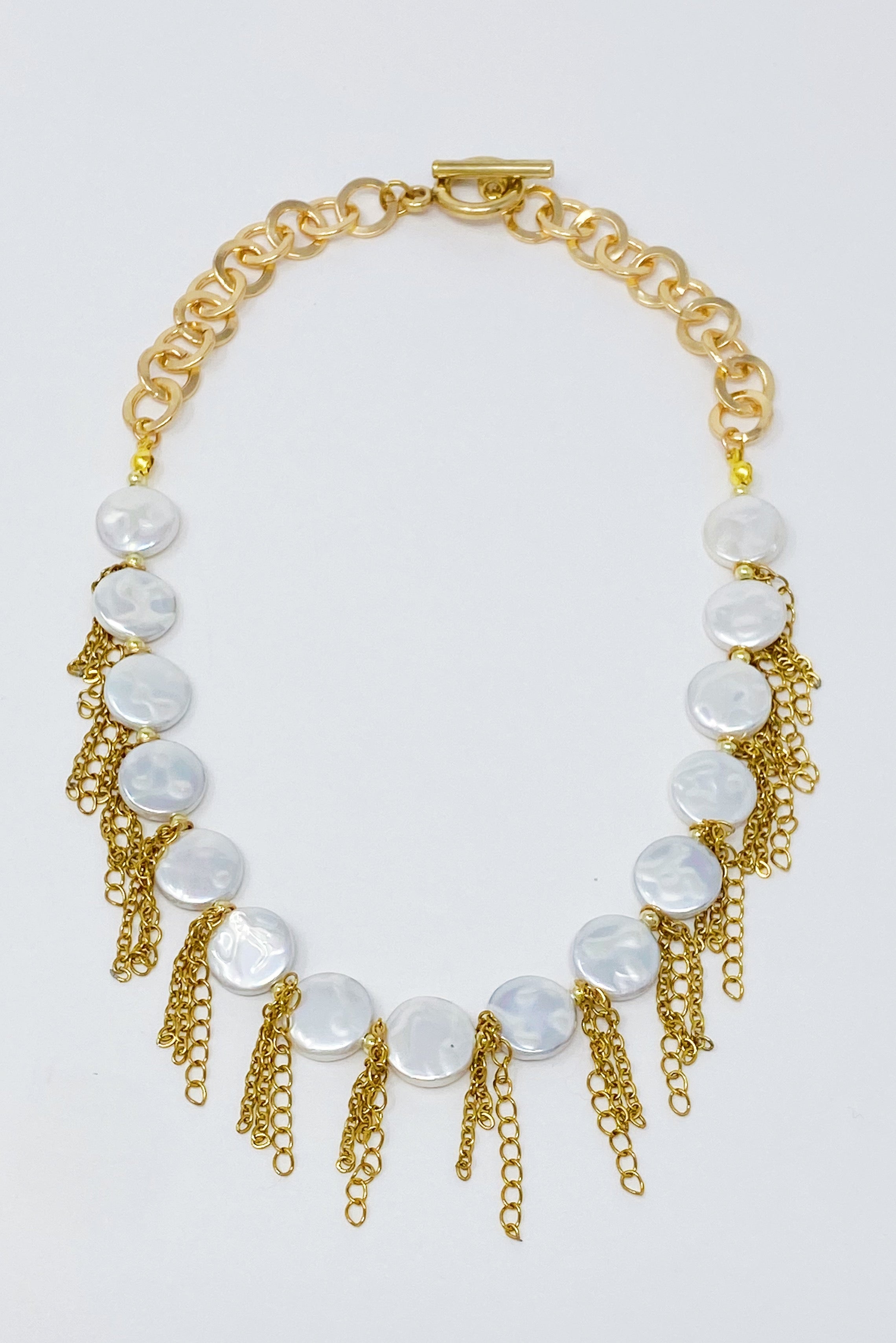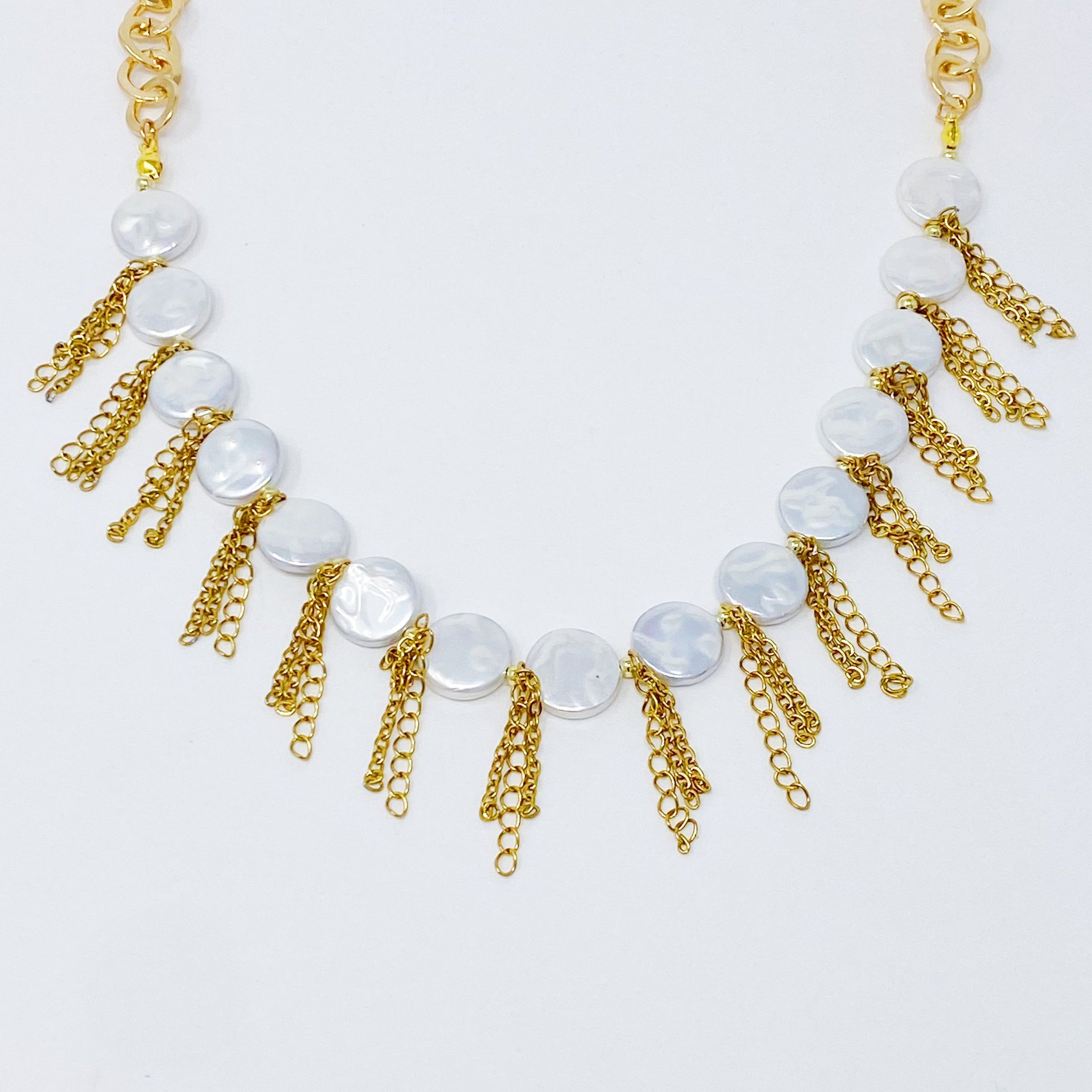 This unique Chain Fringe Shell Pearl Necklace has both classic elegance and edgy vibes. The combination of its pearl shell and chain fringes create a sophisticated look that's perfect for special occasions or everyday wear. It adds a stylish touch to any outfit.
