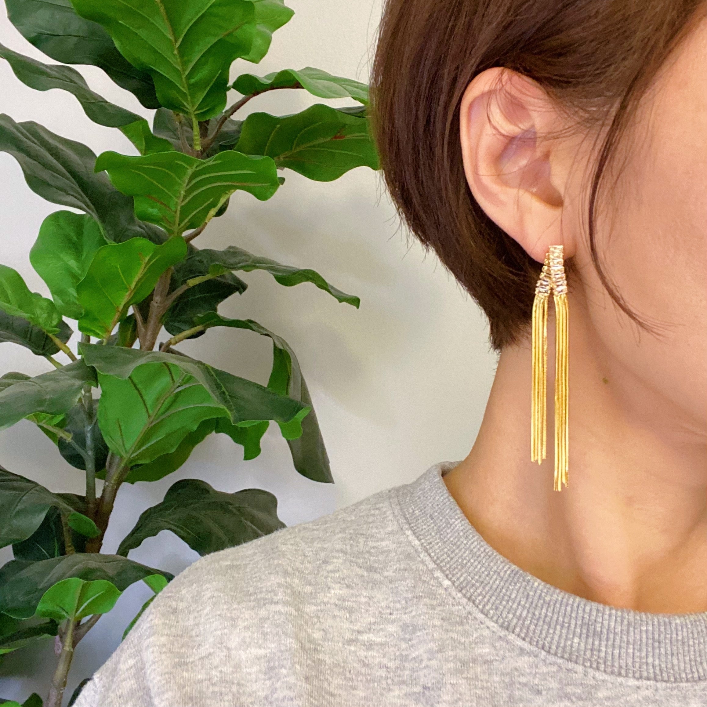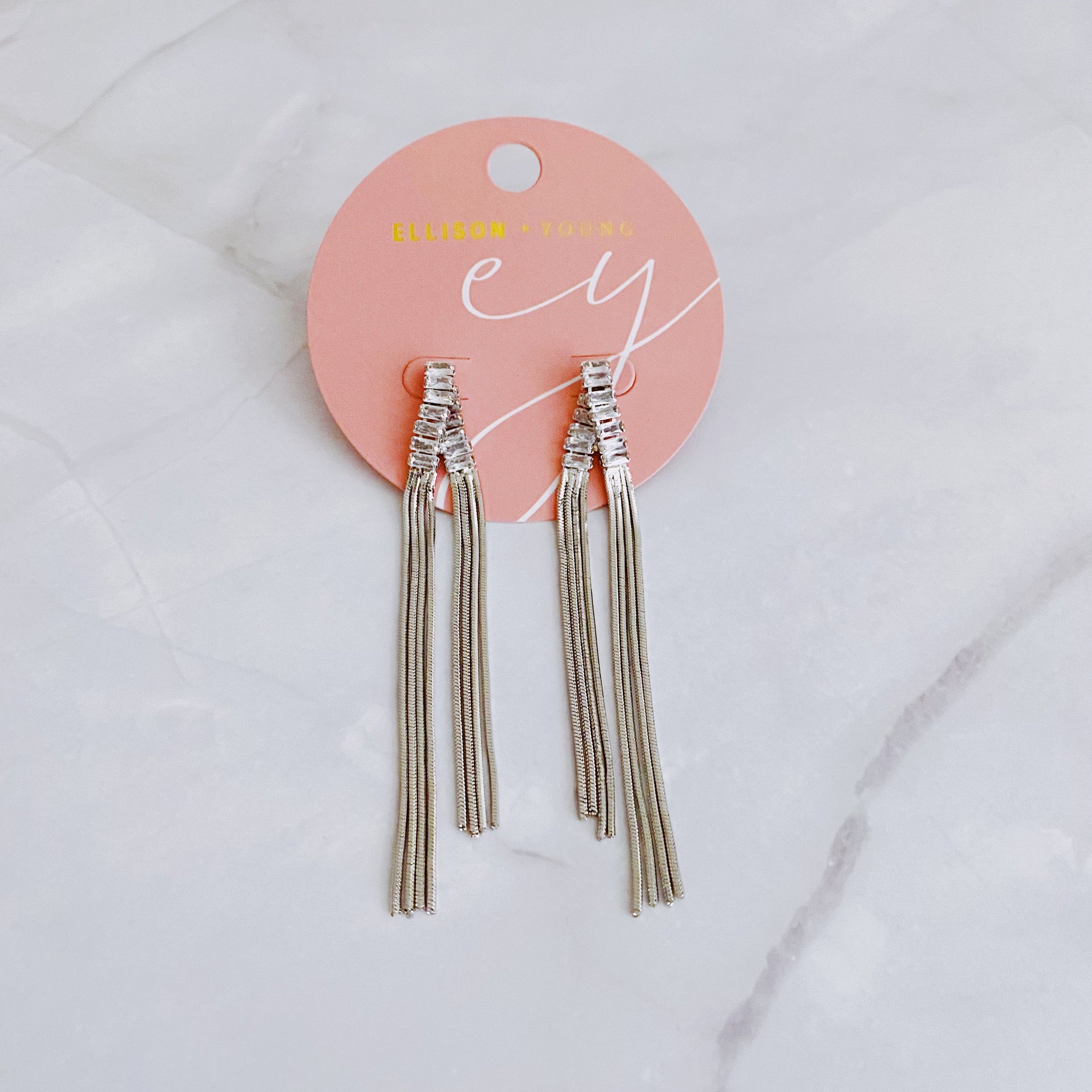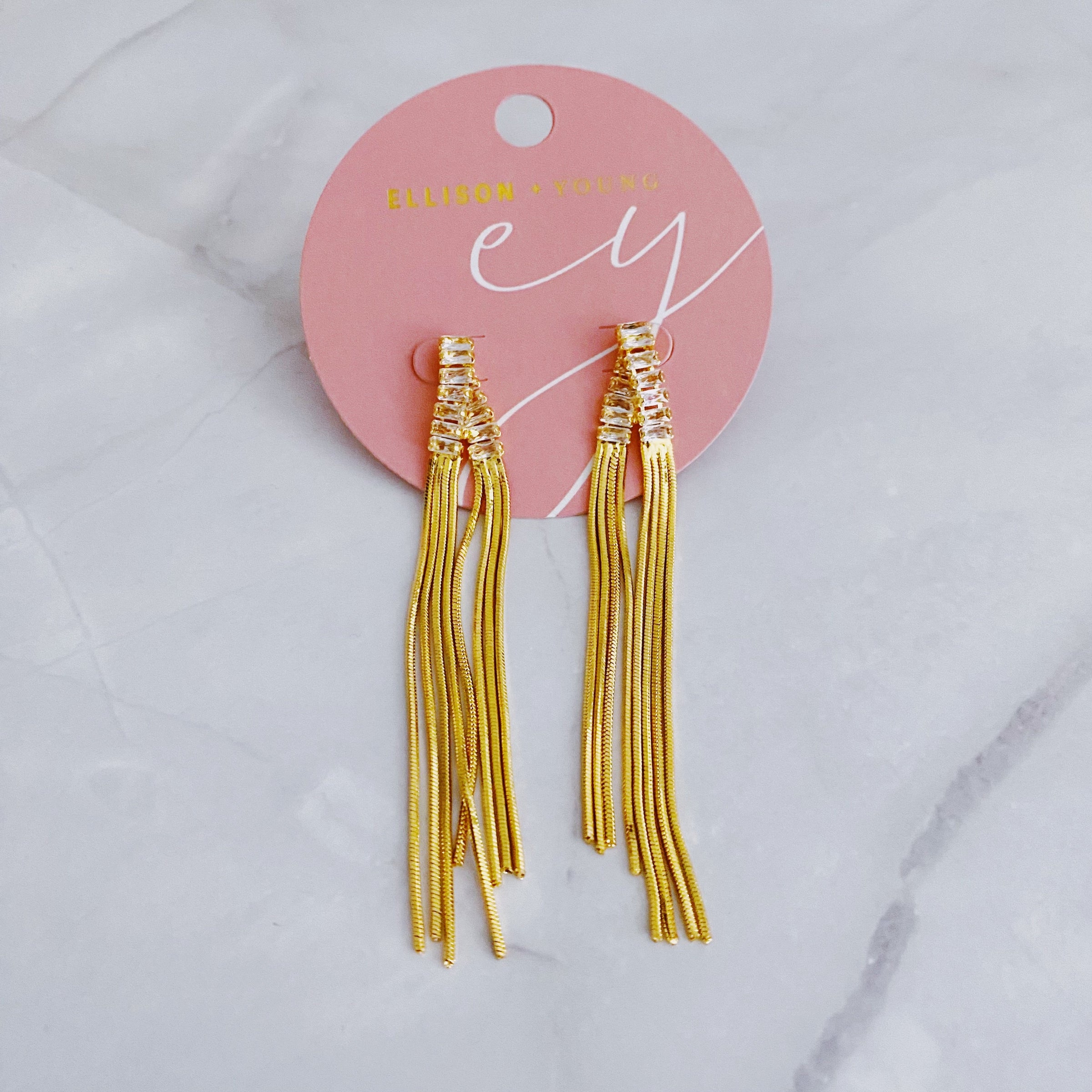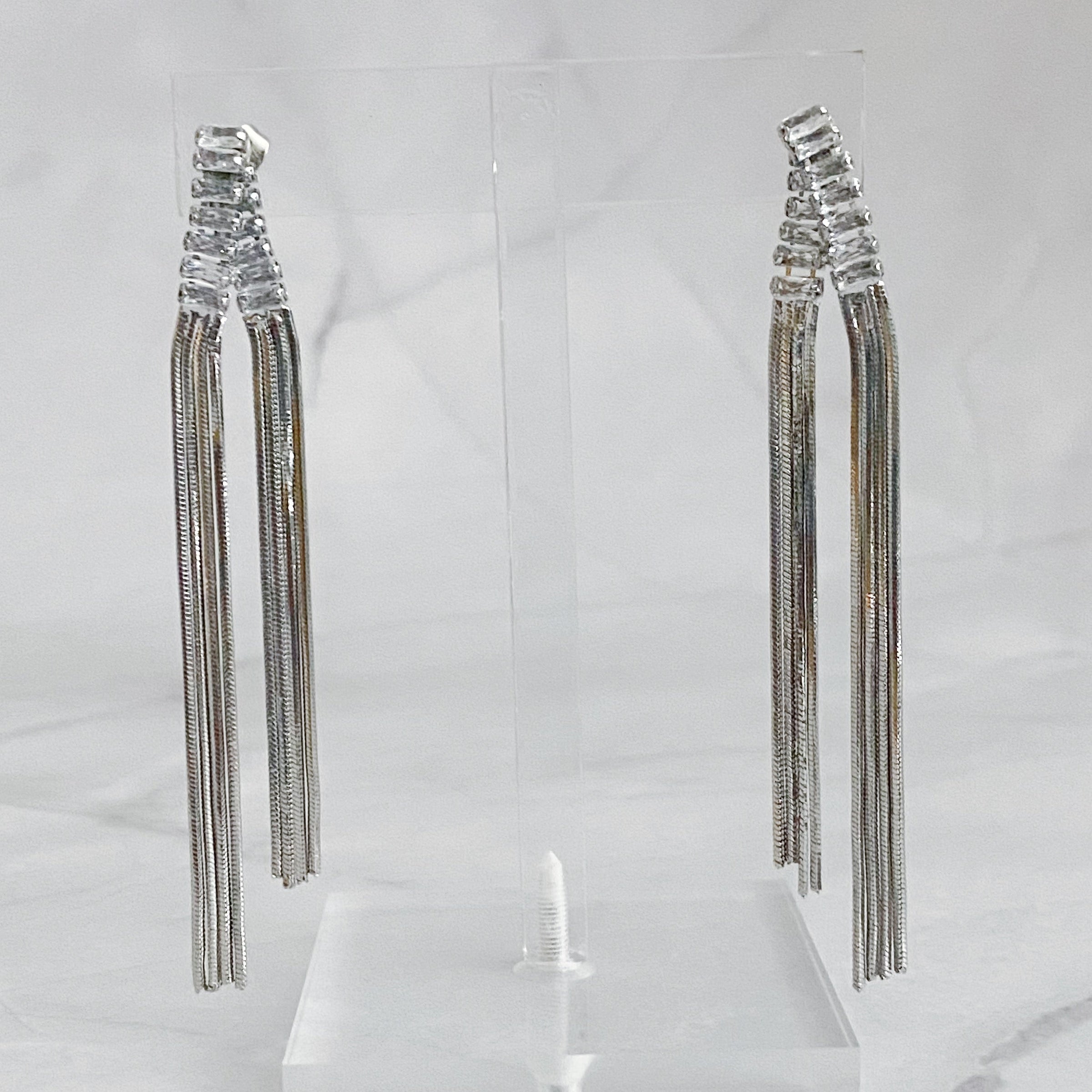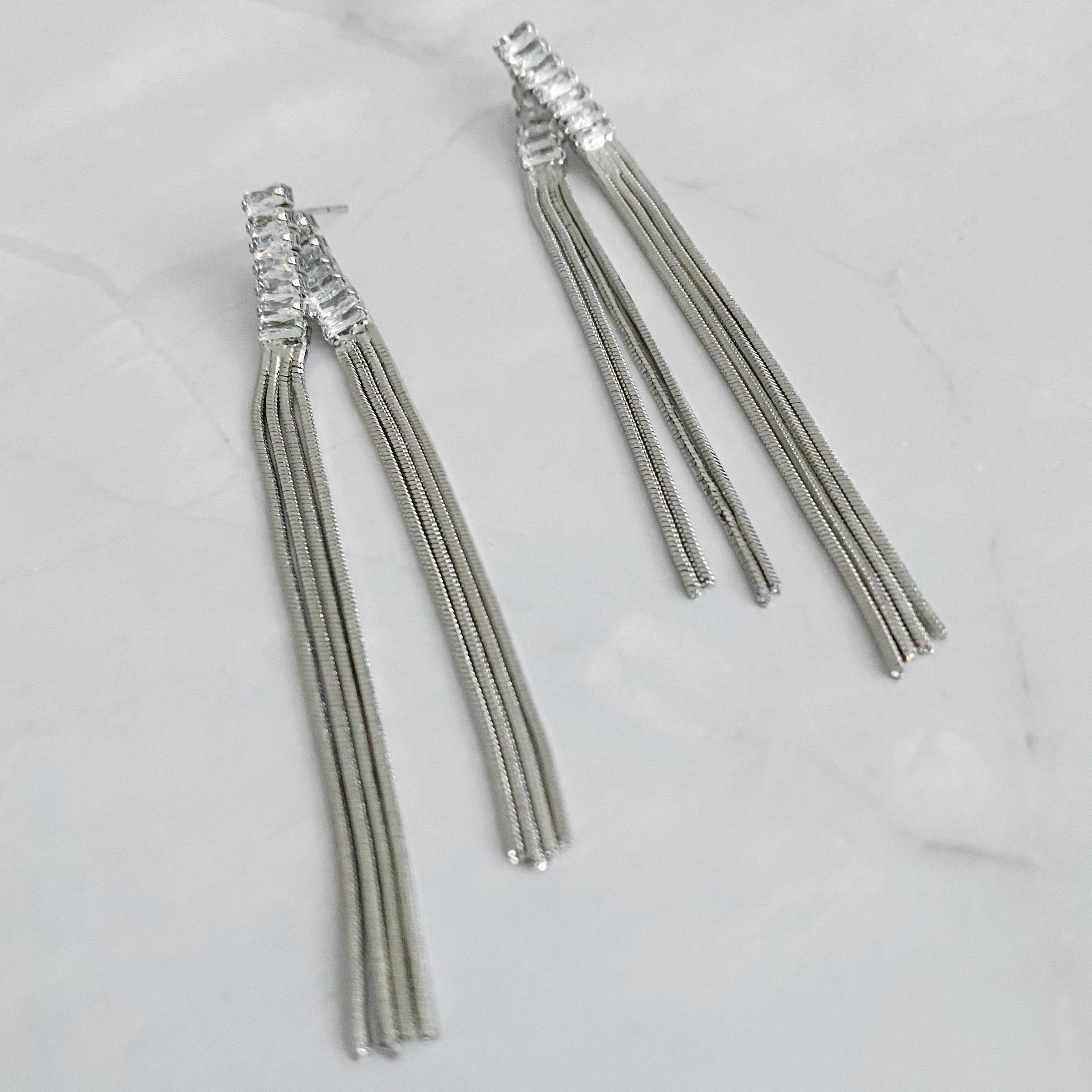 These Shine Earrings feature a stunning mix of sparkly stones that will elevate any look. With its long chain drops, they provide the perfect balance of glam and edge for any special occasion.