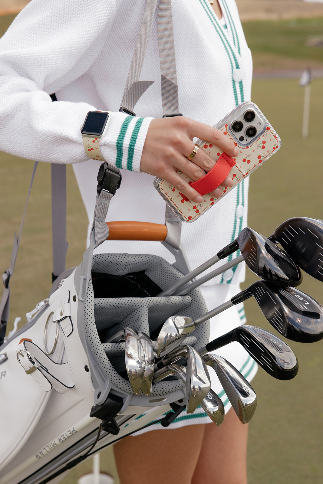 Bring style to your Apple watch with a Walli watch band. Our watchbands are made of high-quality silicone for comfortable wear all day. Pair this band with the coordinating Cherry On Top case, wireless charger, wrist lanyard, and zipper pouch!