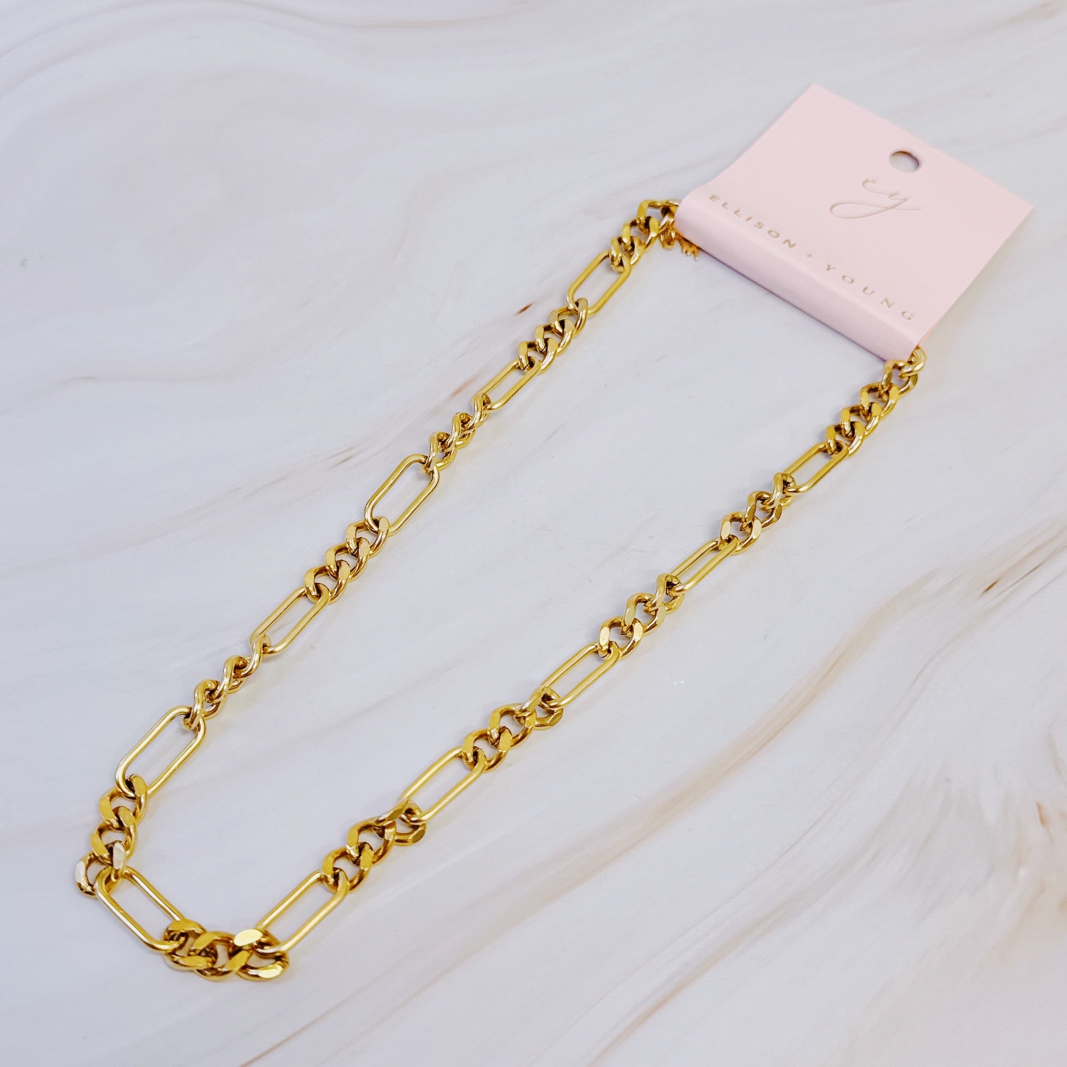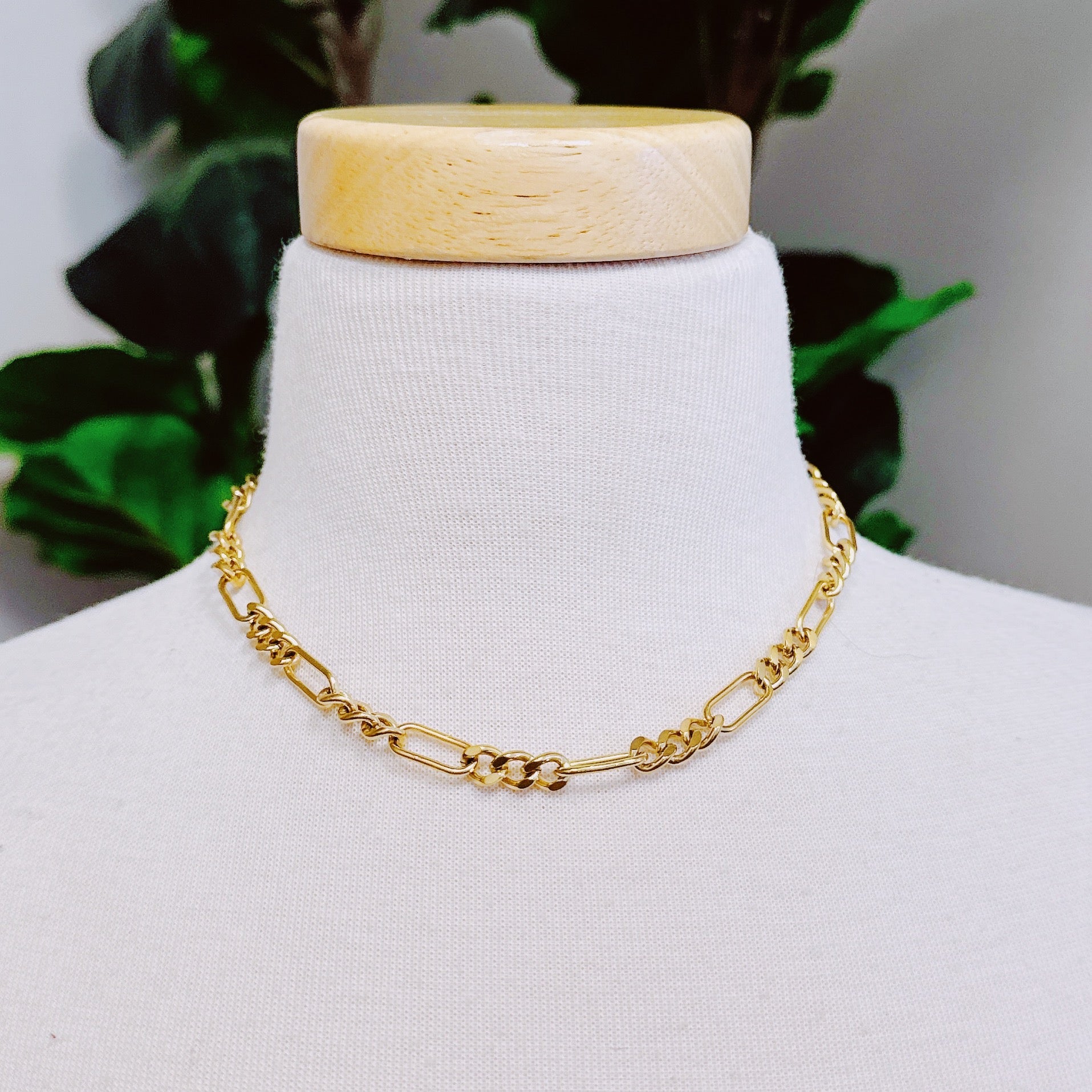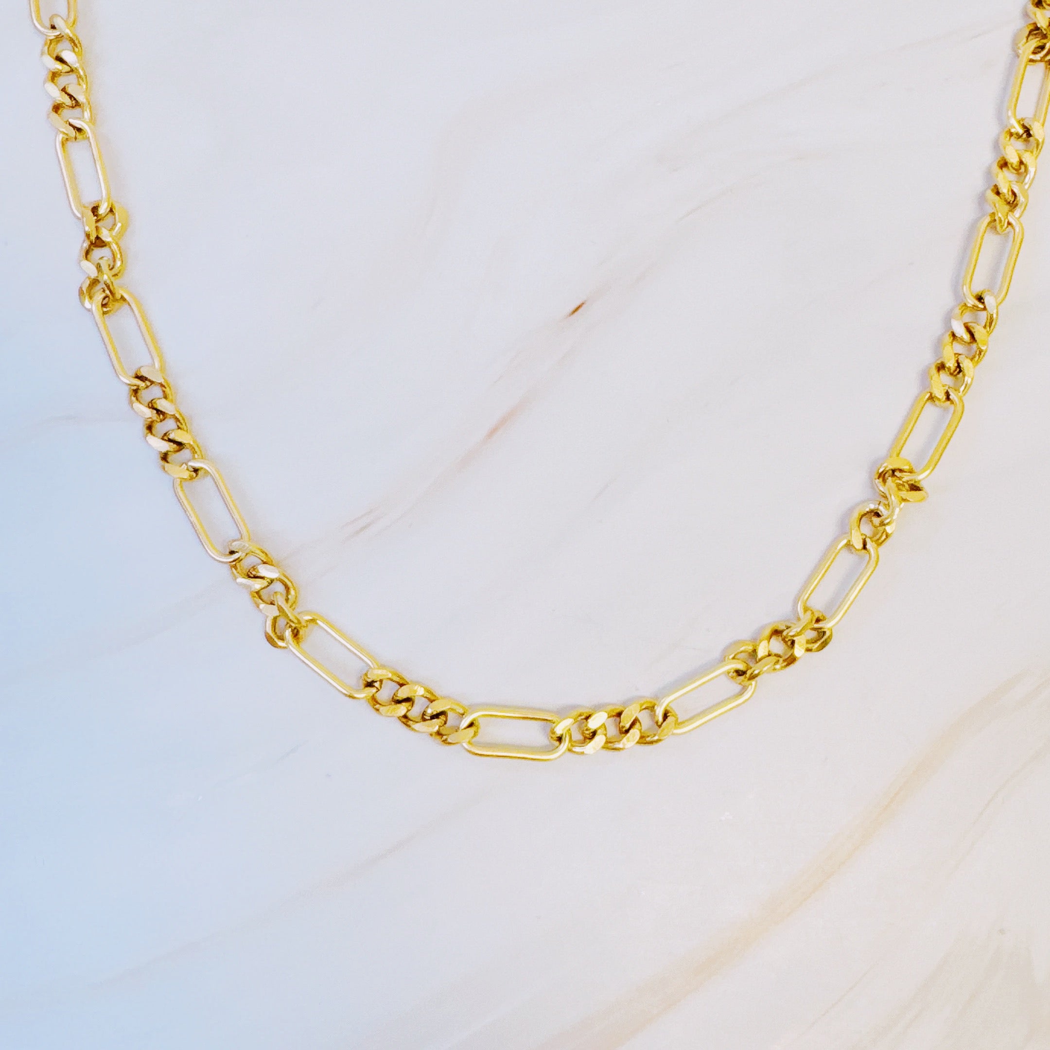 This necklace features a modern and unique chain design, adding a chic and edgy touch to any outfit. Its versatility allows for easy dressing up or down, making it a must-have accessory.