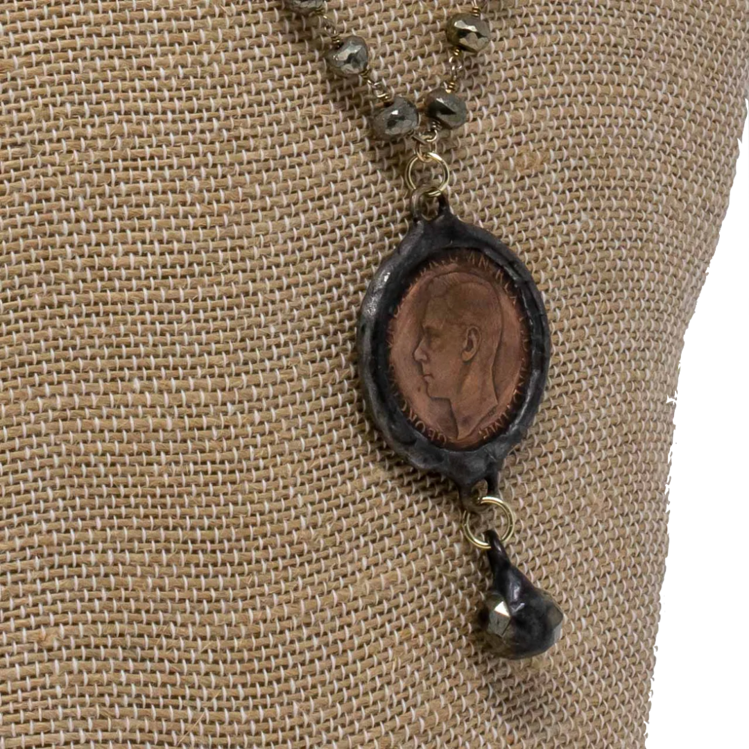 This necklace places us right into an episode of The Crown. Our Colbie Necklace has a vintage British Penny hanging on a Pyrite chain and is a one of a kind piece. This necklace is one that you’ll be wearing for years to come.
