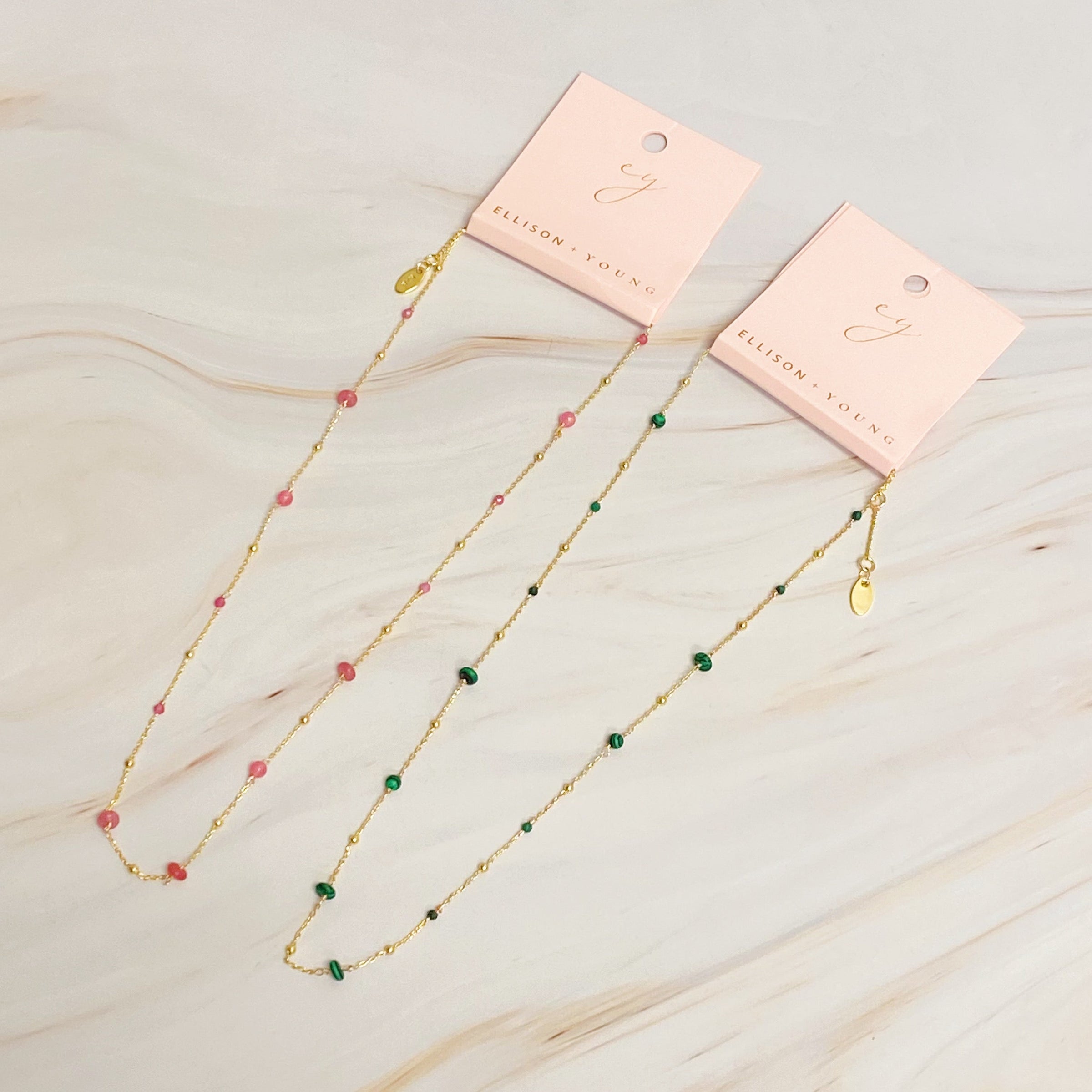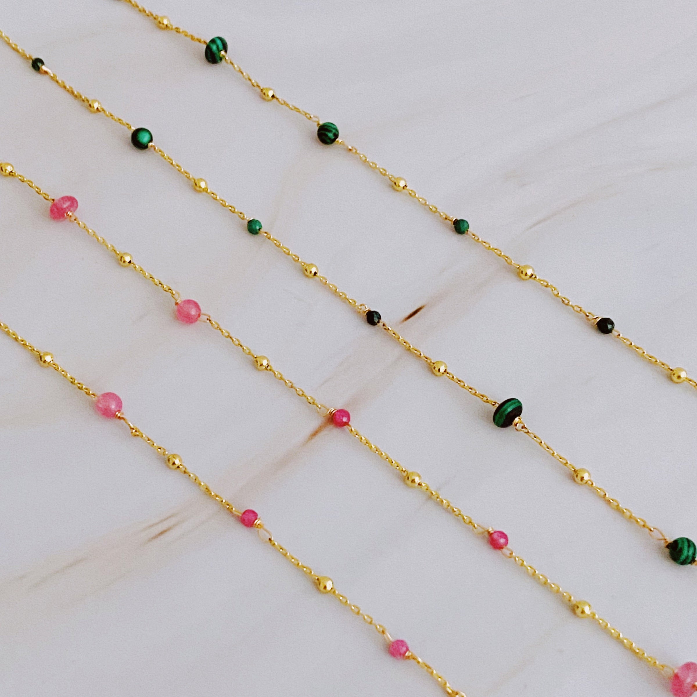 Elevate your everyday look with our Dainty Precious Stone Bead Necklace. The delicate chain showcases varying sizes of beautifully placed stone balls, offering a touch of daintiness to any outfit. Perfect for layering or wearing on its own, this versatile necklace will effortlessly take you from casual to dressy occasions.