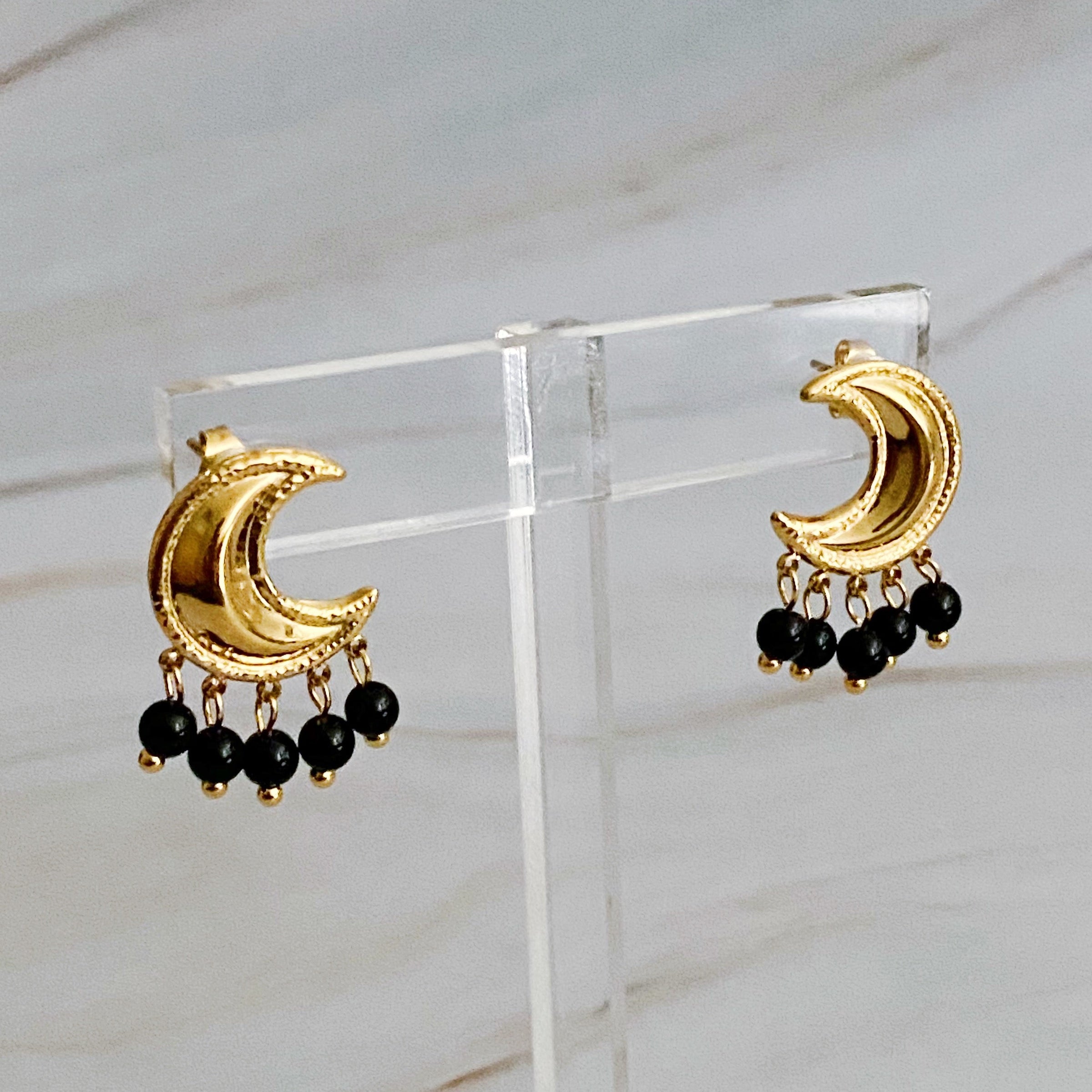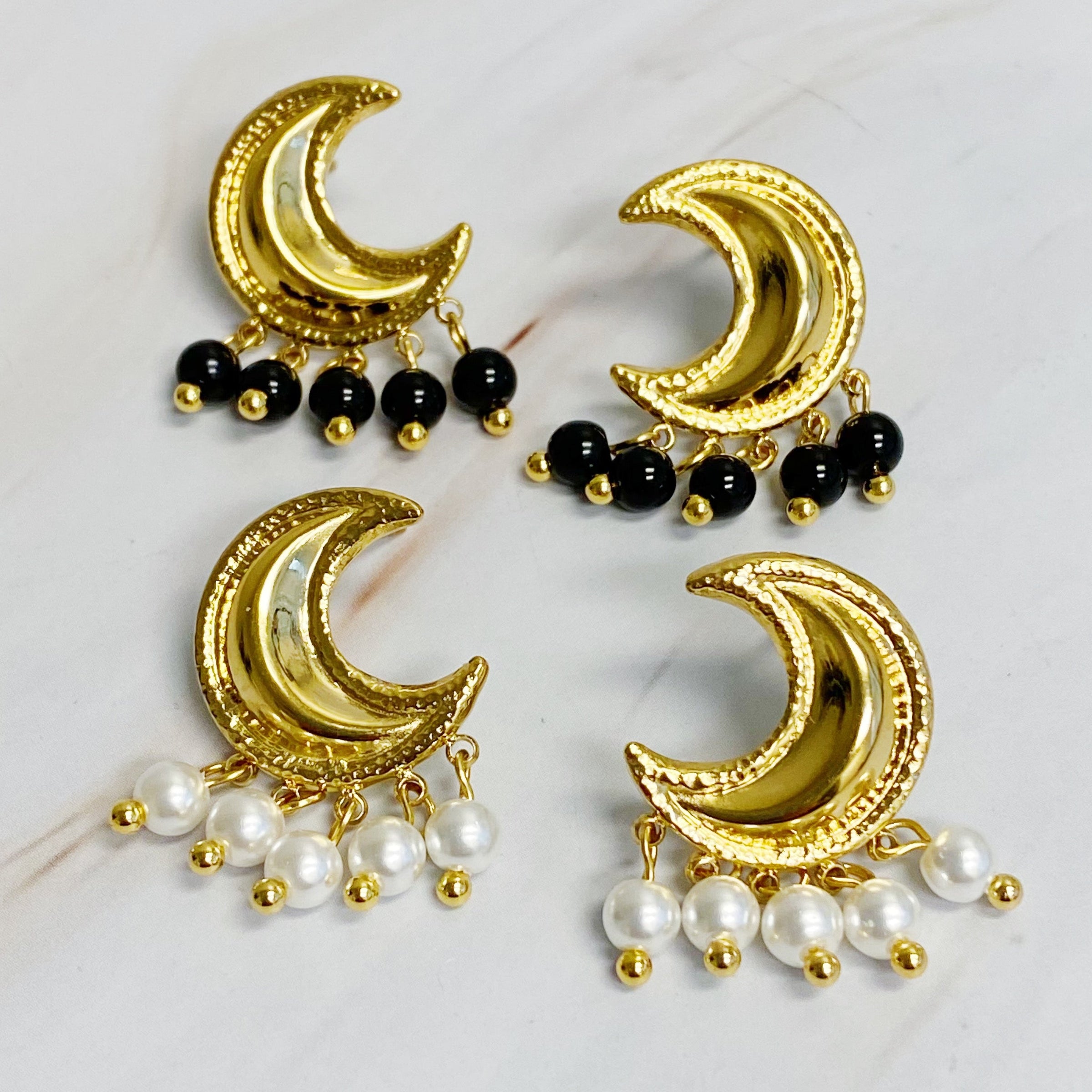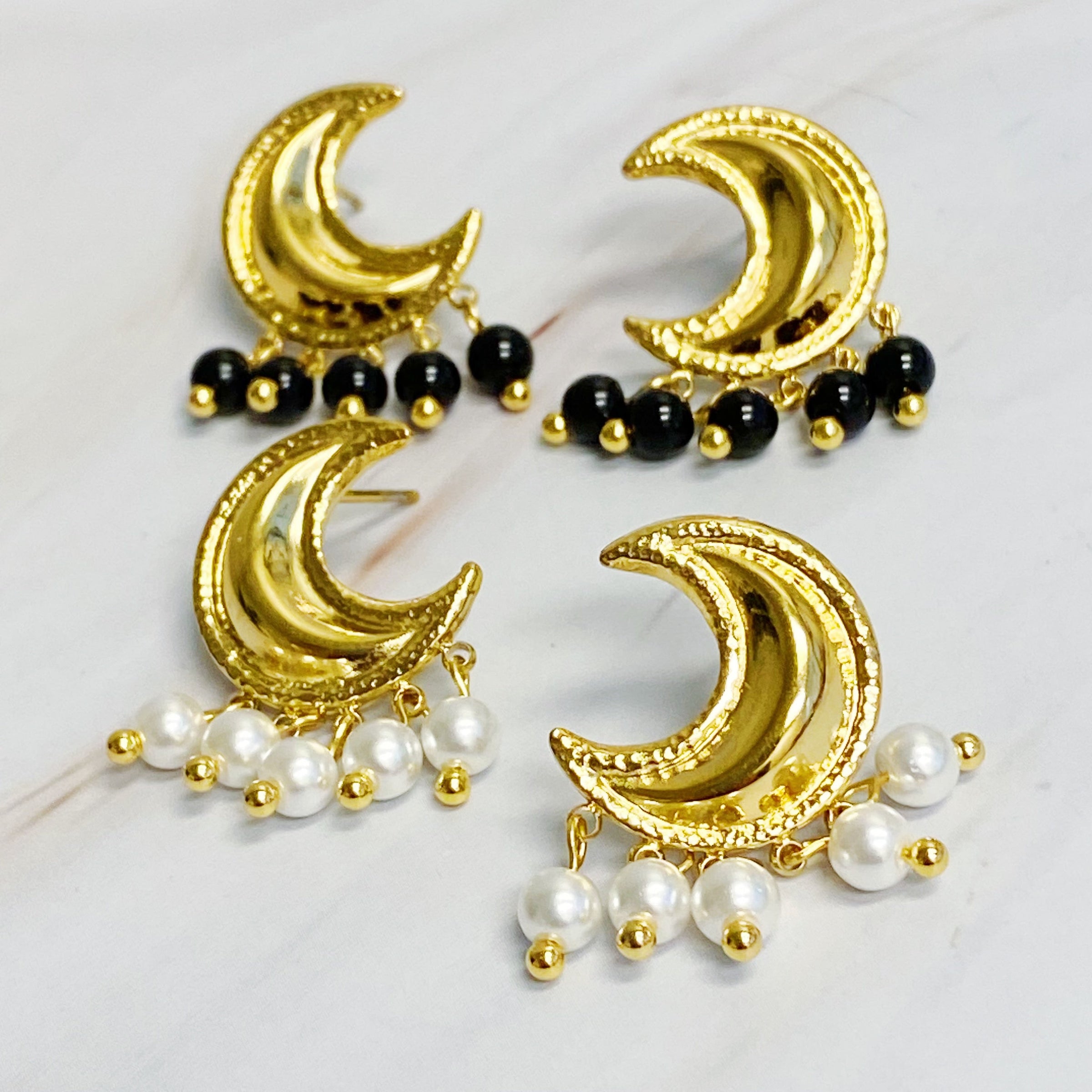 The Dangle Beads Crescent Earrings feature a crescent moon design with delicate beads dangling. A beautifully creative jewelry piece that effortlessly adds charm and elegance to any outfit.