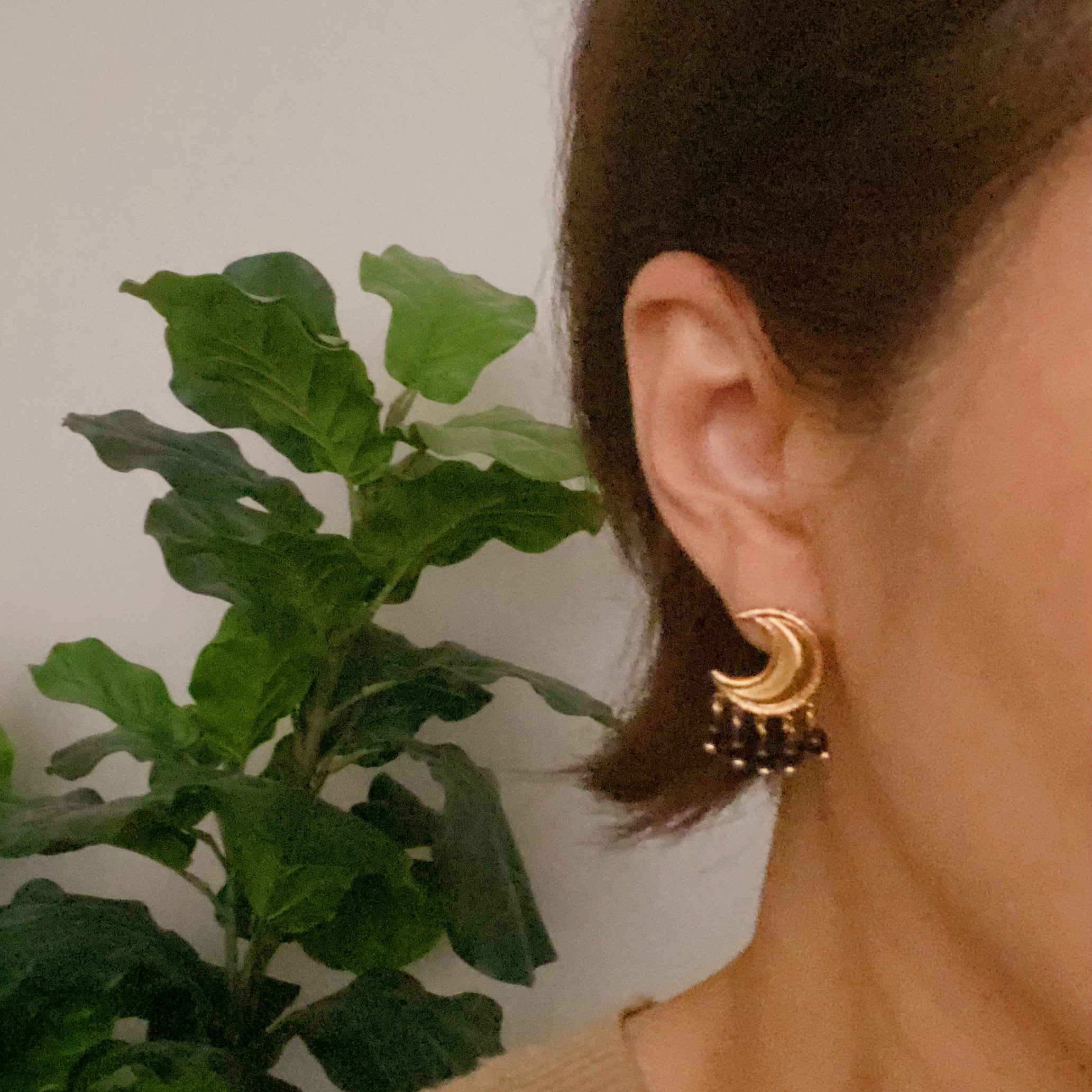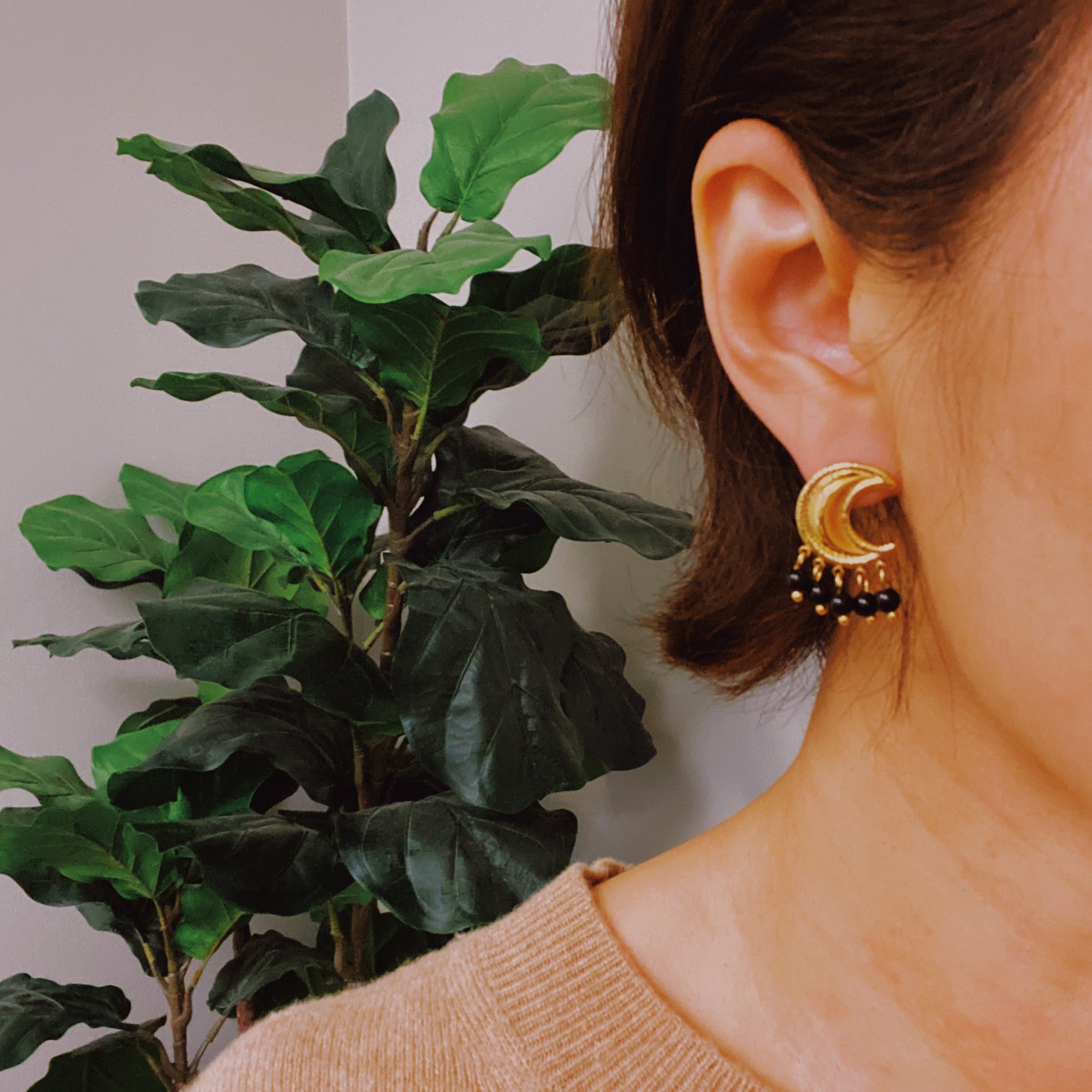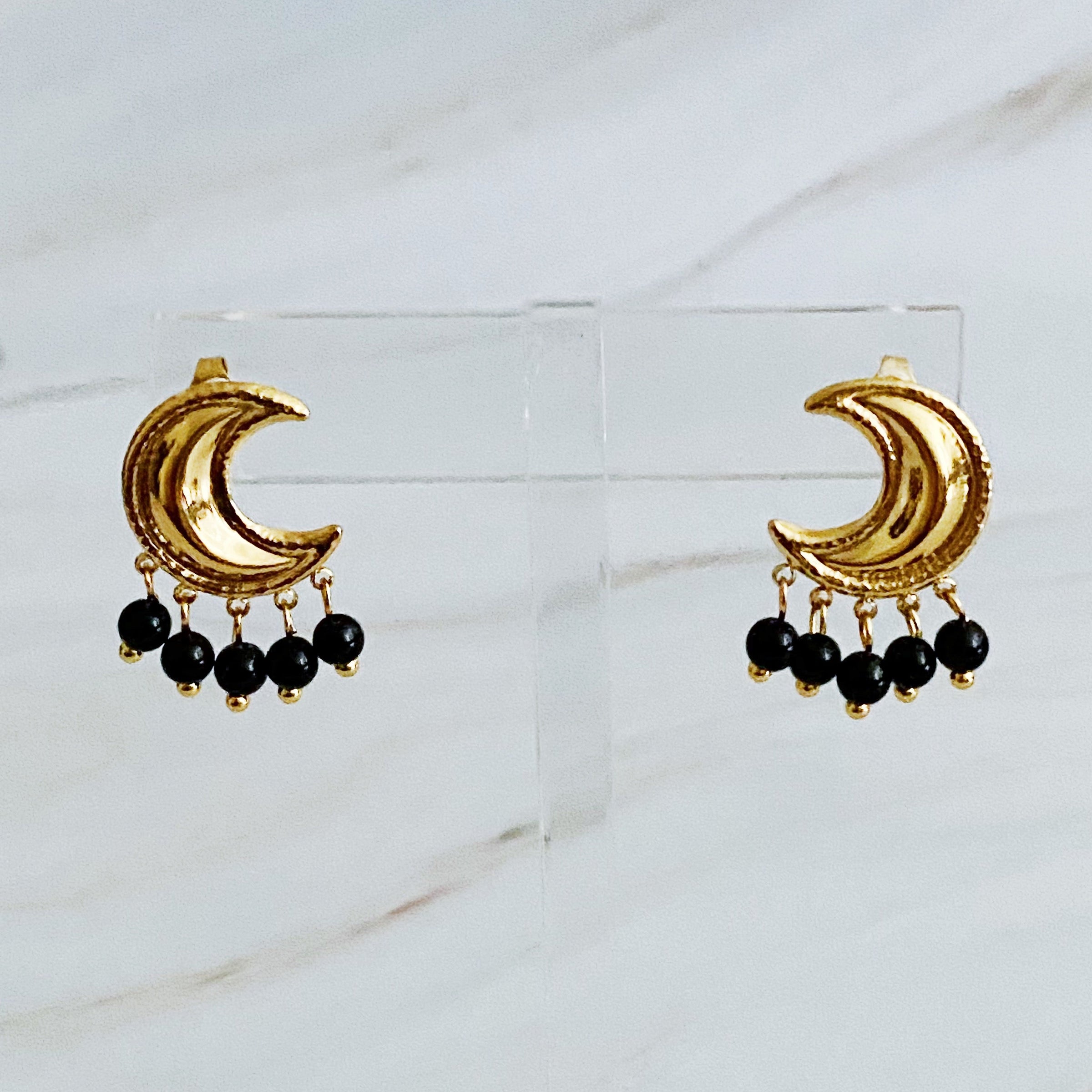 The Dangle Beads Crescent Earrings feature a crescent moon design with delicate beads dangling. A beautifully creative jewelry piece that effortlessly adds charm and elegance to any outfit.
