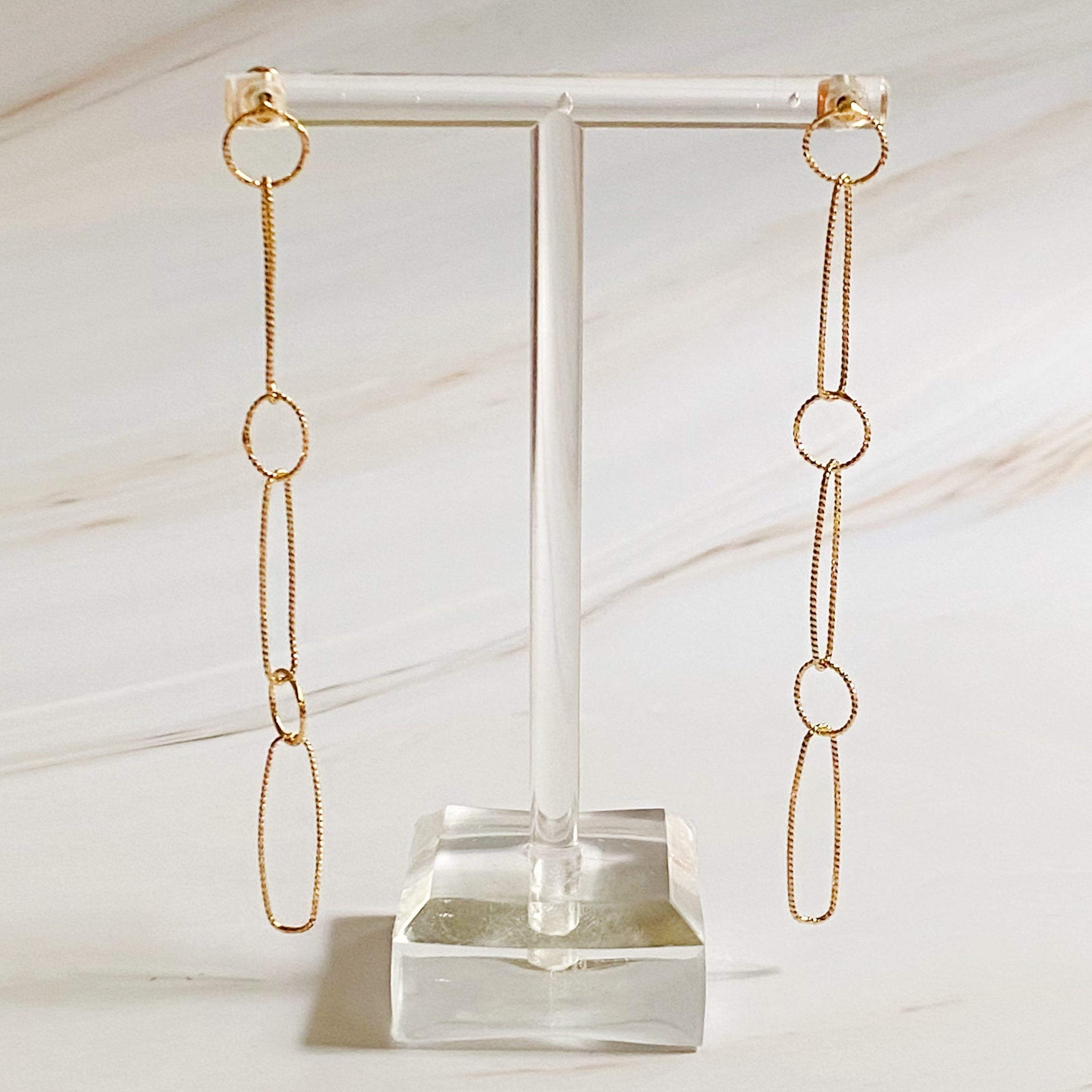 These gold-plated Dangle Dainty Chain Earrings feature beautiful links in a drop design for effortlessly chic style. The dainty, sleek, and lightweight design allows for comfortable all-day wear. Diamond cut textured details for maximum sparkle.