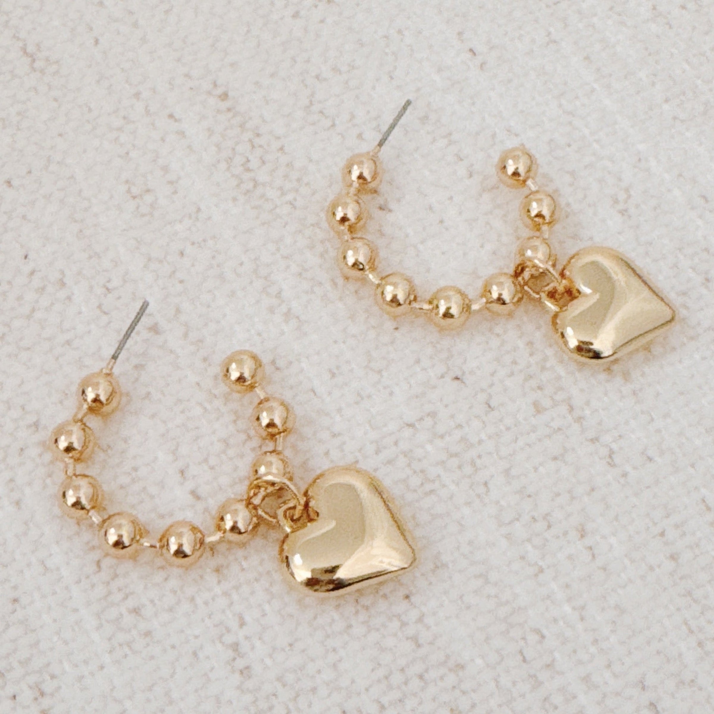 These earrings feature a modern ball hoop design with a lovely dangle heart. This cute and romantic piece adds a touch of love to any outfit.