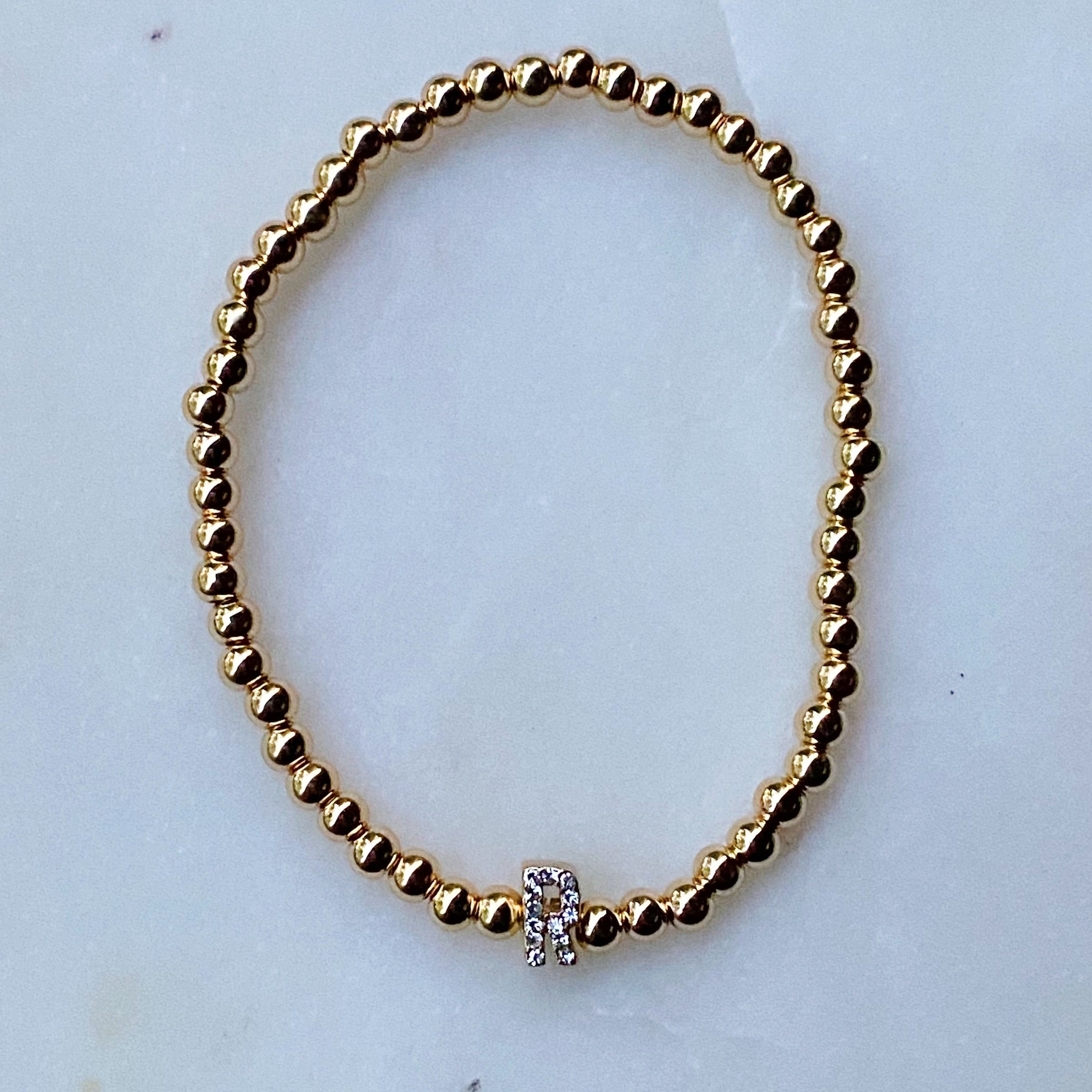 Stretch gold tone ball bead bracelet with sparkly small initial as an accent. Great to layer with other bracelets.