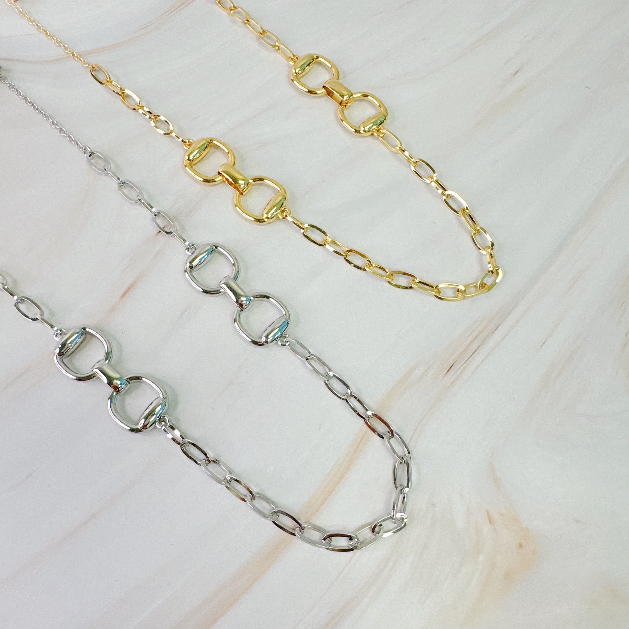 This Double Equestrian Chain Necklace boasts a chic and edgy design, making it the perfect accessory for any occasion. Its stylish and unique appearance is sure to make a statement and elevate any outfit.