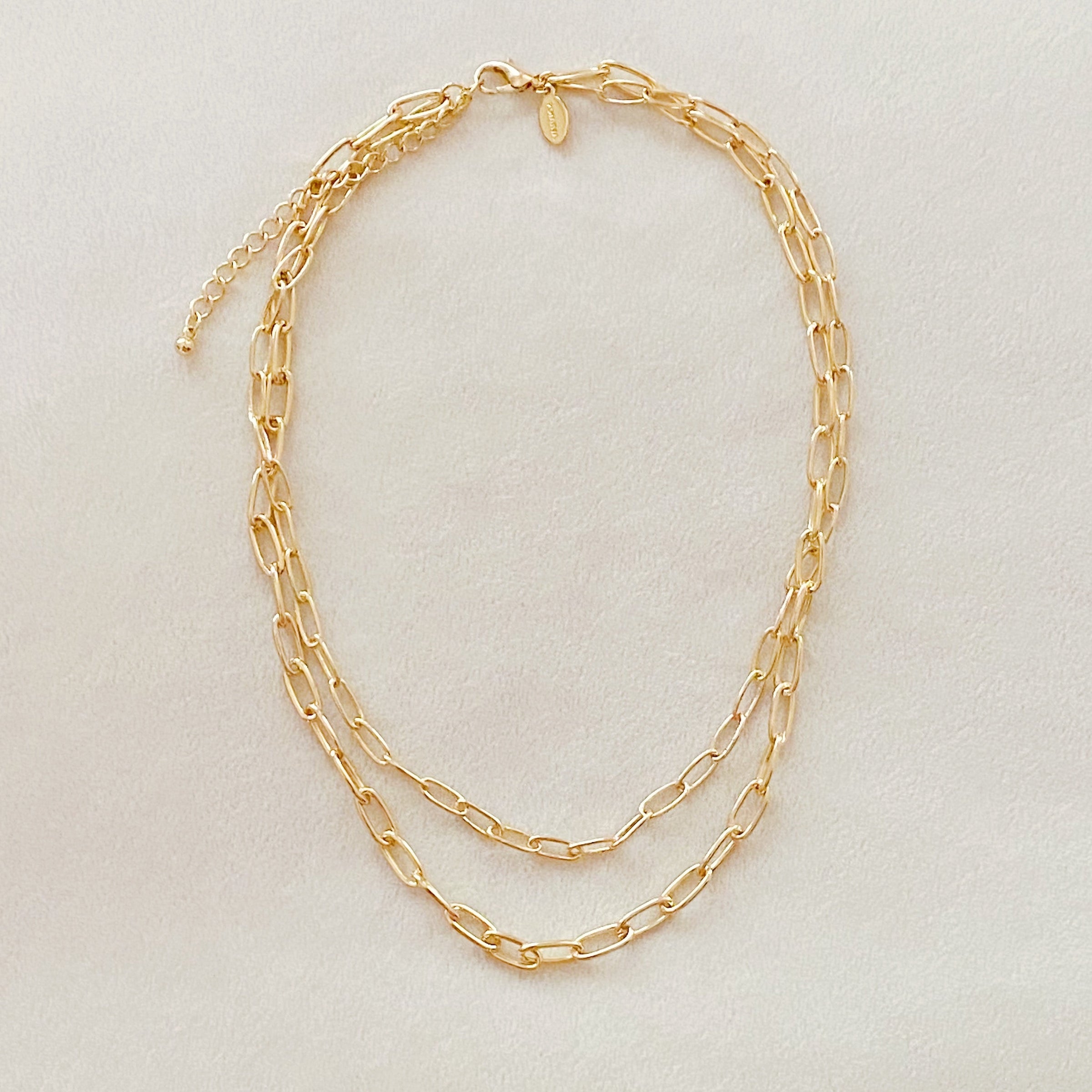 First layer is slimmer chain than the second one. 16” for first chain and 17” for second one. It connected together and comes with 3” extender.