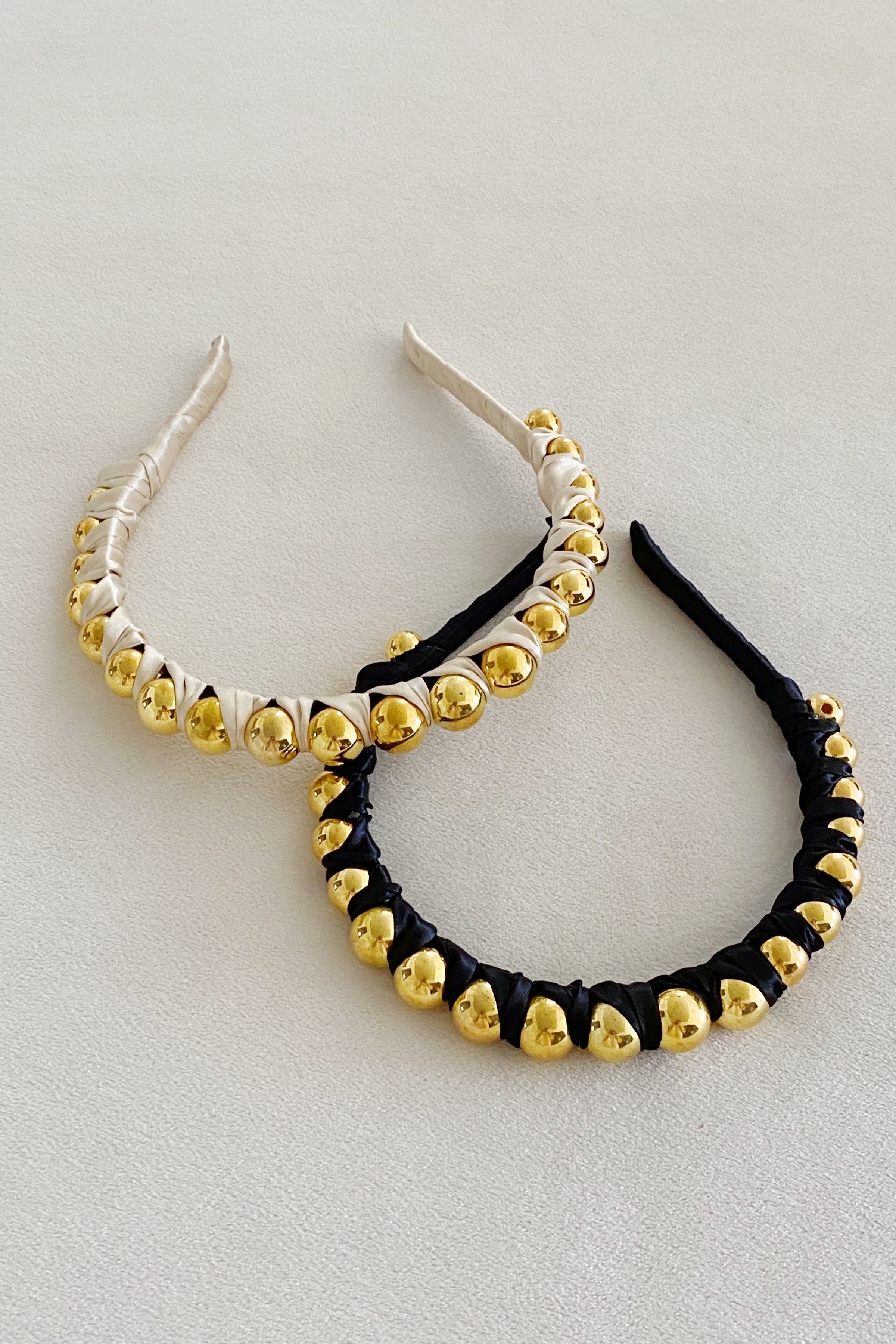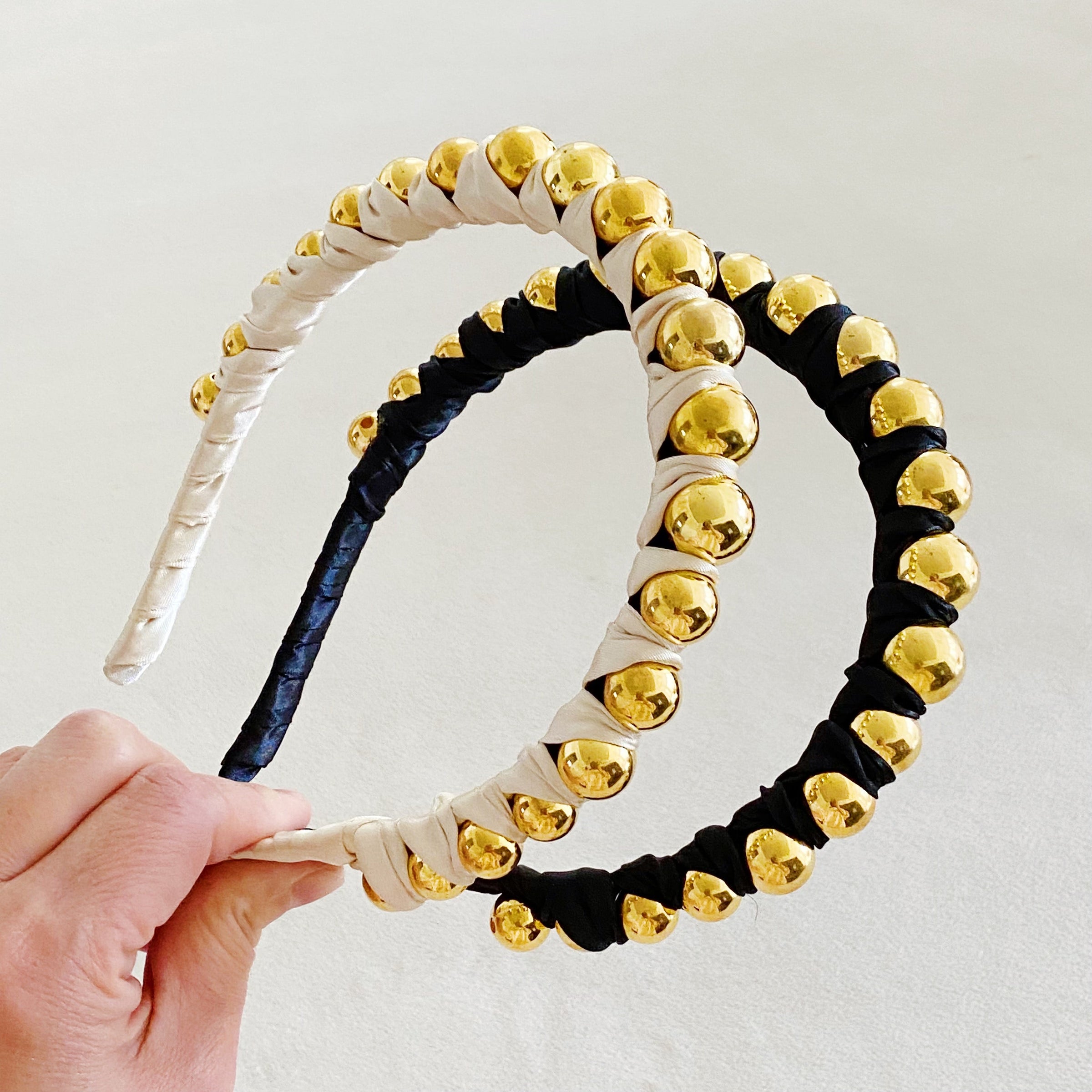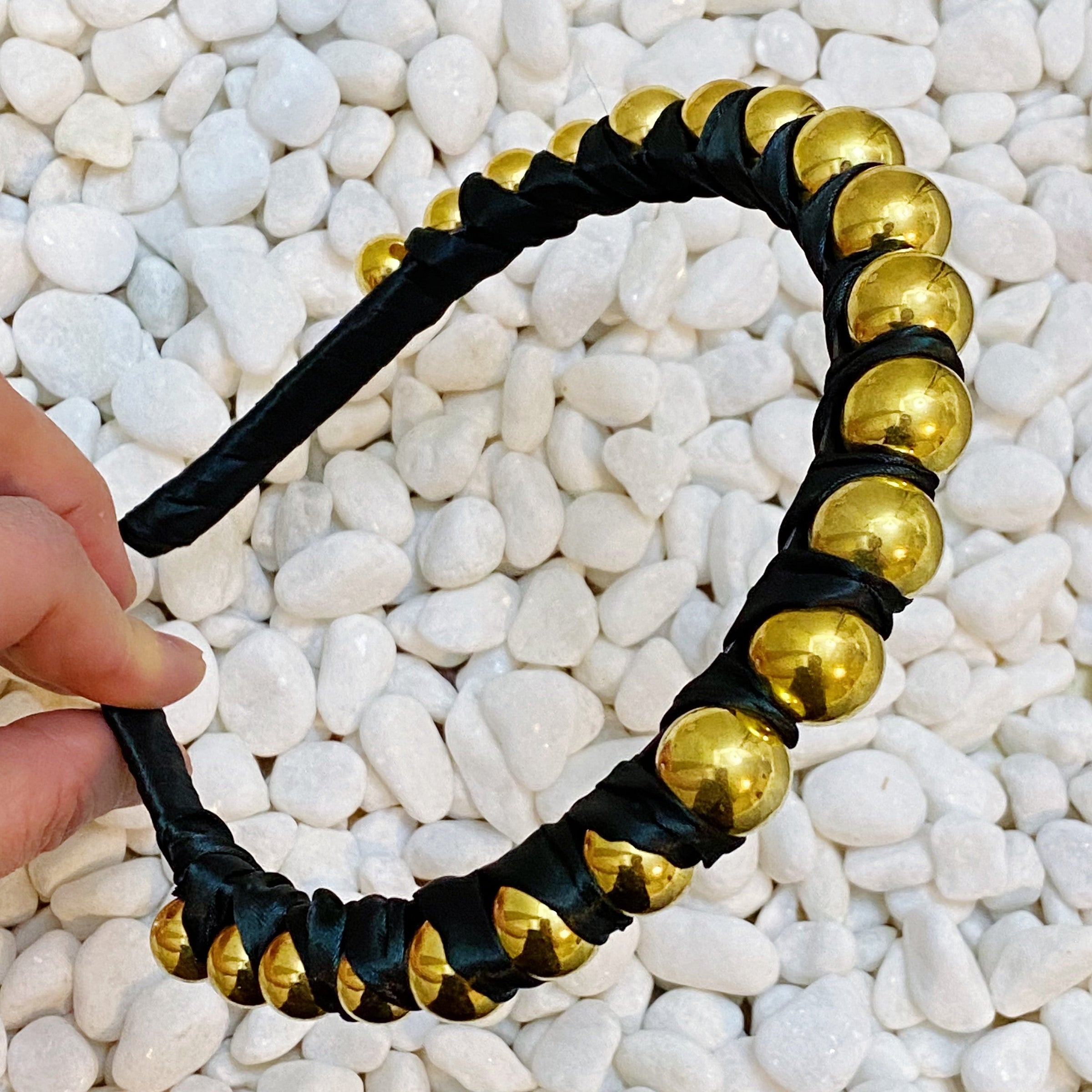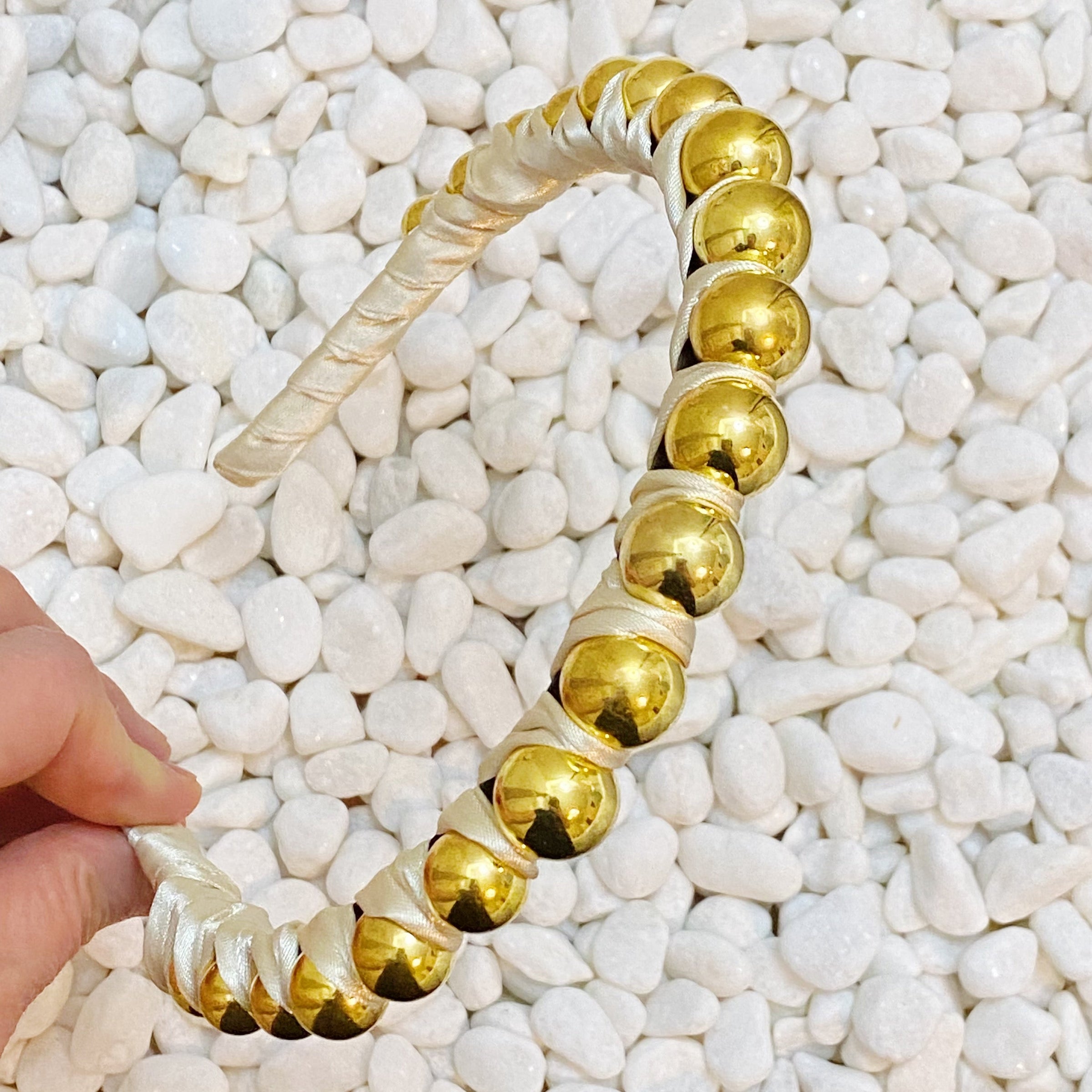 Golden ball beads are wrapped with beautiful silky satin fabric. Hand wrapped and has great details all around. Lightweight and comfy fit.