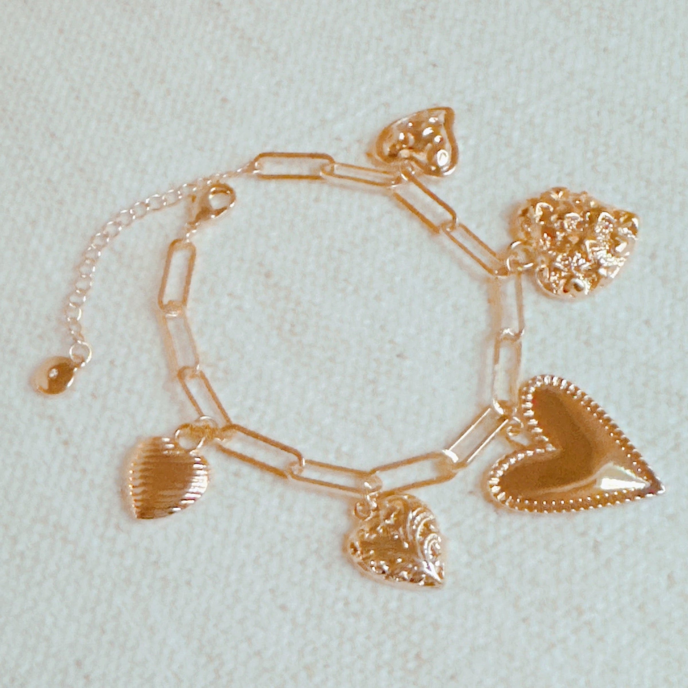 This bracelet features five romantic and charming hearts designed to add a lovely touch to any outfit. This bracelet is the perfect accessory for any occasion. With its delicate and intricate details, it will surely make the perfect gift for someone special in your life.