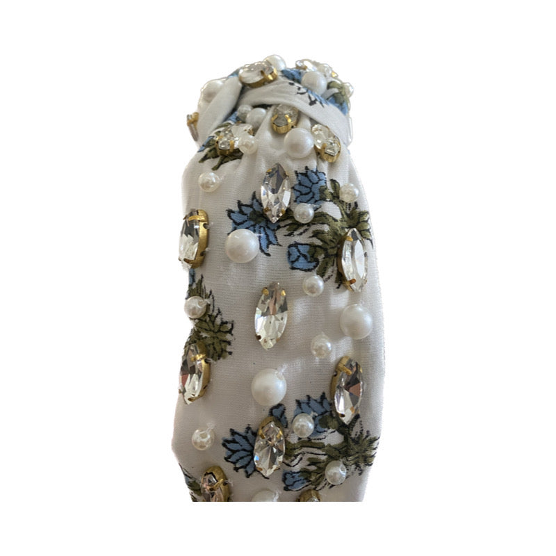 This beautiful floral print headband that is accented with rhinestone and pearl detail is perfect to wear all Spring and Summer.