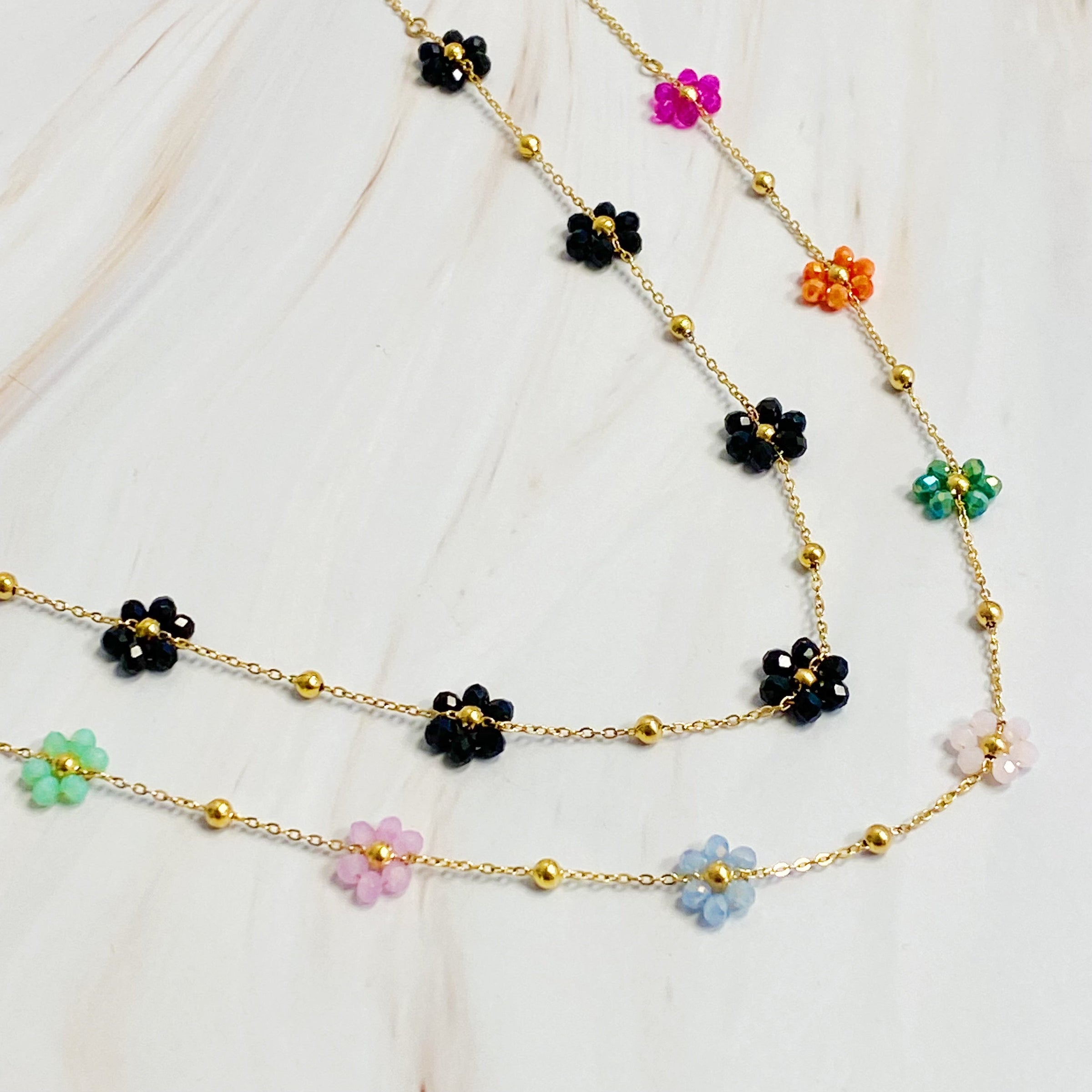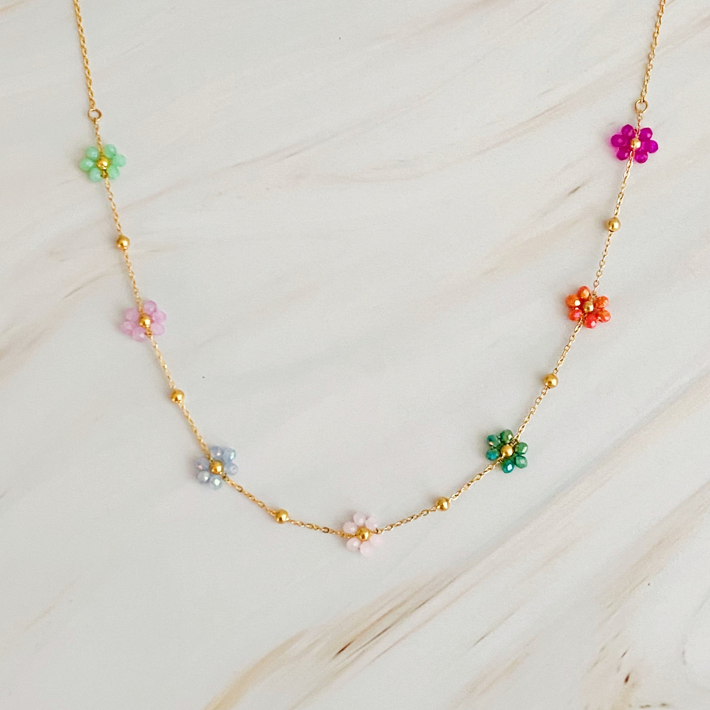Experience the whimsical charm of our Flower Field Romance Beaded Necklace. Adorned with beautifully colored flowers, and a dainty chain that is perfect for layering and adding a touch of romance to any outfit.