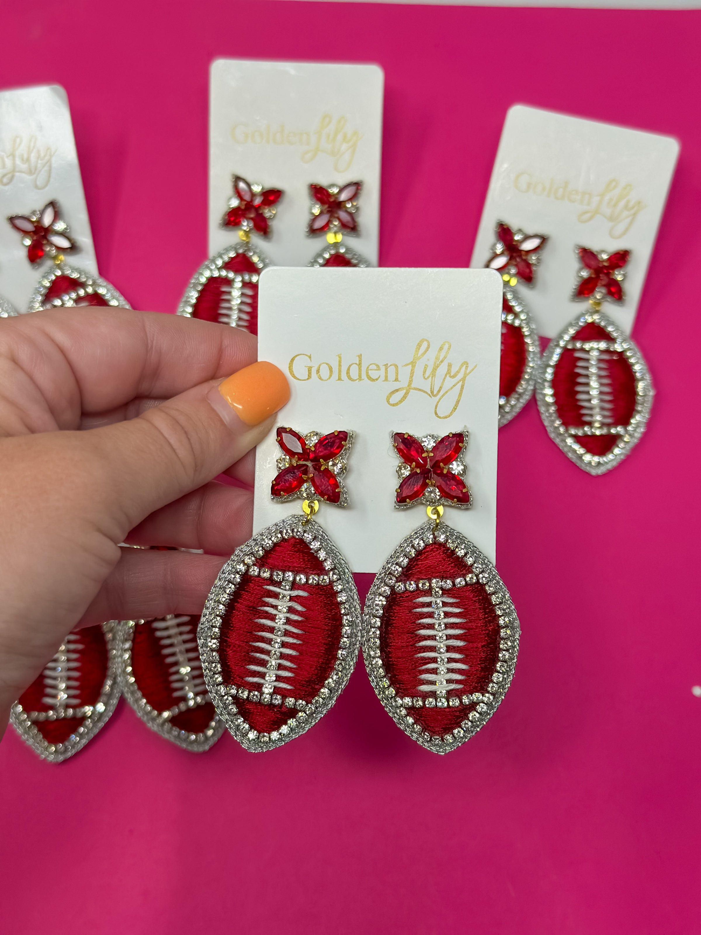 Cheer on your favorite team with our new Football Dangle Game Day Earrings. Embellished with rhinestone and thread detail.