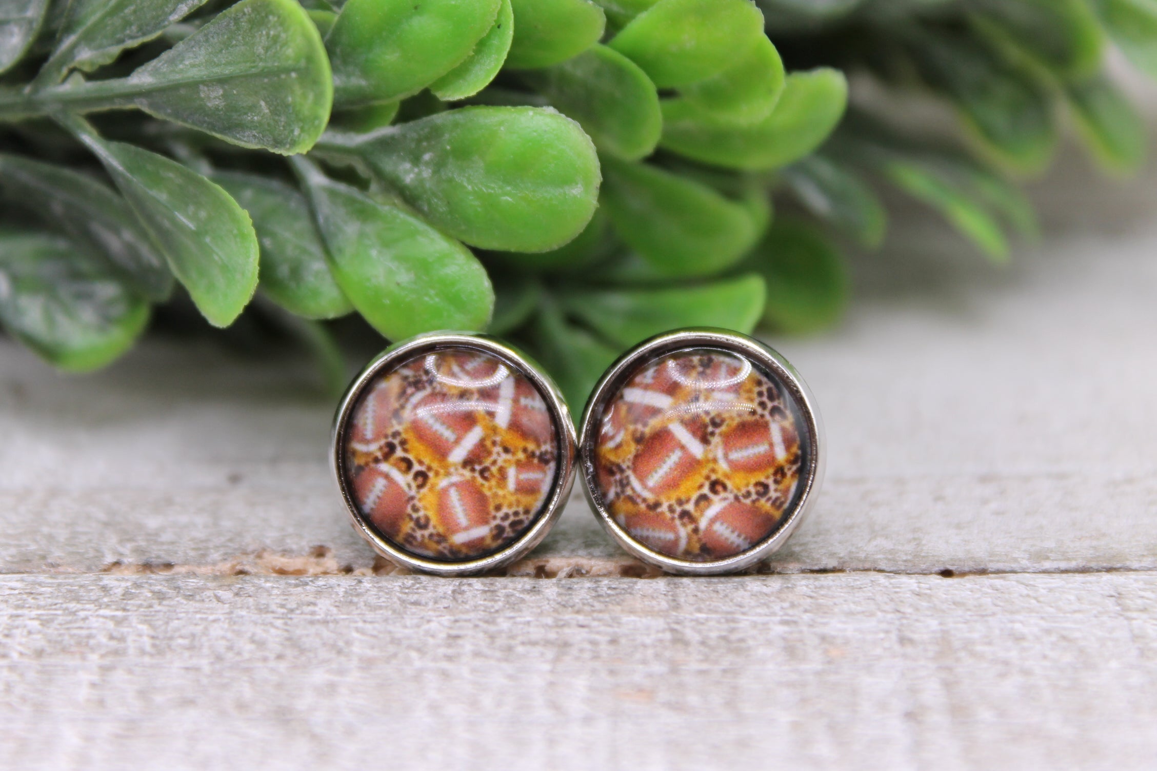 Footballs on Leopard || 12mm Glass Stud Earrings || Hypoallergenic