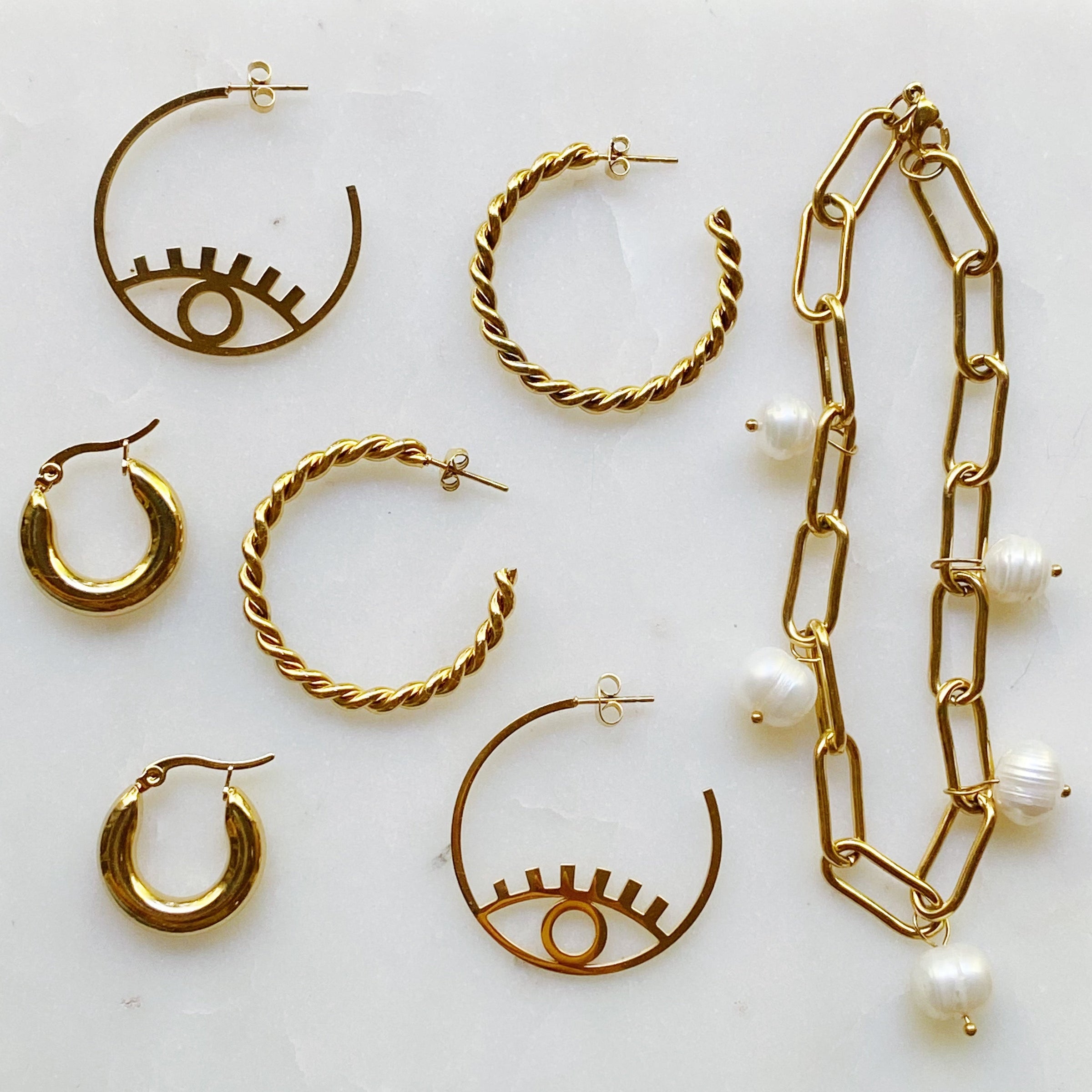 Stainless steel, 18 K gold plated. Great quality that will last long with no tarnish.