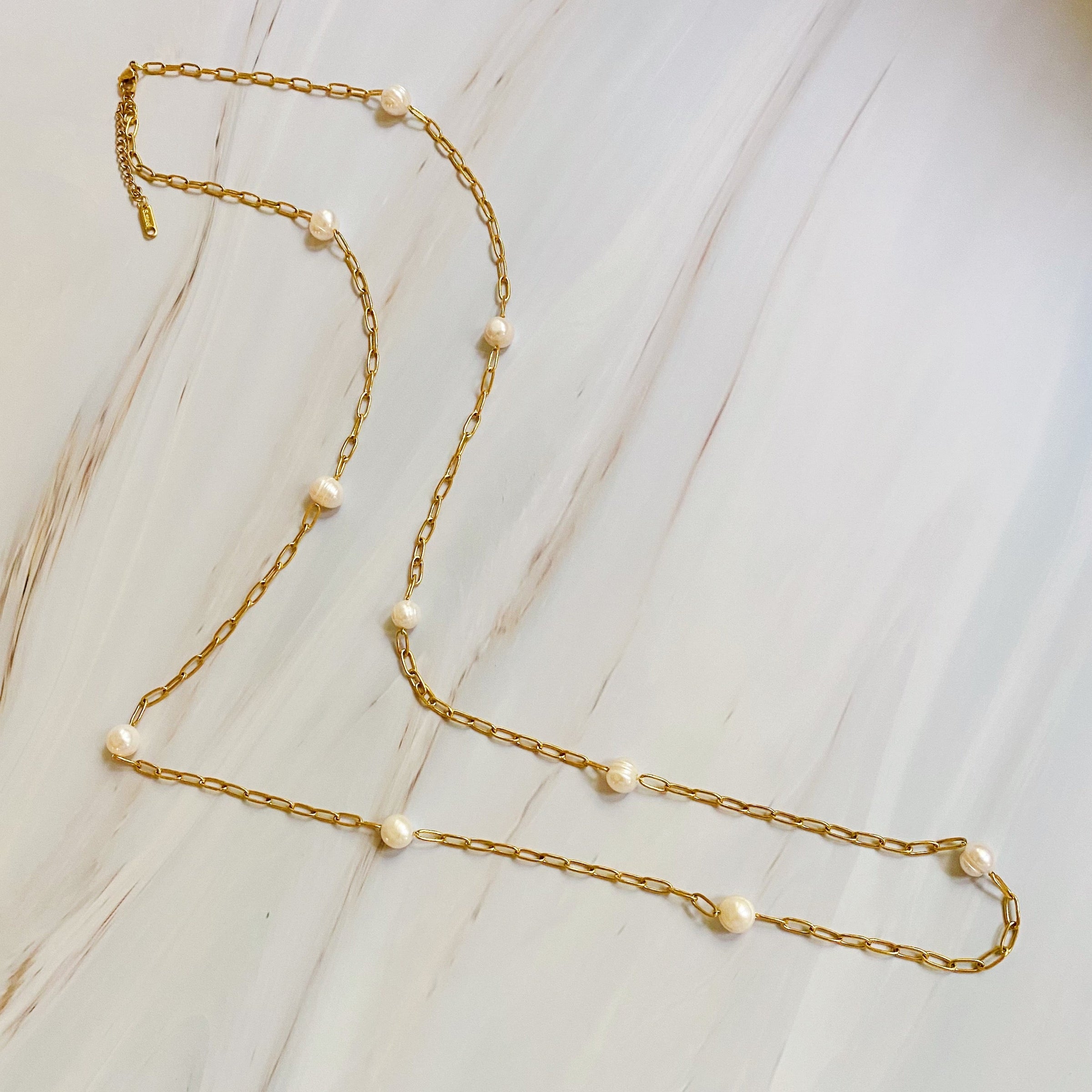 This Freshwater Pearl Long Chain Necklace is a timeless classic must-have. Real freshwater pearls and 18k gold-plated stainless steel chains create an elegant style necklace with maximum durability and tarnish-resistance.