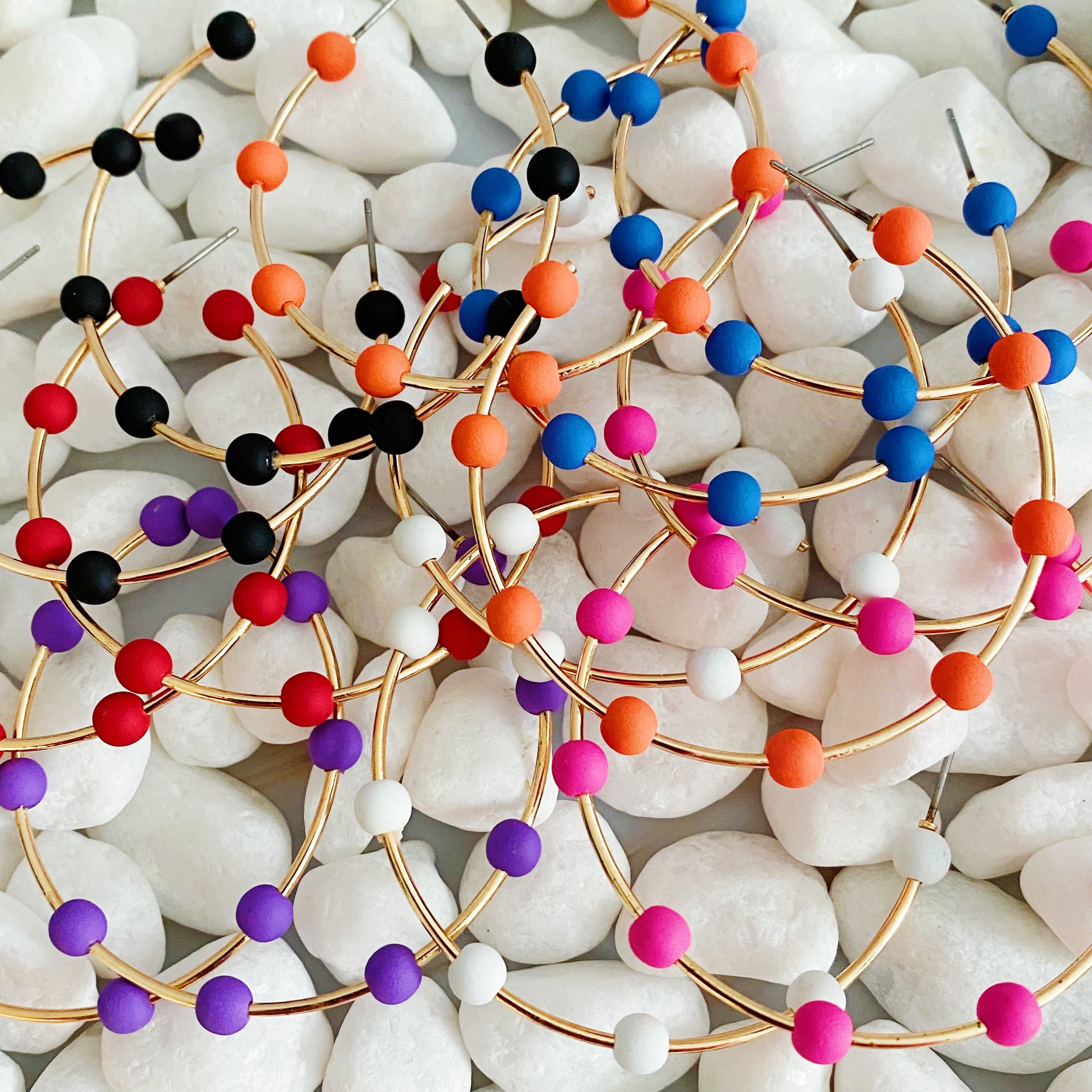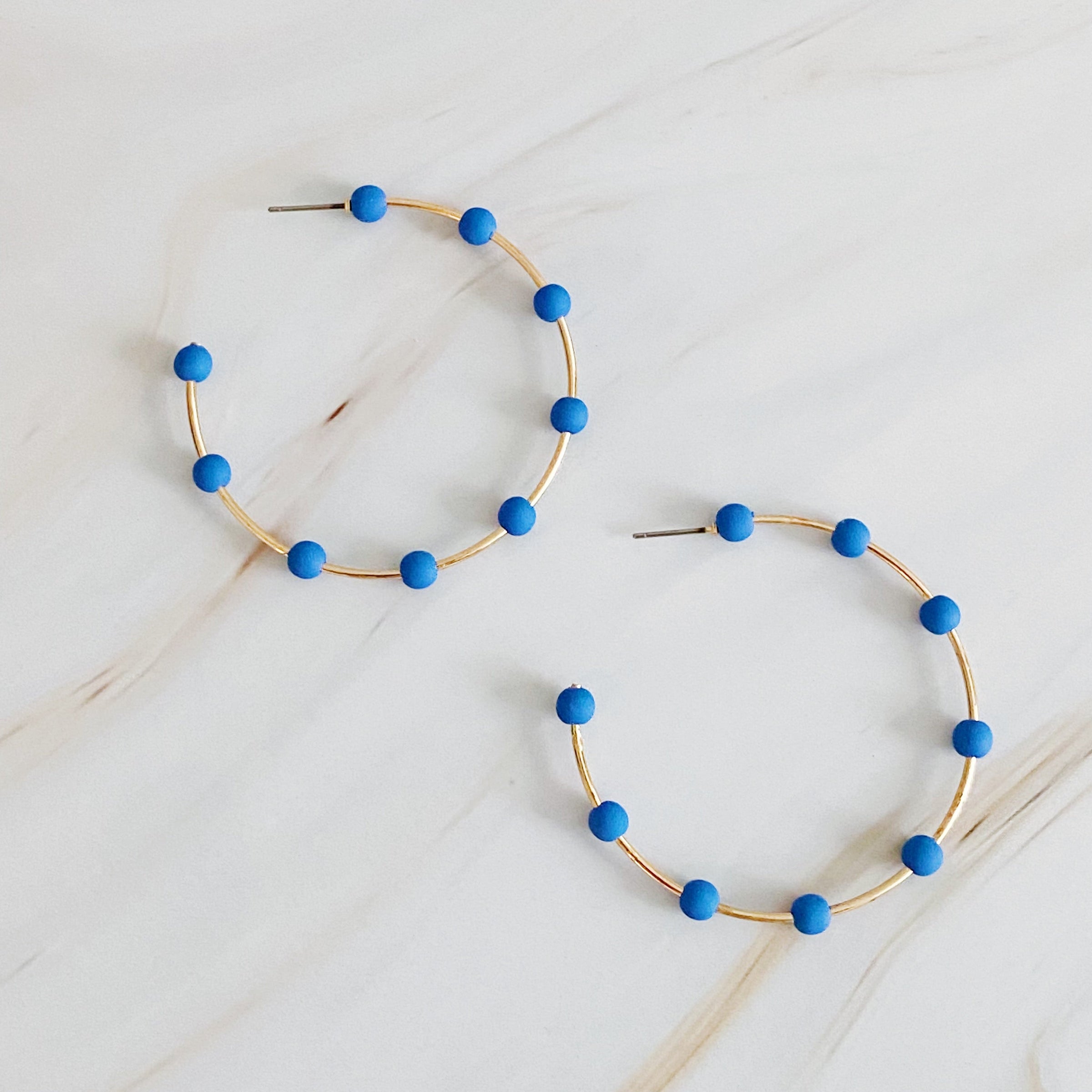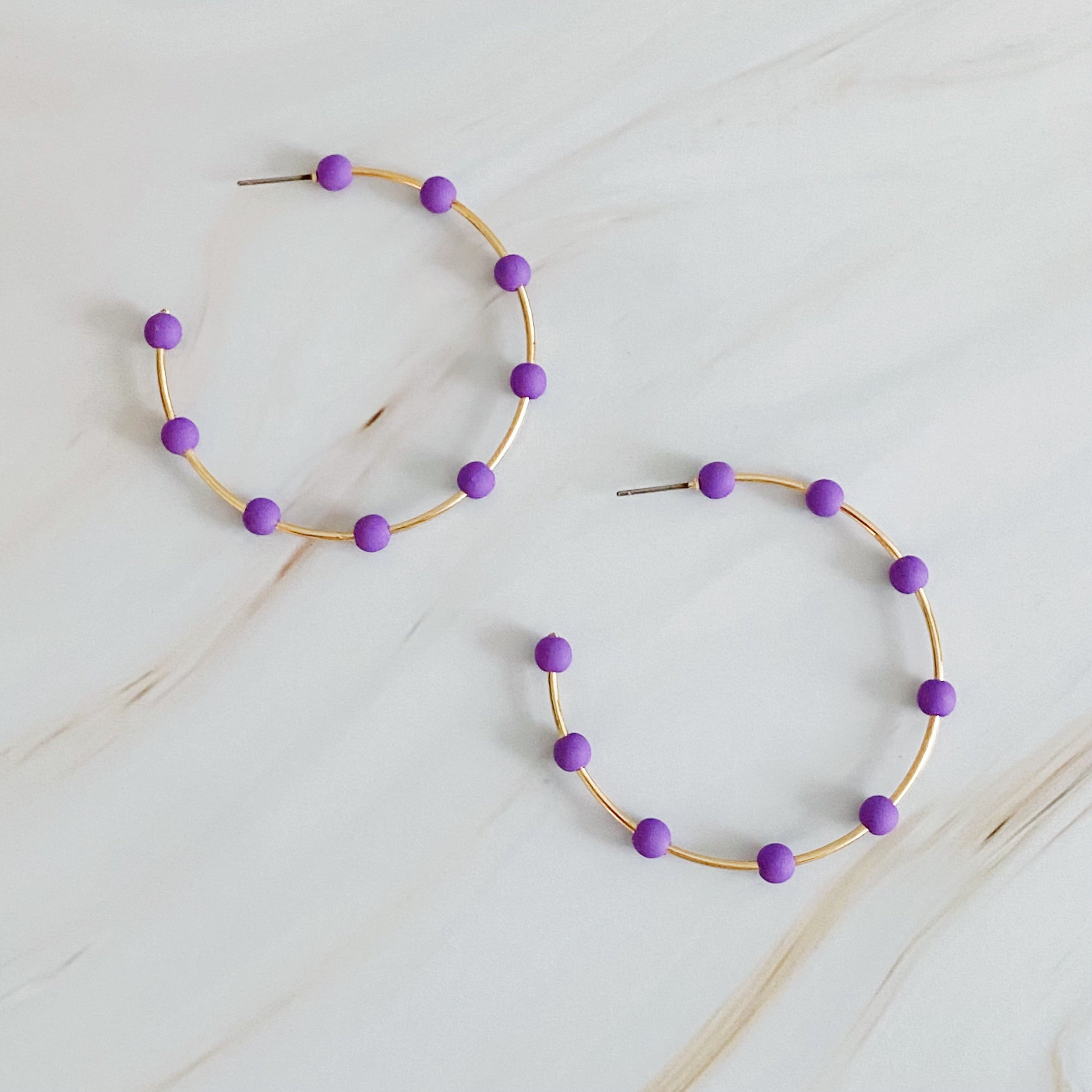 Brighten up your game day with these on-trend Games On Cloud Nine Hoop Earrings. Featuring a slim golden hoop with 9 rubber matt finish colored ball beads, these lightweight earrings are the perfect way to show off your team spirit. With adorable colors to choose from, you can add more style to any outfit.