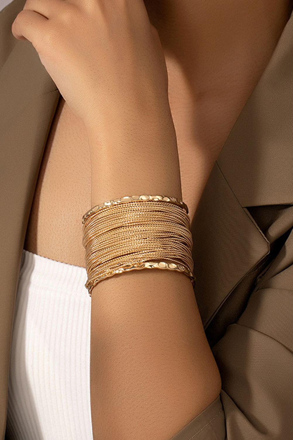 Spice up your style with a fancy plated finish! This chain linked design exudes trendiness and modern flair. Slip on the wide open cuff for a comfy and adjustable fit. Perfect for any occasion, this versatile piece can be dressed up or down.