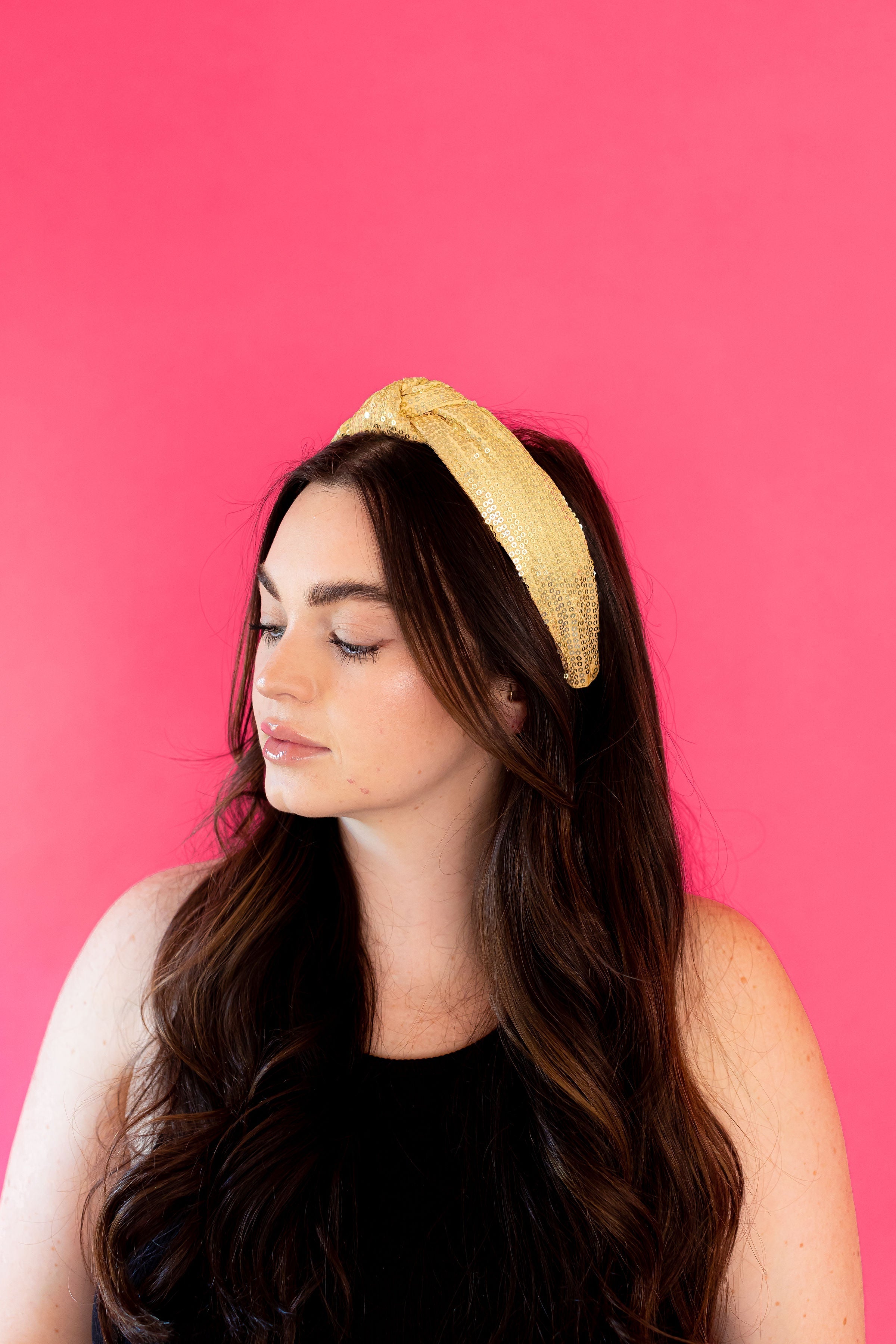 Headbands are super fun to wear any day and with any outfit. This one is a sequin gold knot headband.