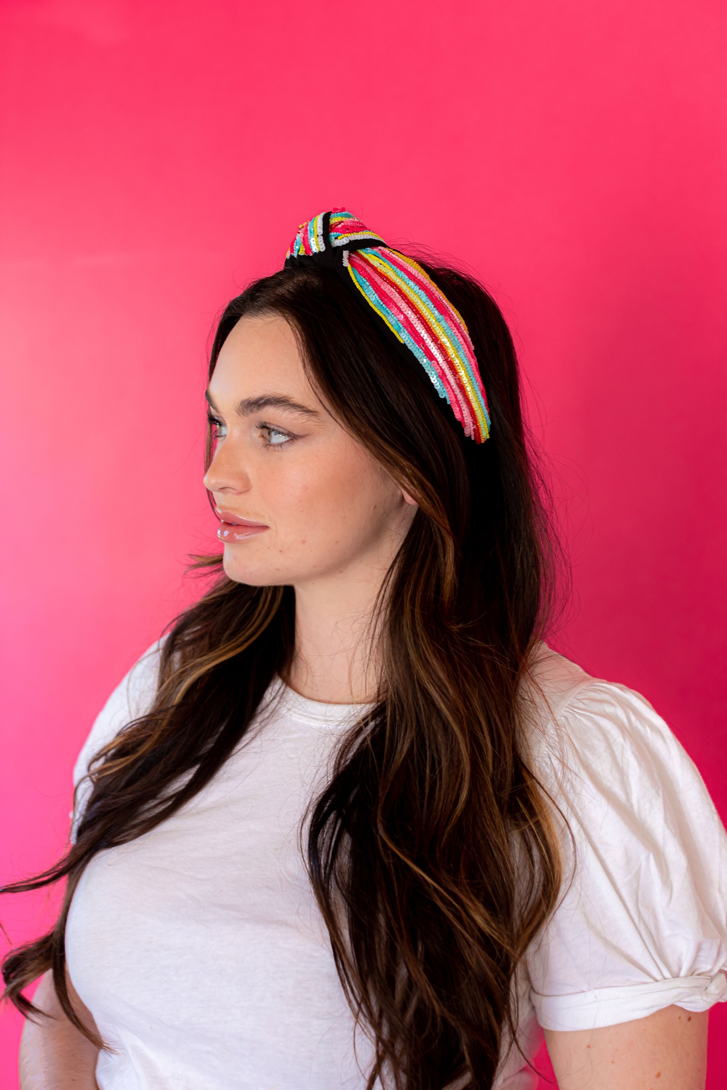 This rainbow sequin detailed knot headband is so fun to dress up or down. Pair with a solid black outfit or add a pop of color to any outfit.