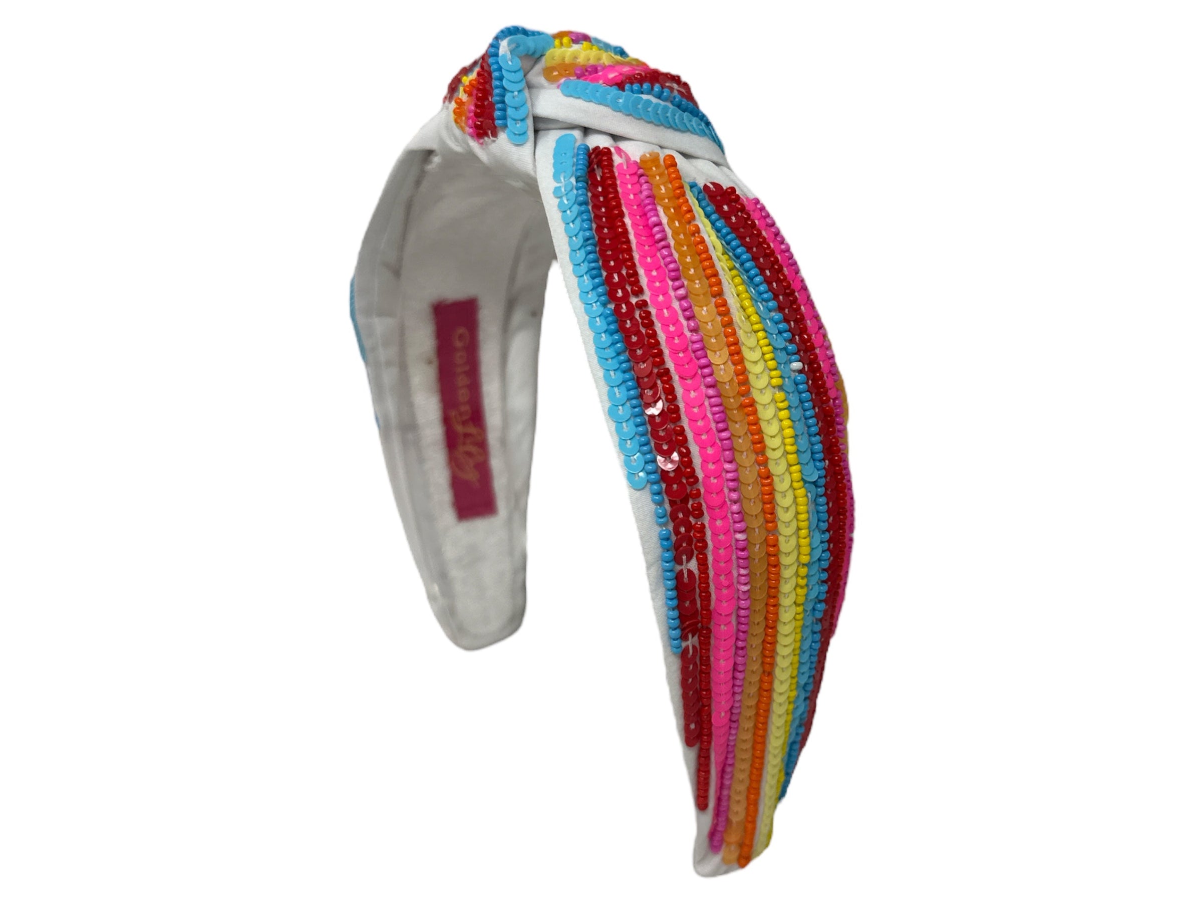 This rainbow sequin detailed knot headband is so fun to dress up or down. Pair with a solid black outfit or add a pop of color to any outfit.