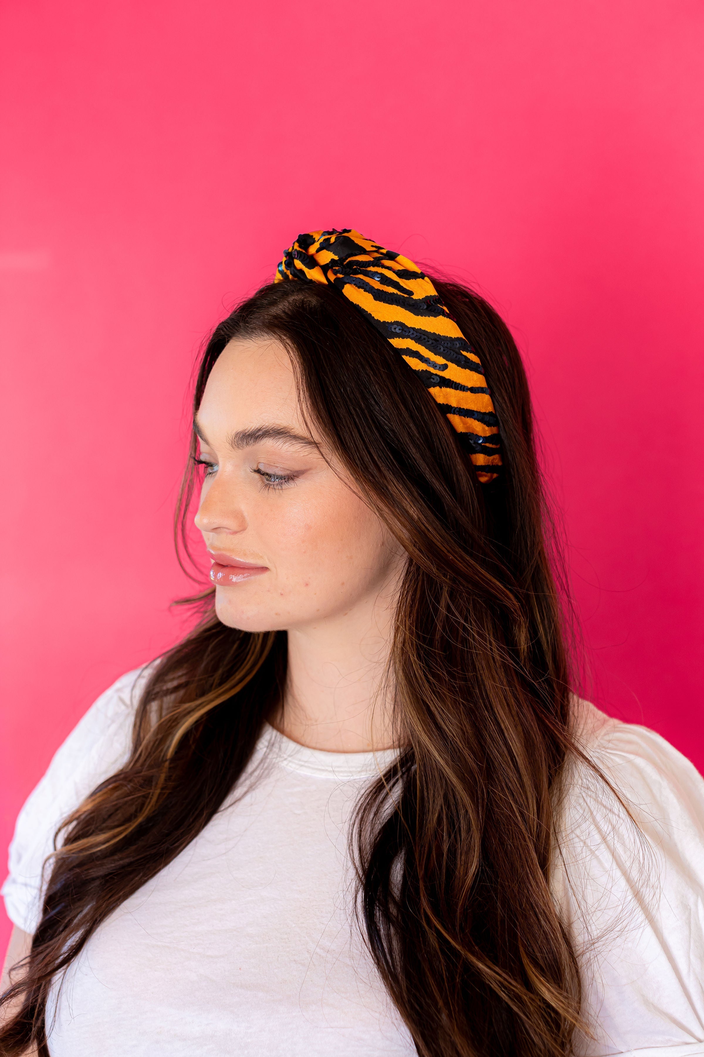 This tiger print headband is fun to throw on with any Game Day outfit. Embellished with black sequin detail.
