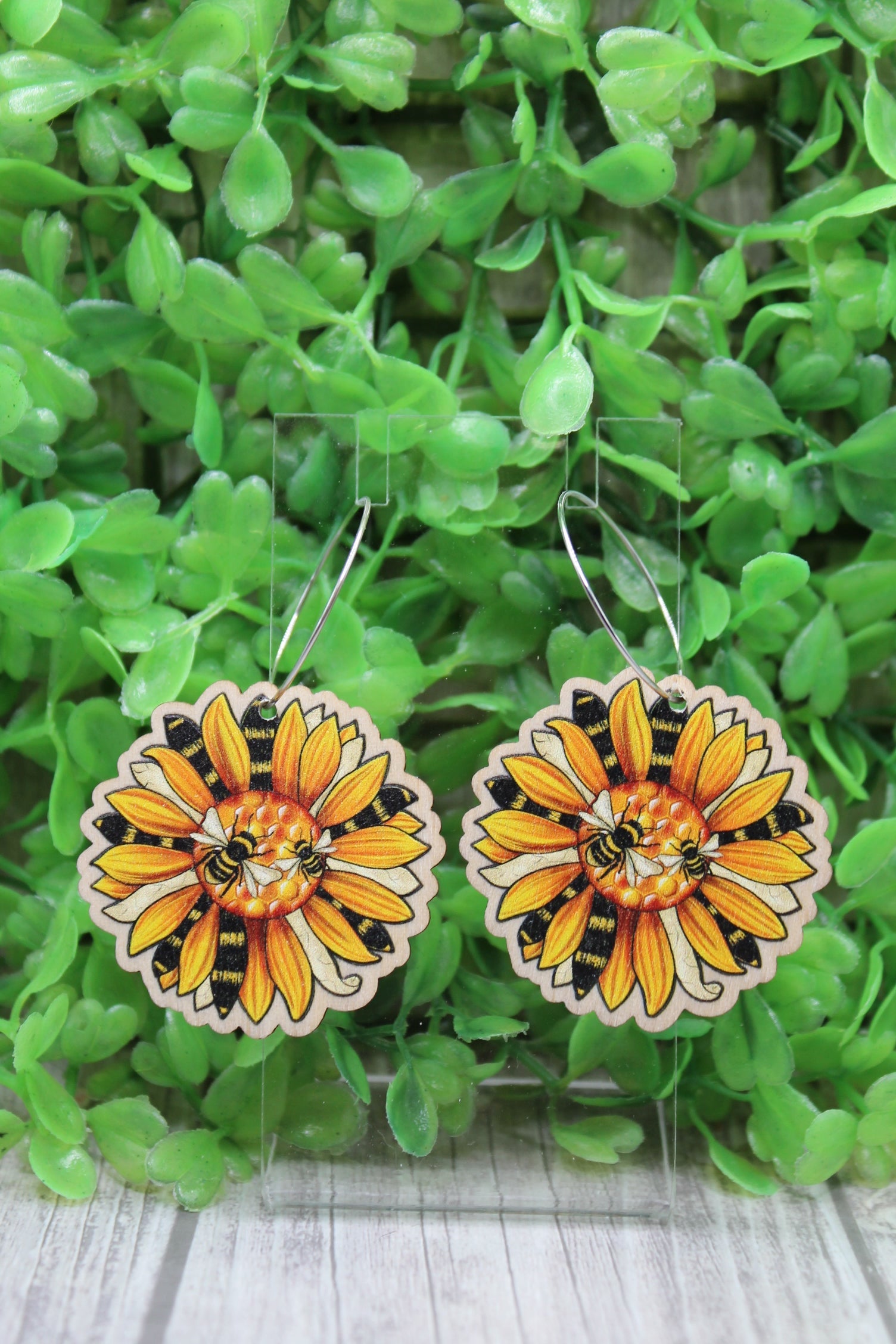 Honey Bee Sunflower Wood Hoop Dangle Earrings