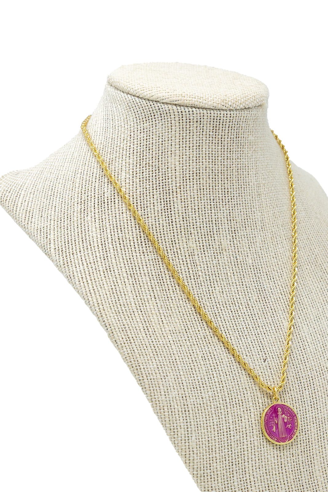 The Hot Pink Saint Necklace adds a pop of color to your wardrobe without sacrificing style. Show off your unique sense of fashion (and humor) with this quirky statement piece. Perfect for those who don't take themselves too seriously, this necklace is sure to make a bold impression. (Exclamation point here!)