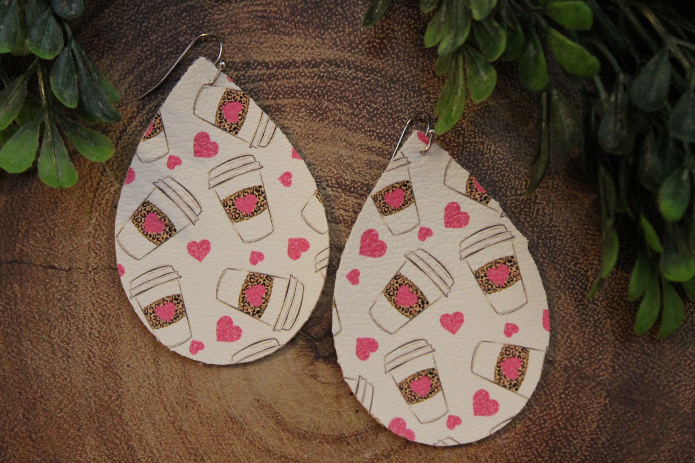 Lattes and Hearts || Faux Leather Teardrop Dangle Earrings || Single-Sided