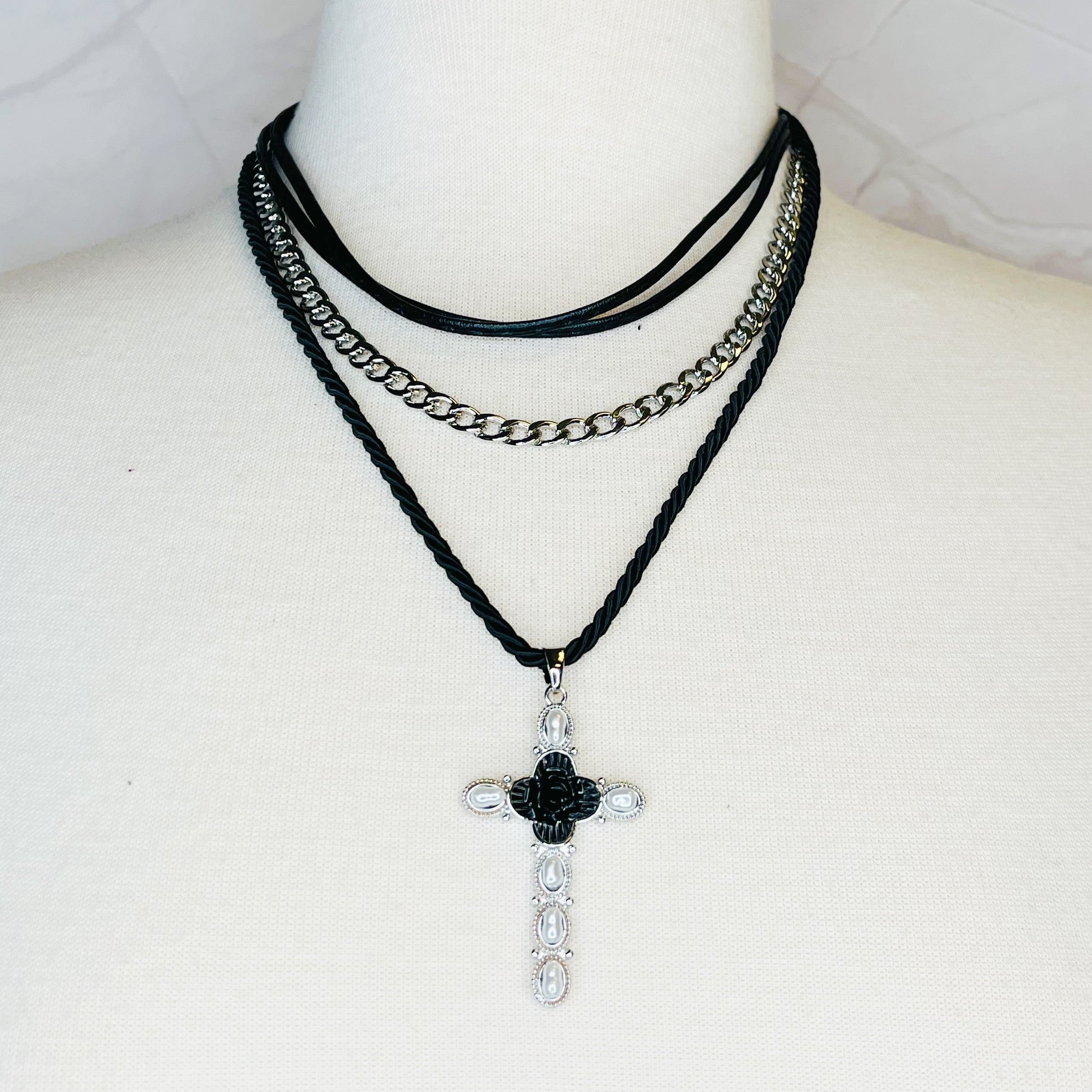 Layered Black Rose Cross Necklace