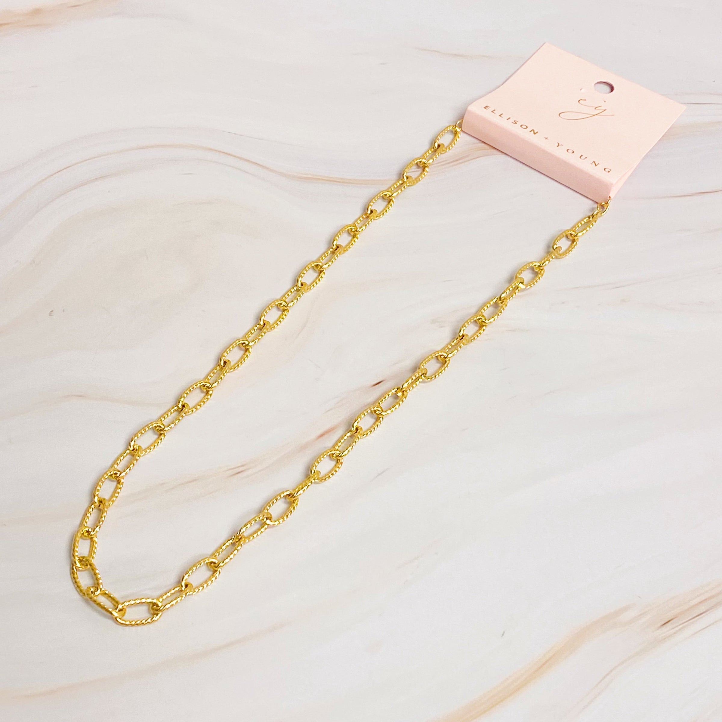 This Link Lynk Chain Necklace is crafted with a classic linked design and a unique textured finish. Made with quality materials, this necklace is the perfect accessory to elevate any outfit, and offers a timeless design perfect for layering.