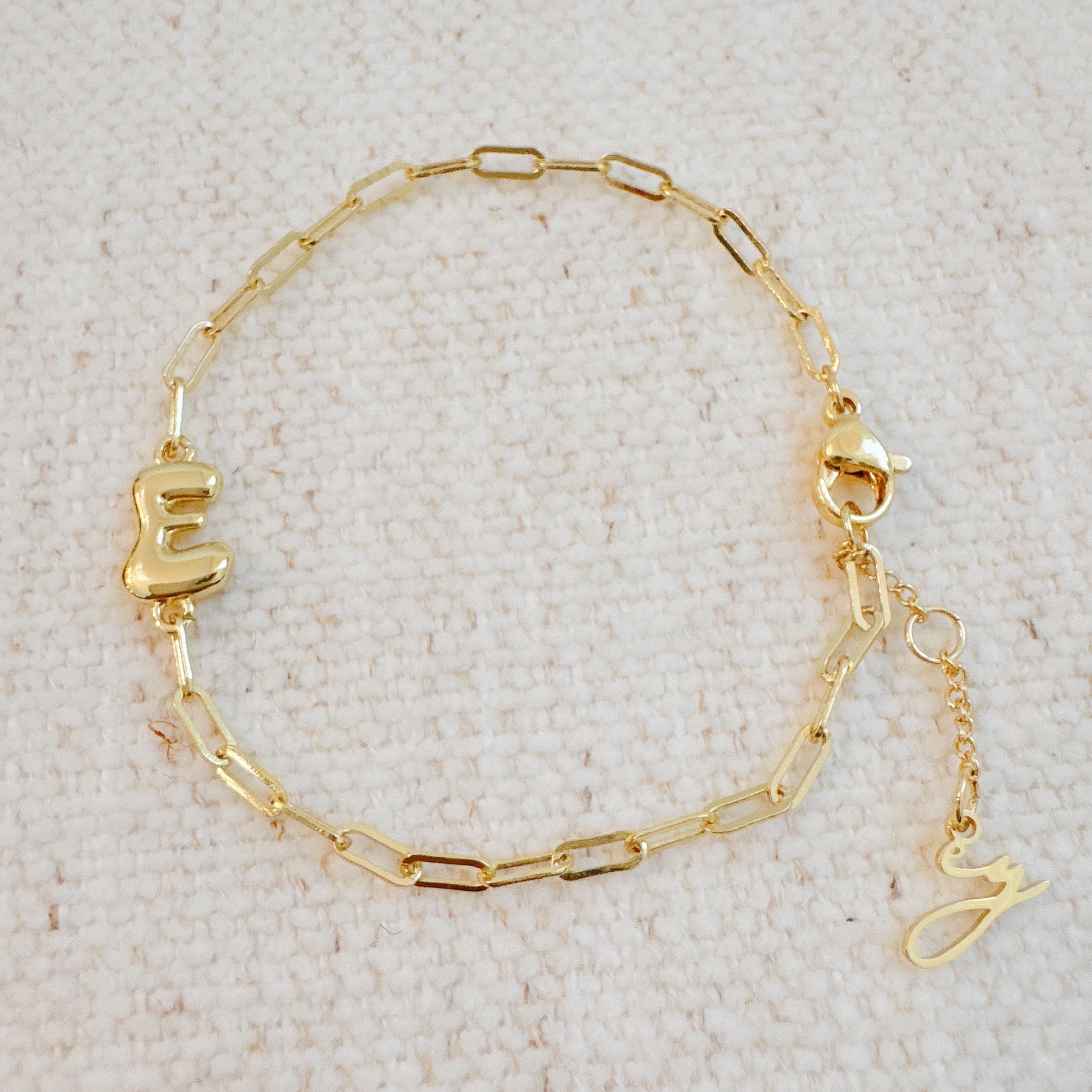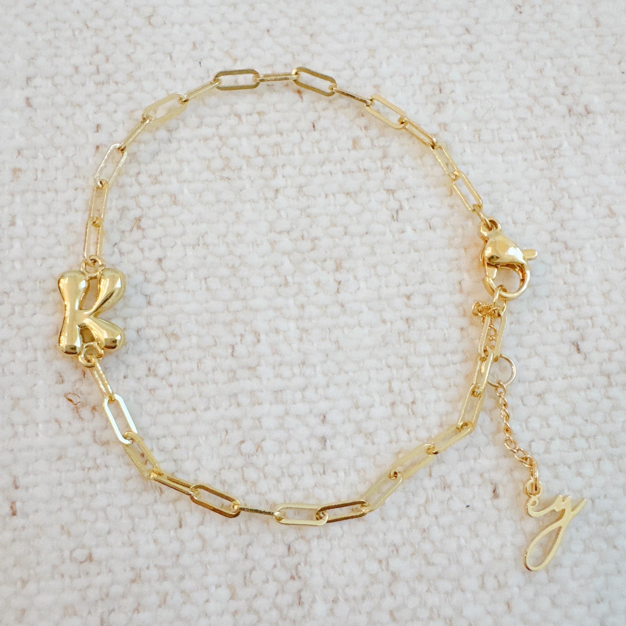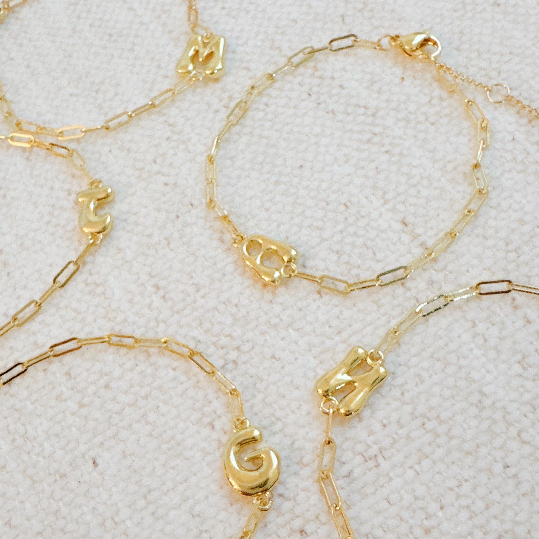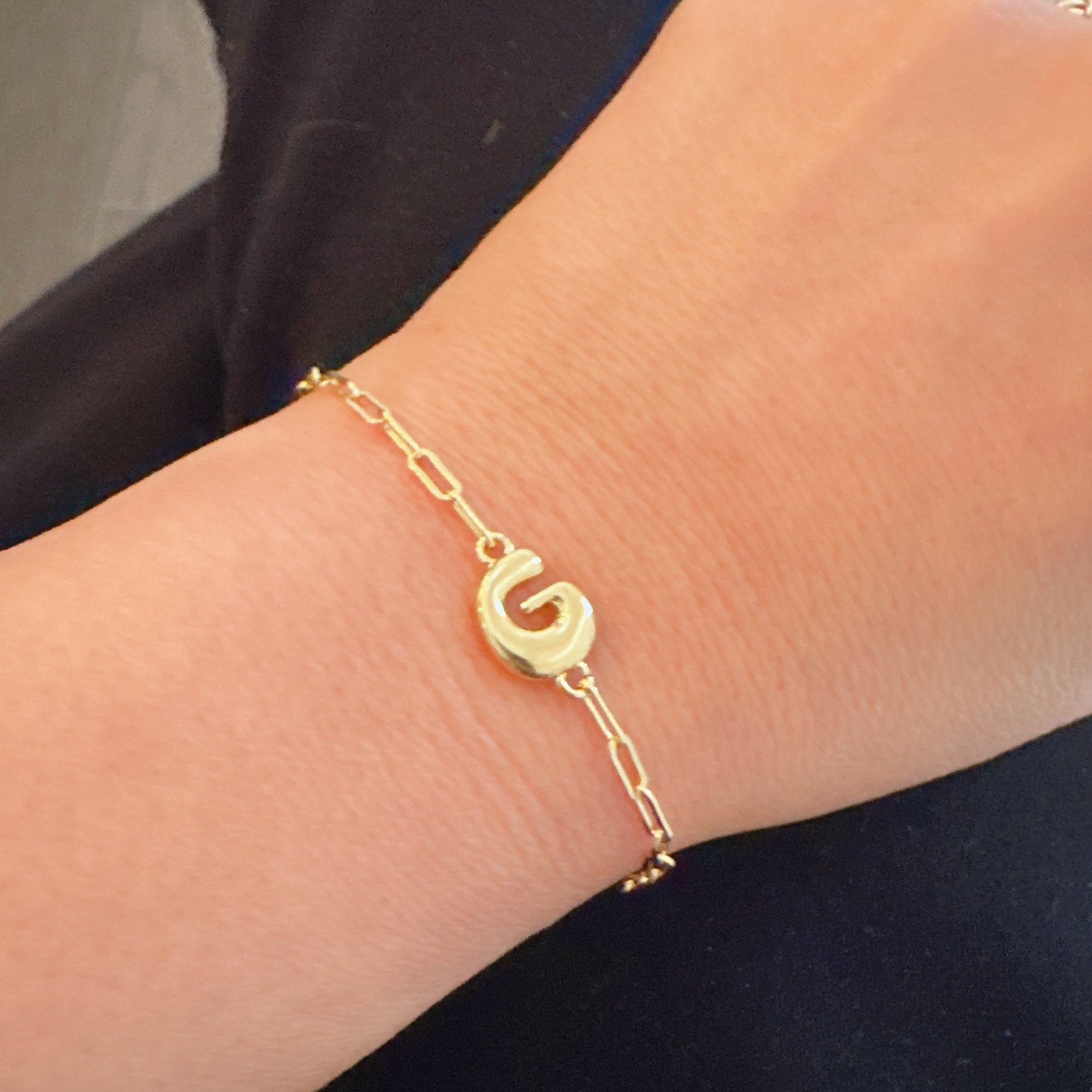 This modern mini balloon initial bracelet is a stylish accessory that can be personalized with your chosen initials. Crafted with a sleek design, it adds a touch of uniqueness to any outfit.