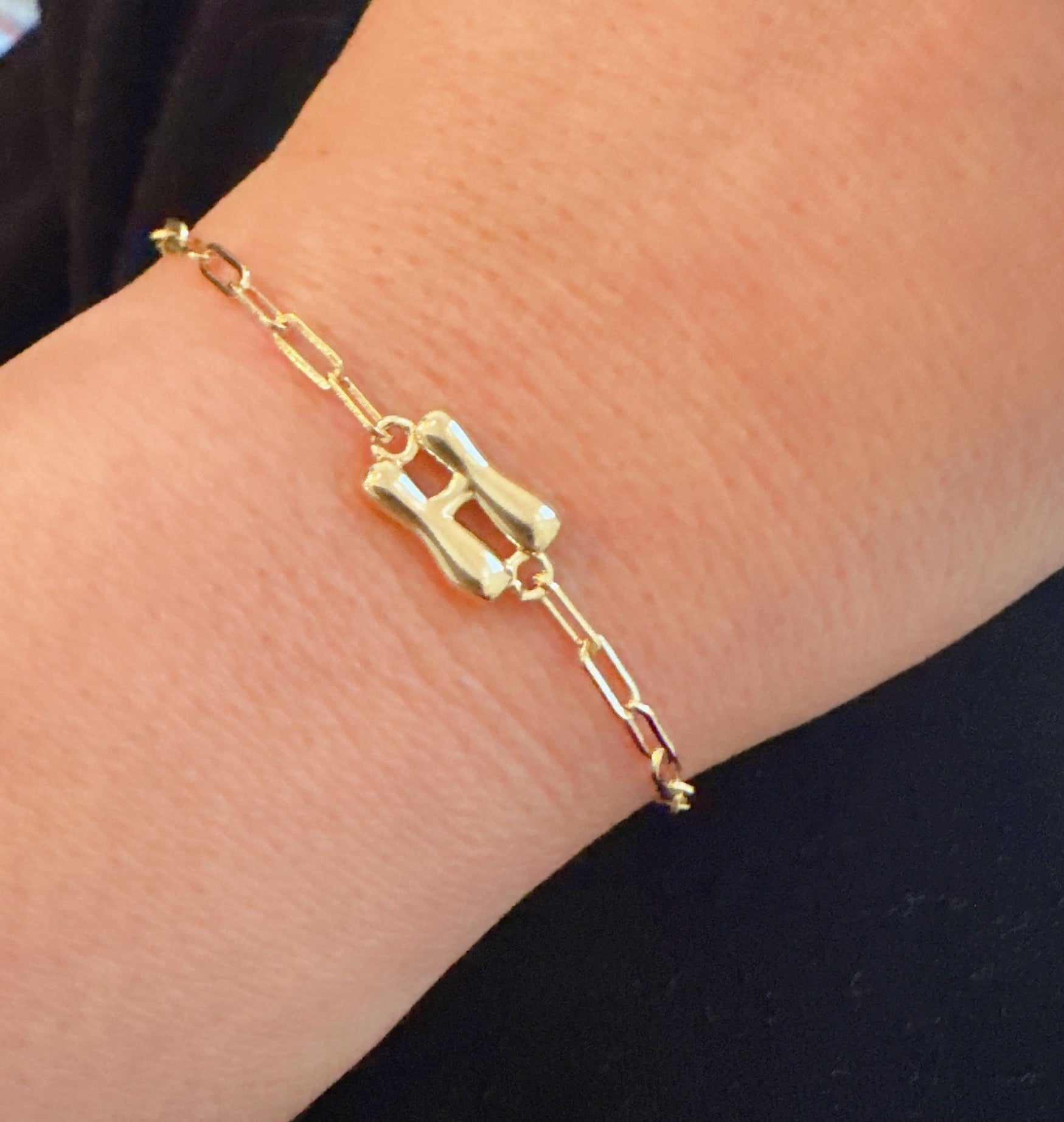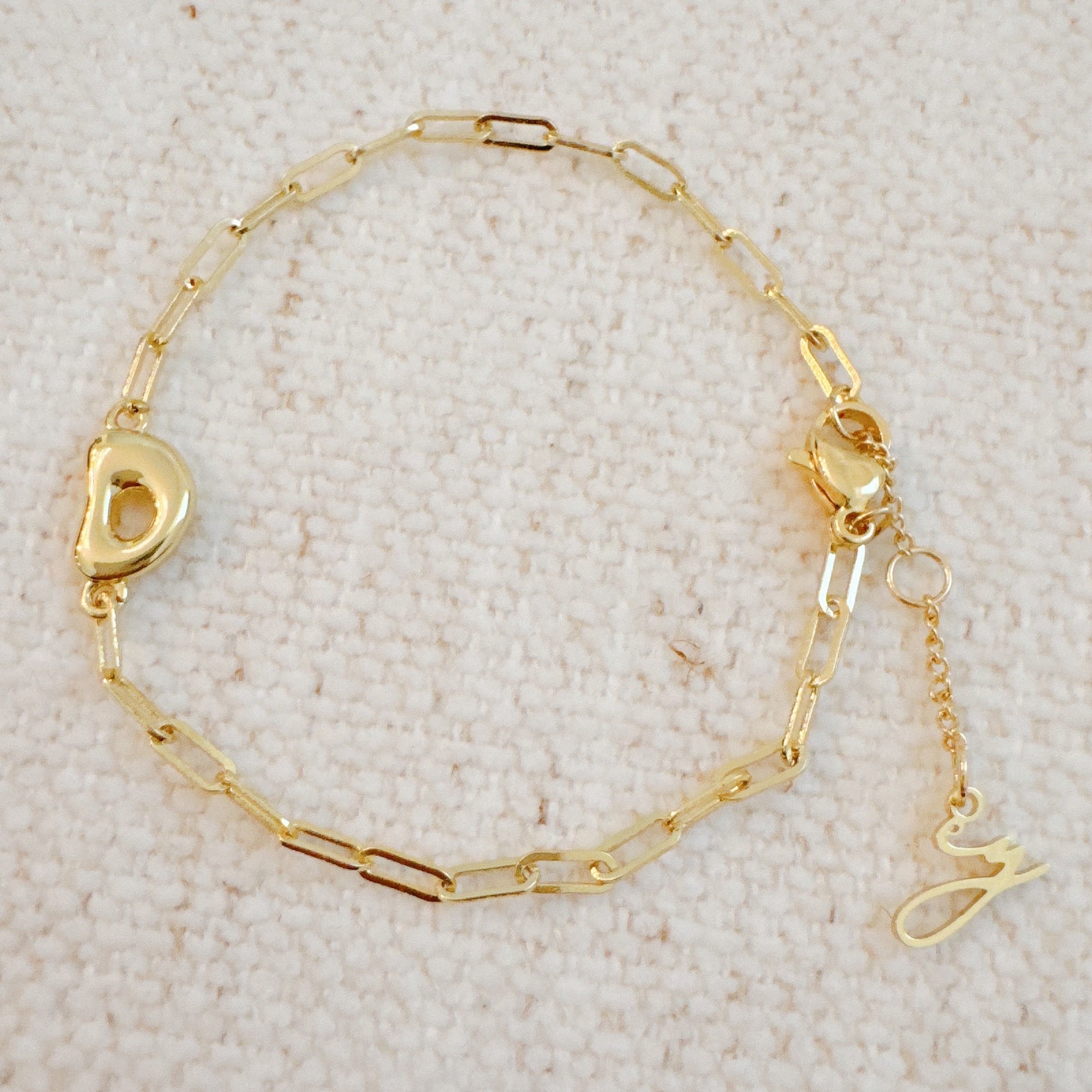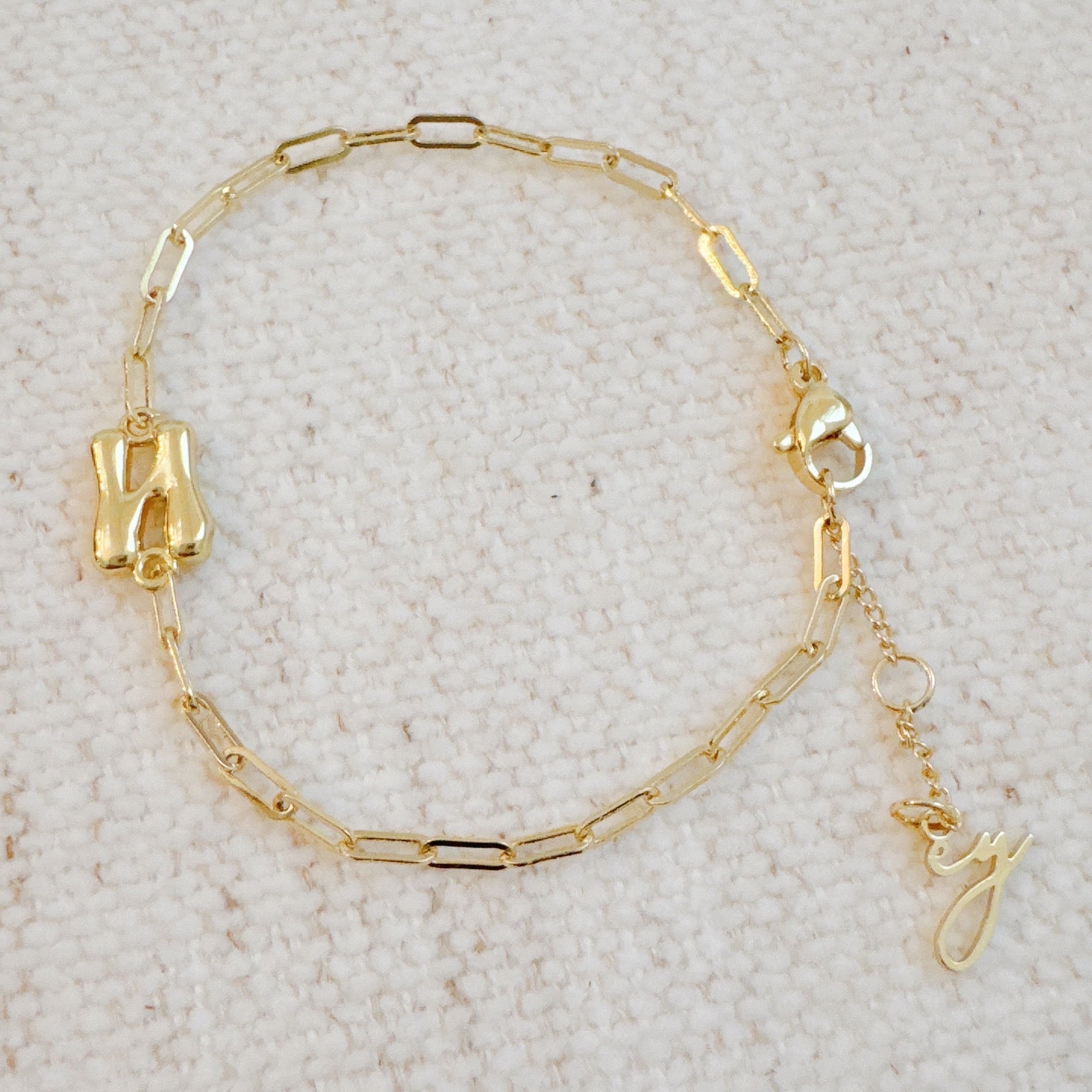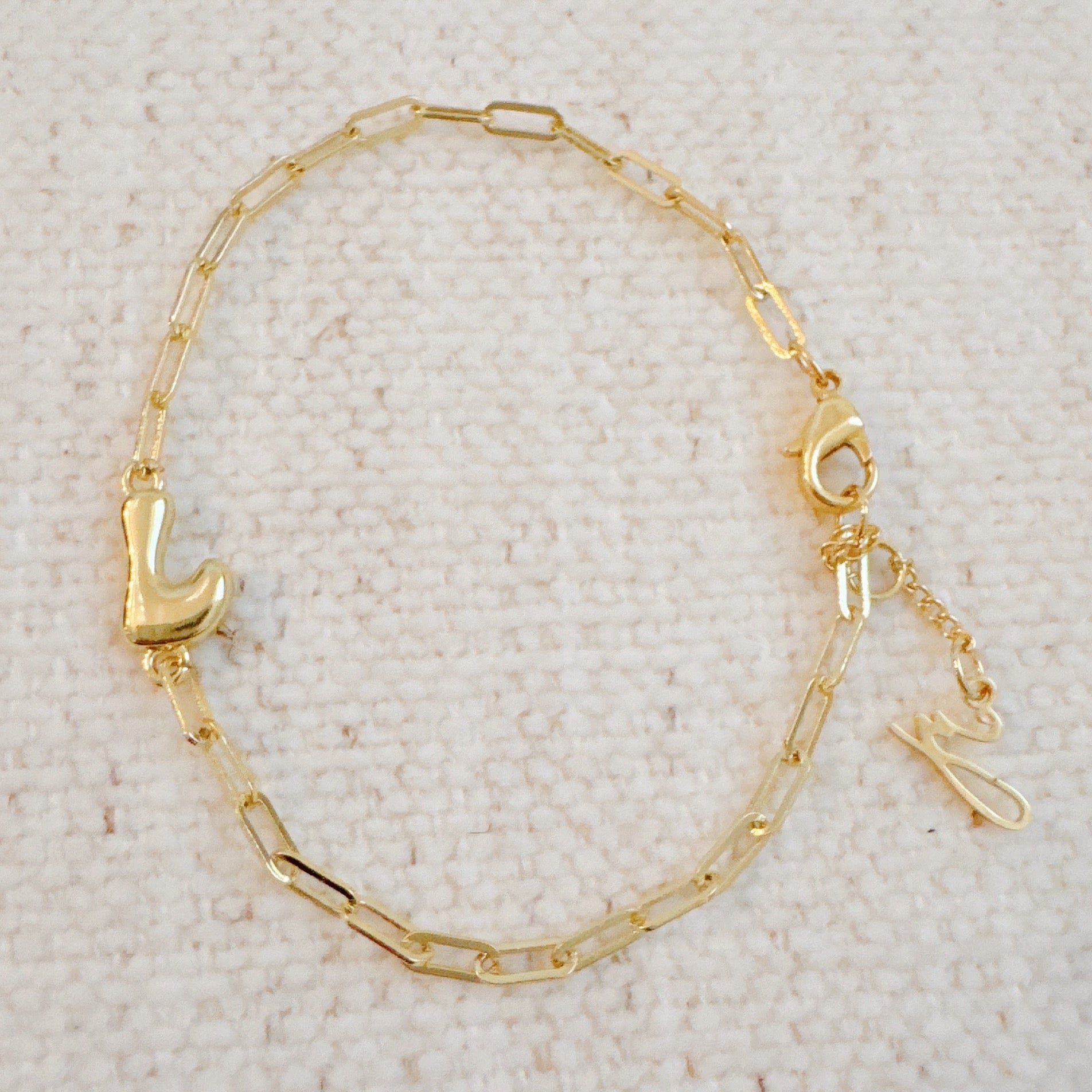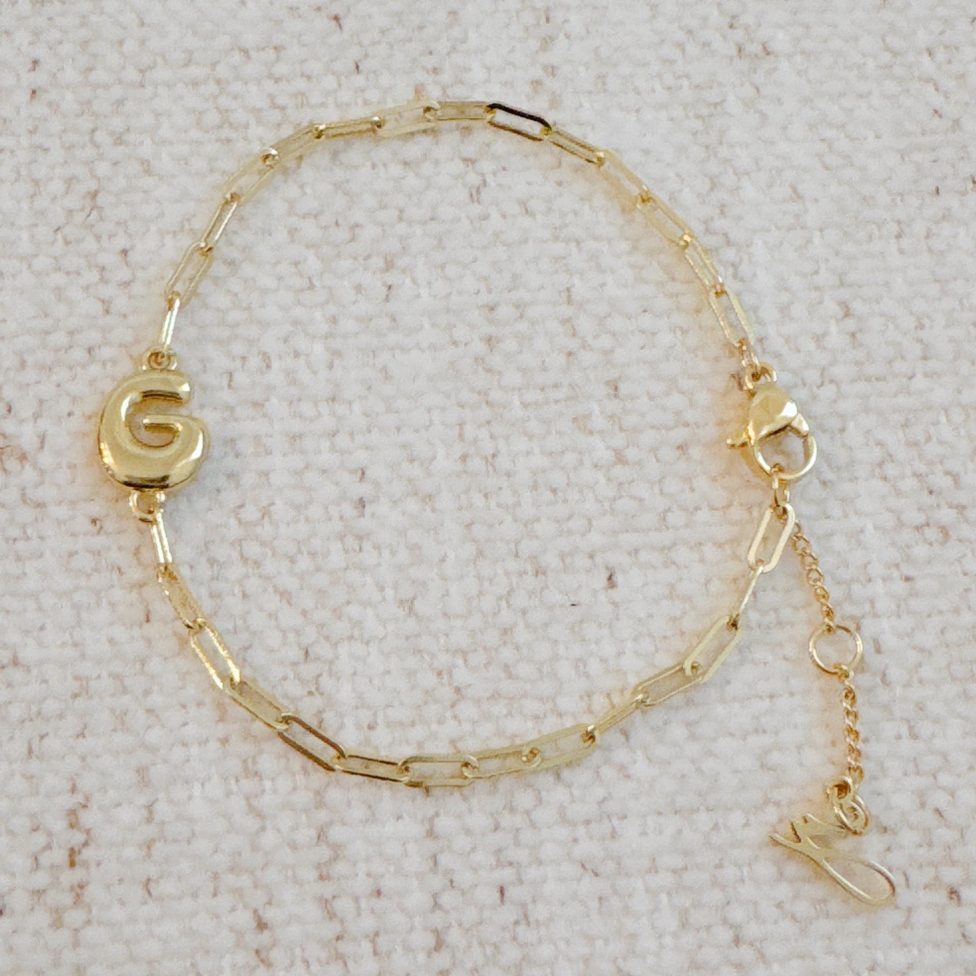 This modern mini balloon initial bracelet is a stylish accessory that can be personalized with your chosen initials. Crafted with a sleek design, it adds a touch of uniqueness to any outfit.