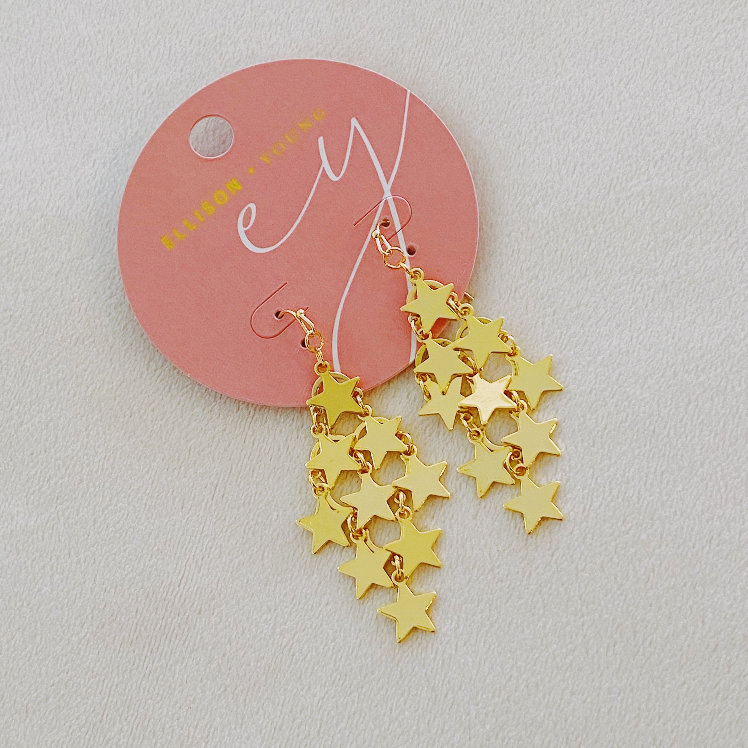 Elevate your style with our Nine Stars Lined Chandelier Earrings. The golden stars add a touch of sophistication while the delicate draping adds a subtle and elegant touch. Perfect for any occasion, these earrings are a must-have for everyday wear.