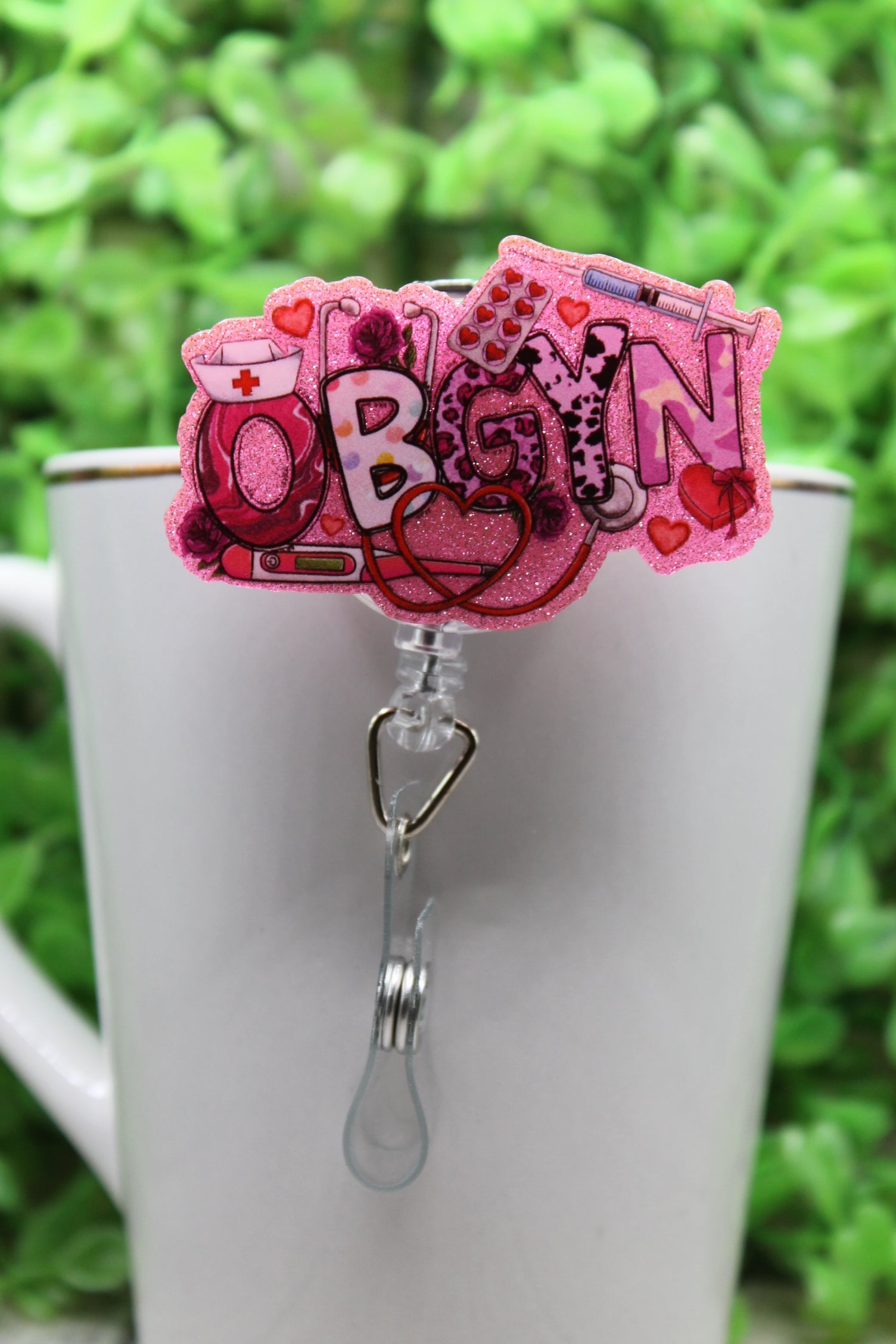 OBGYN Pink Glitter • Badge/ID Holder with Alligator Clip