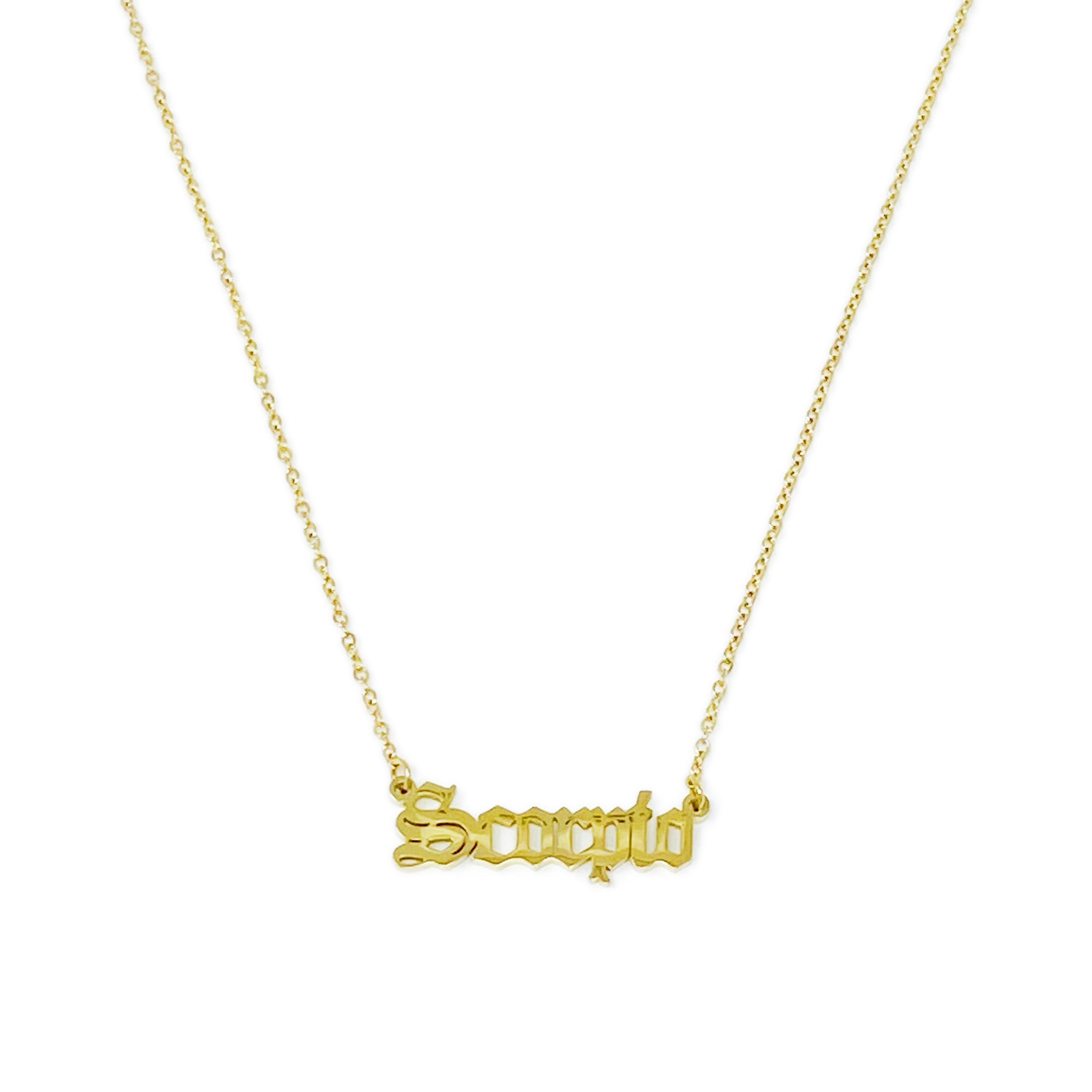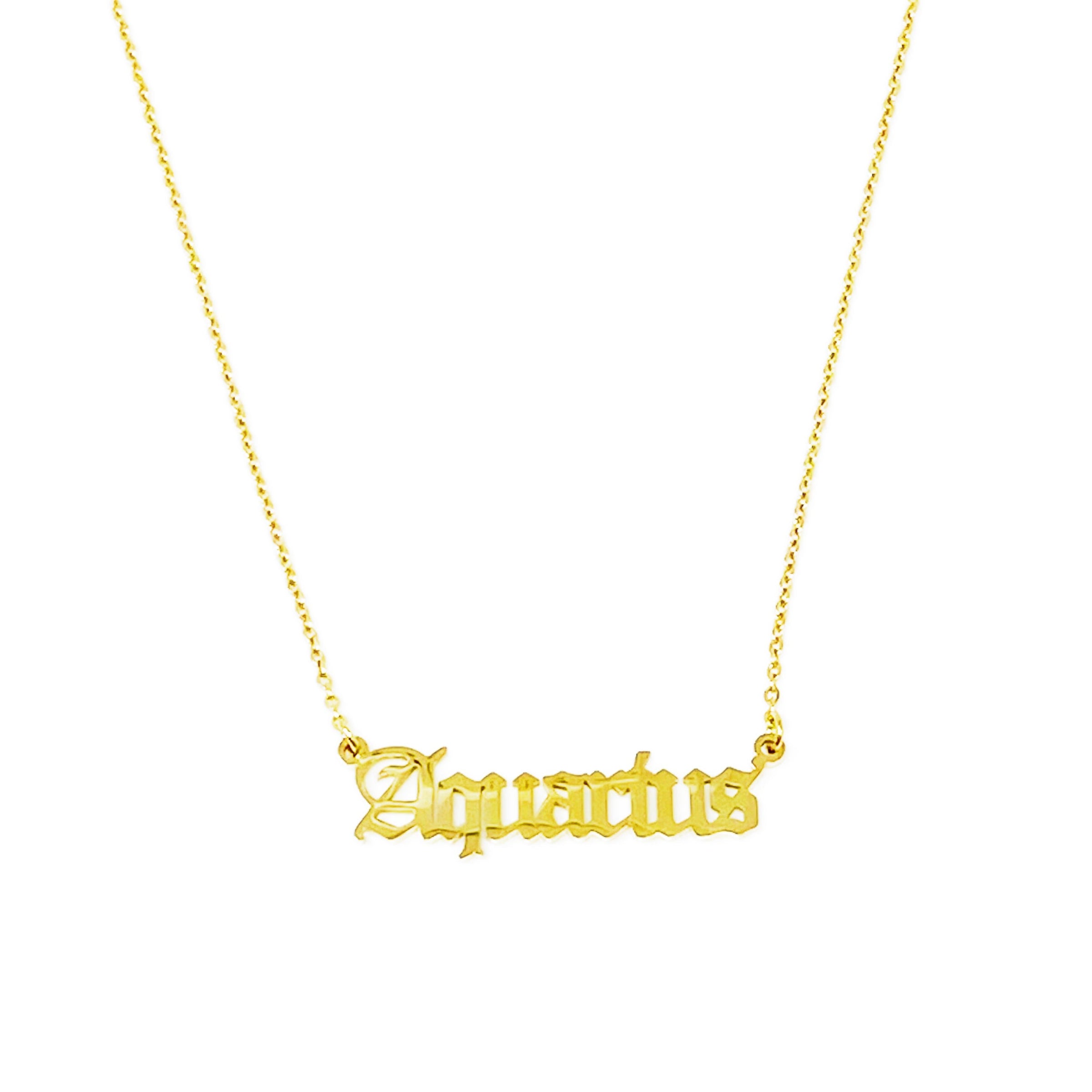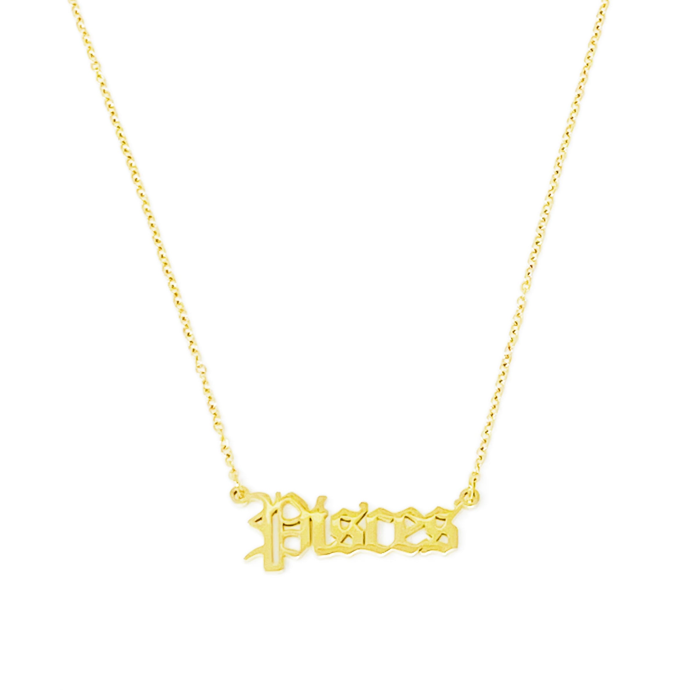 Now trending: zodiac names in an Olde English font. Each zodiac is beautifully lettered in a classy font, made with a dense, high-quality metal. Great to wear on its own or layer with any necklace in your collection!