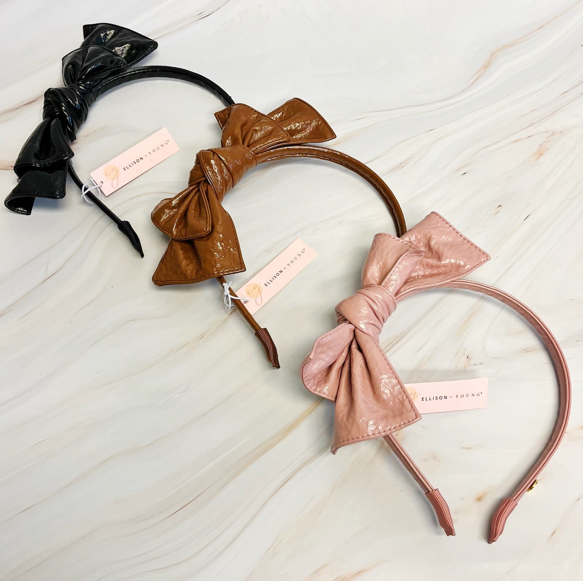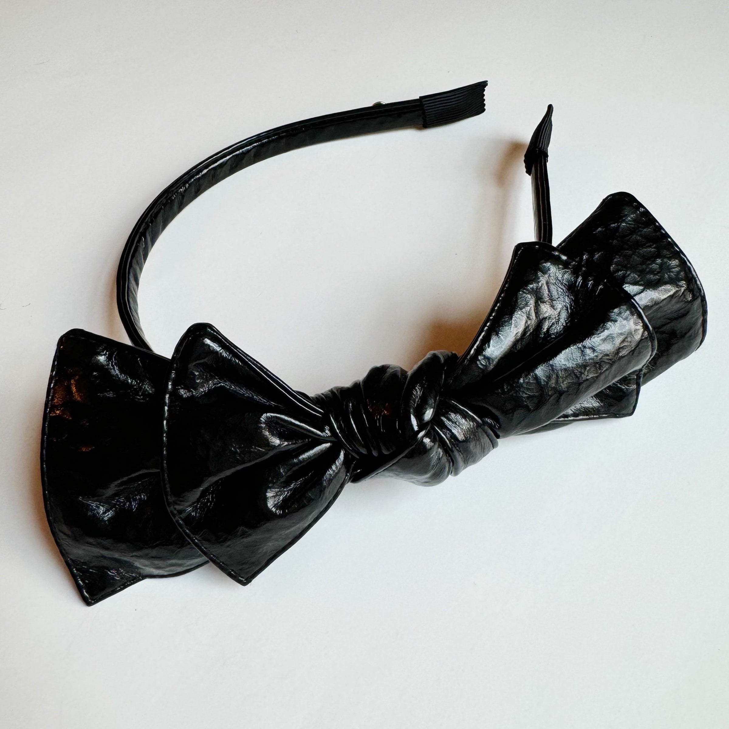 This patent double bow headband features a unique double bow design, adding a touch of elegance to any outfit. The patent material ensures a sleek and polished look, making it the perfect accessory for any occasion. Elevate your style with this trendy and versatile headband.
