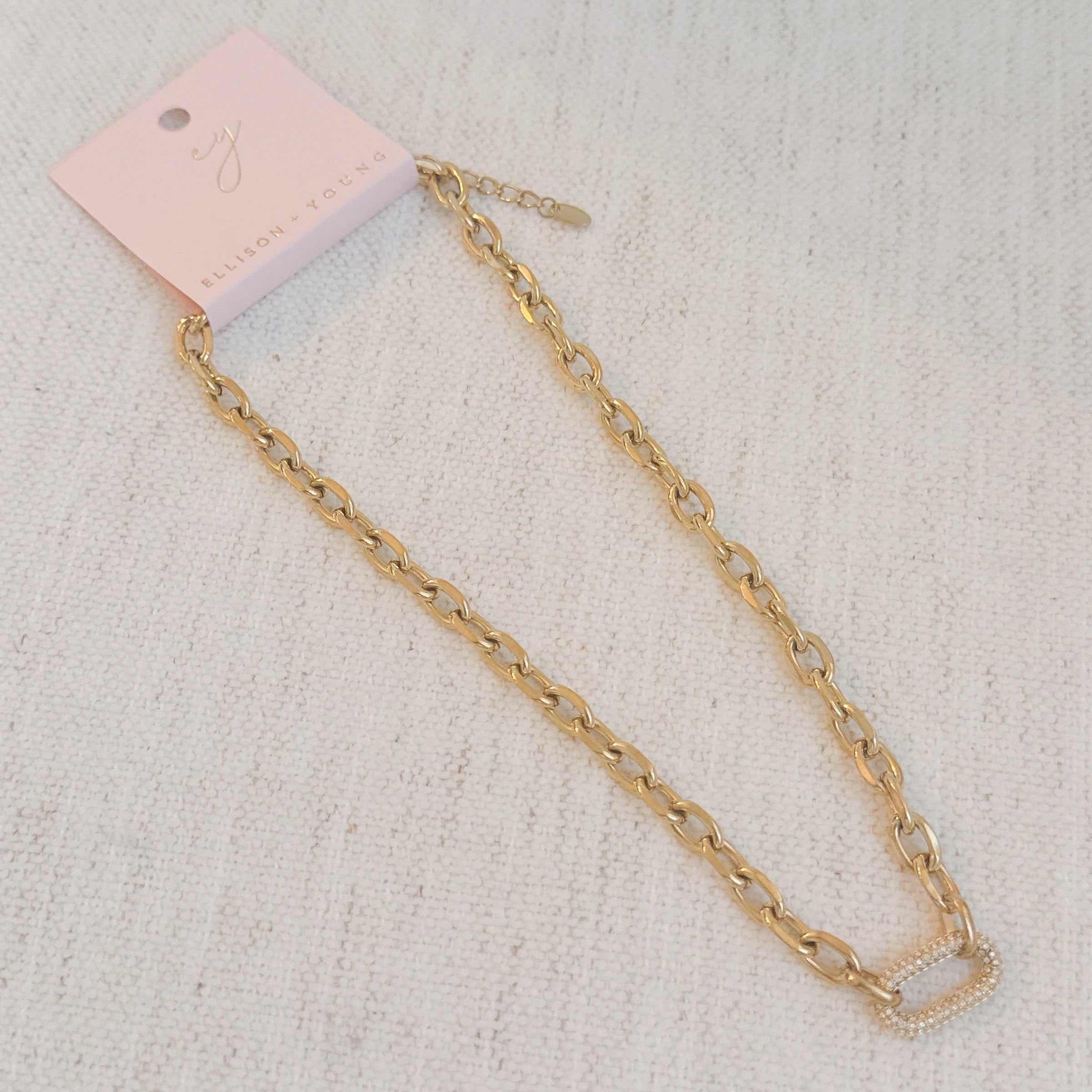 Indulge in modern luxury with the Pave Lock Chain Necklace. This striking piece features an edgy lock and chain design that exudes sophistication and uniqueness. Perfect for dressing up or down, this versatile accessory adds a touch of glamour to any outfit.